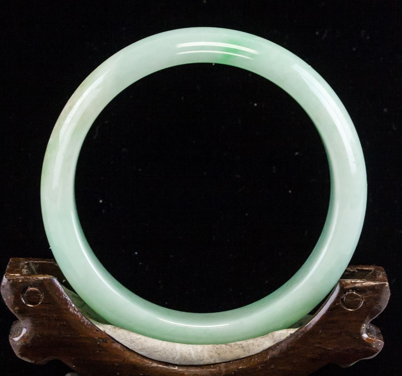 Burma green jadeite carved bangle. Of round outside and flat inside. Of mixed pale green and apple green tone. Accompanied with certificate. Inner Diameter: 53 mm, Outer Diameter: 66 mm, 47.12 grams, Density: 3.33