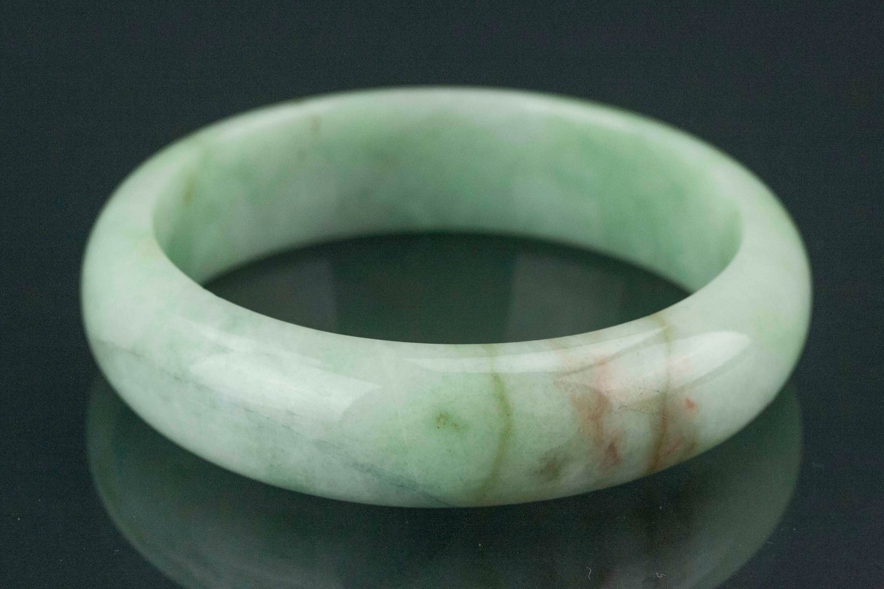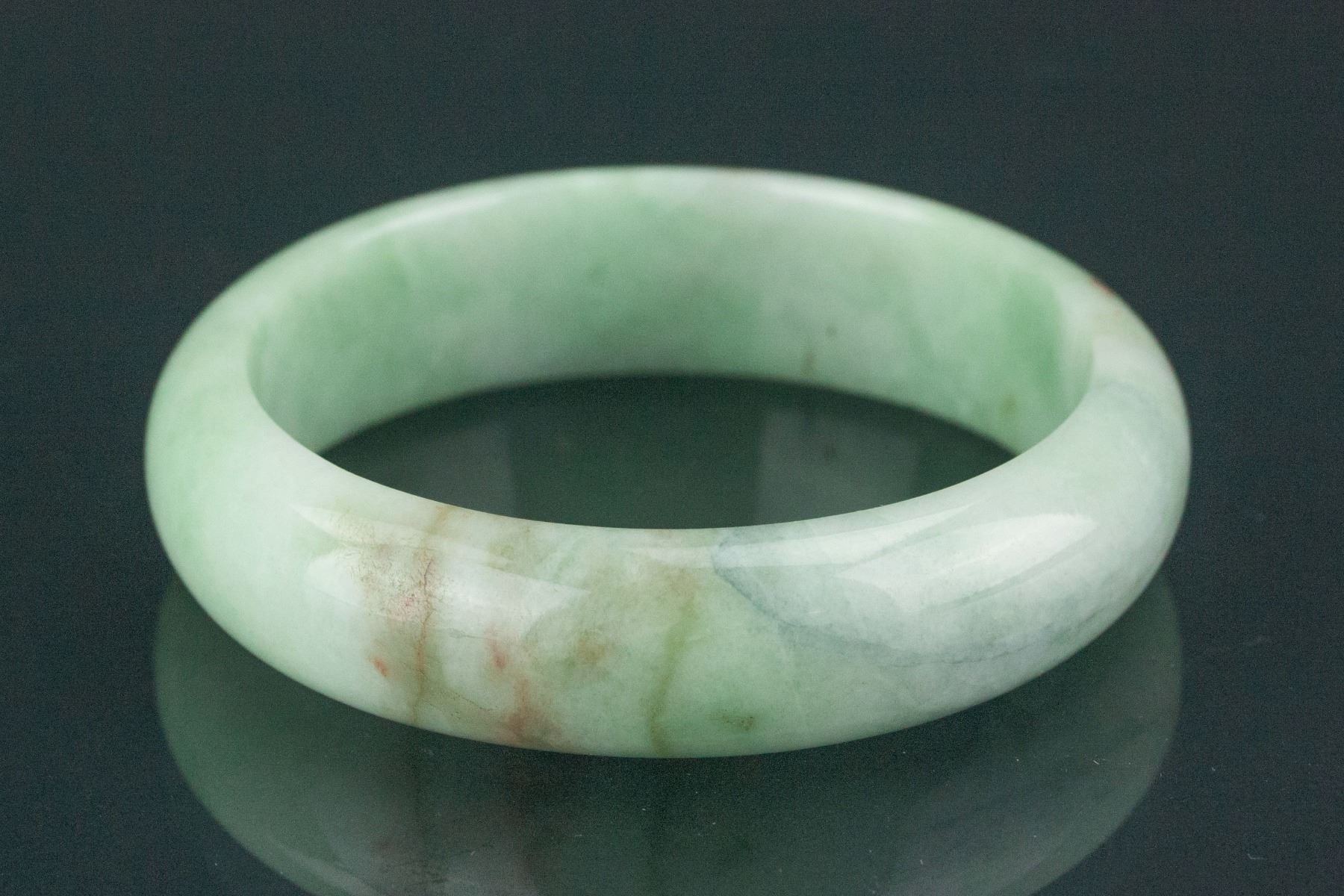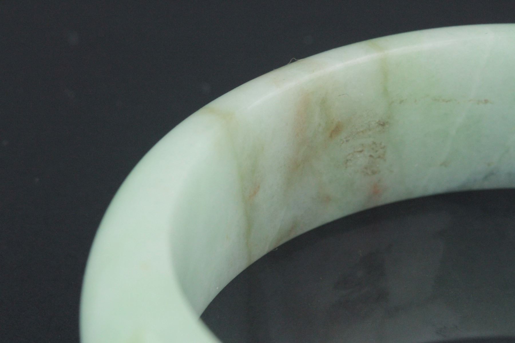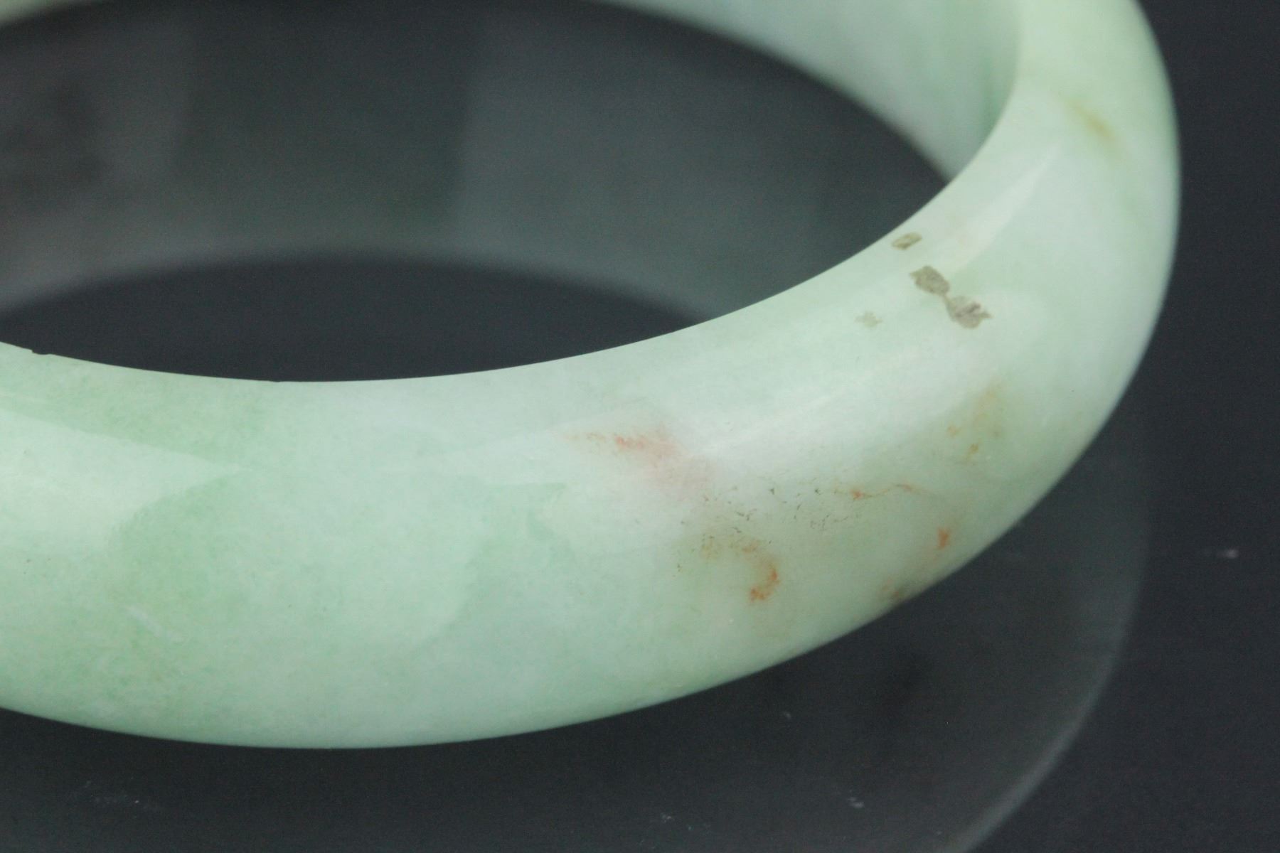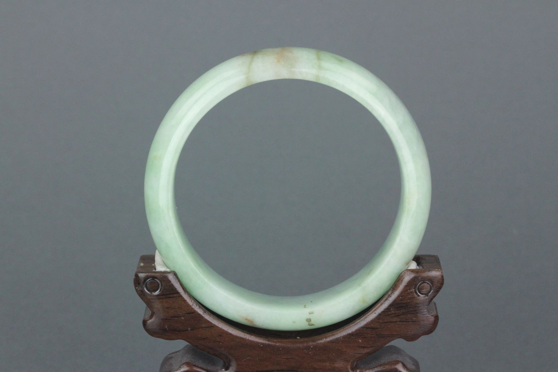 Burma jadeite carved bangle; rounded outside and flatten inside; of apple green tone with spinach green vein; D: 7.2 cm, 67 grams, density: 3.31