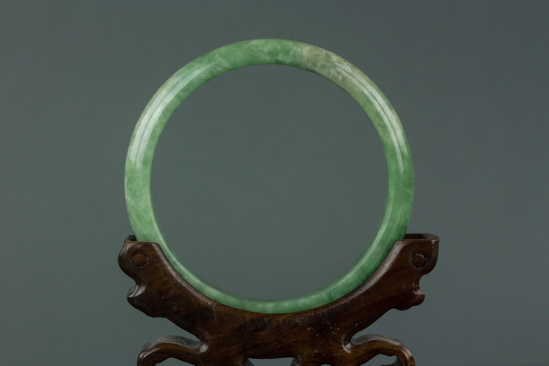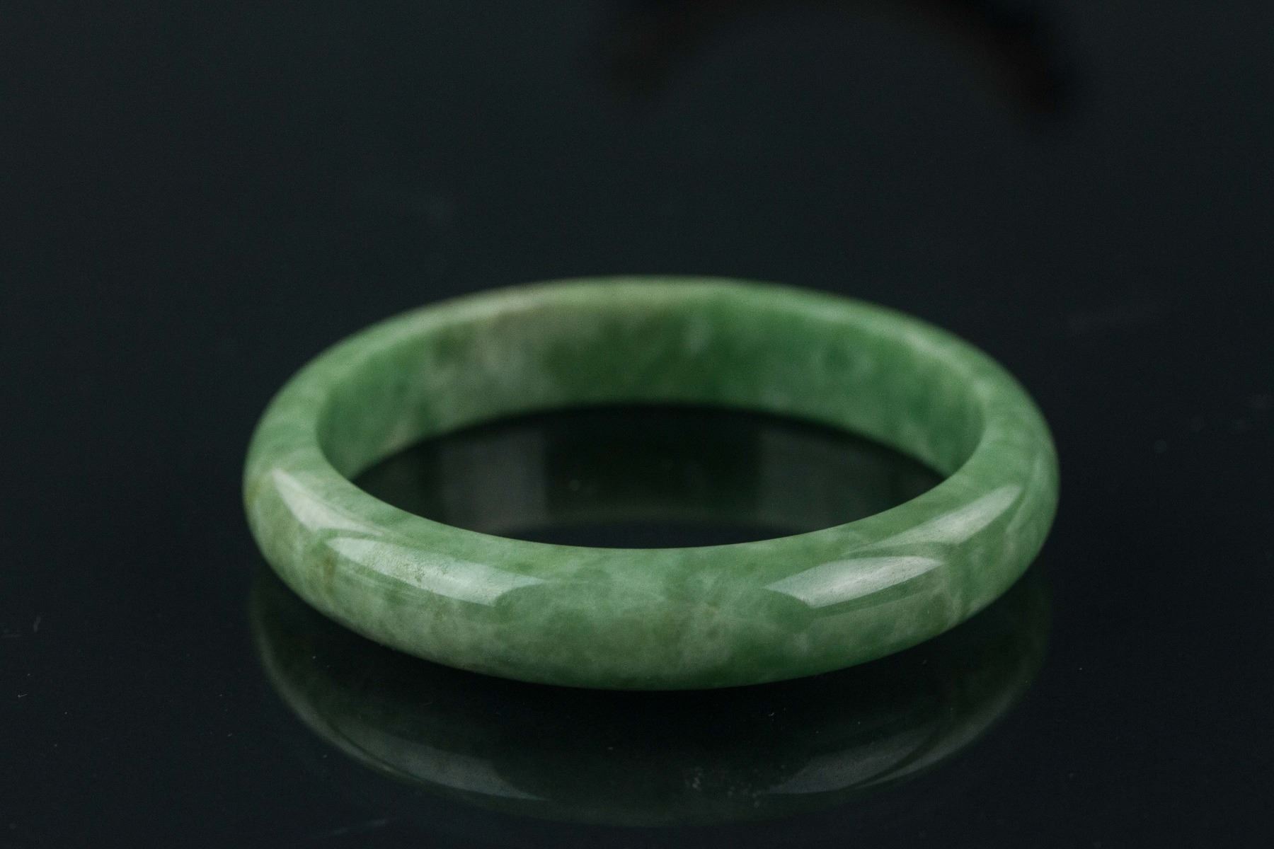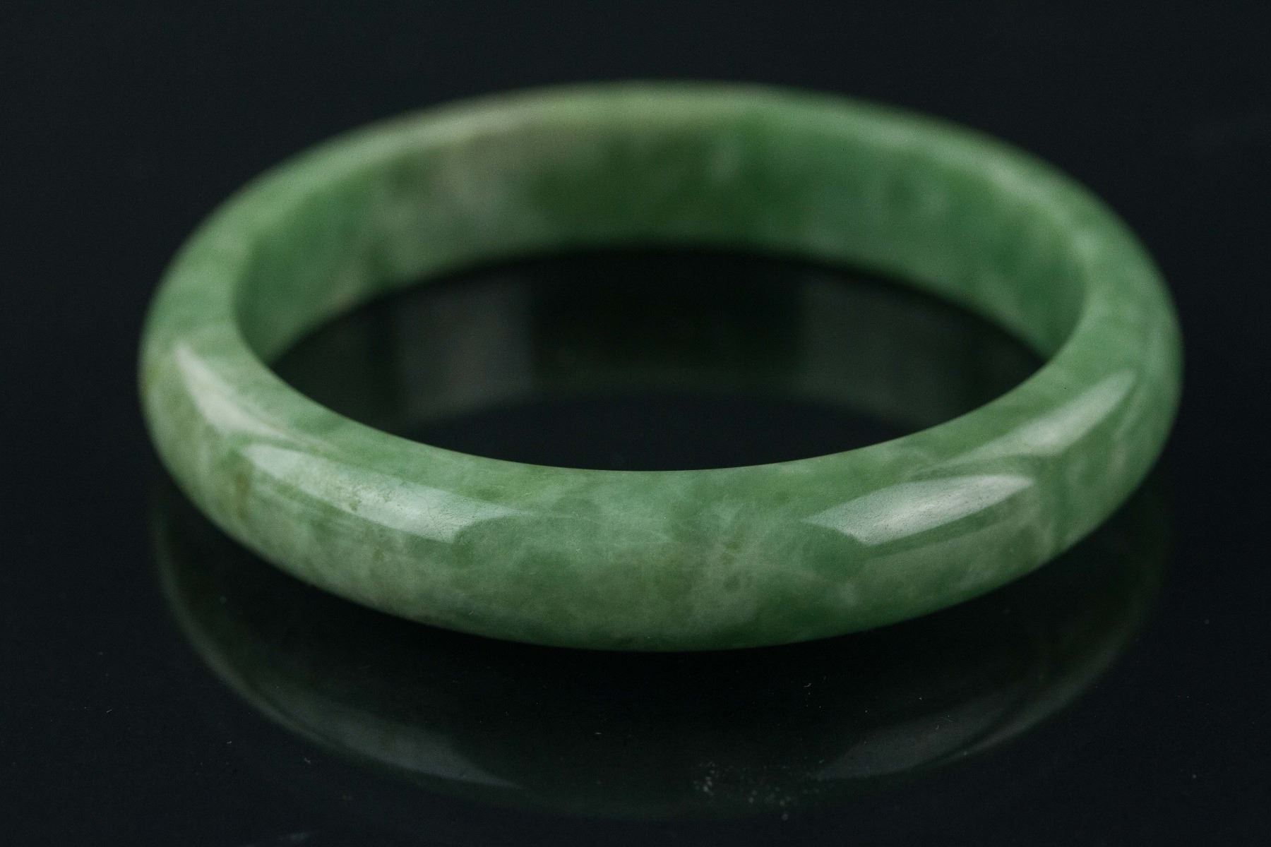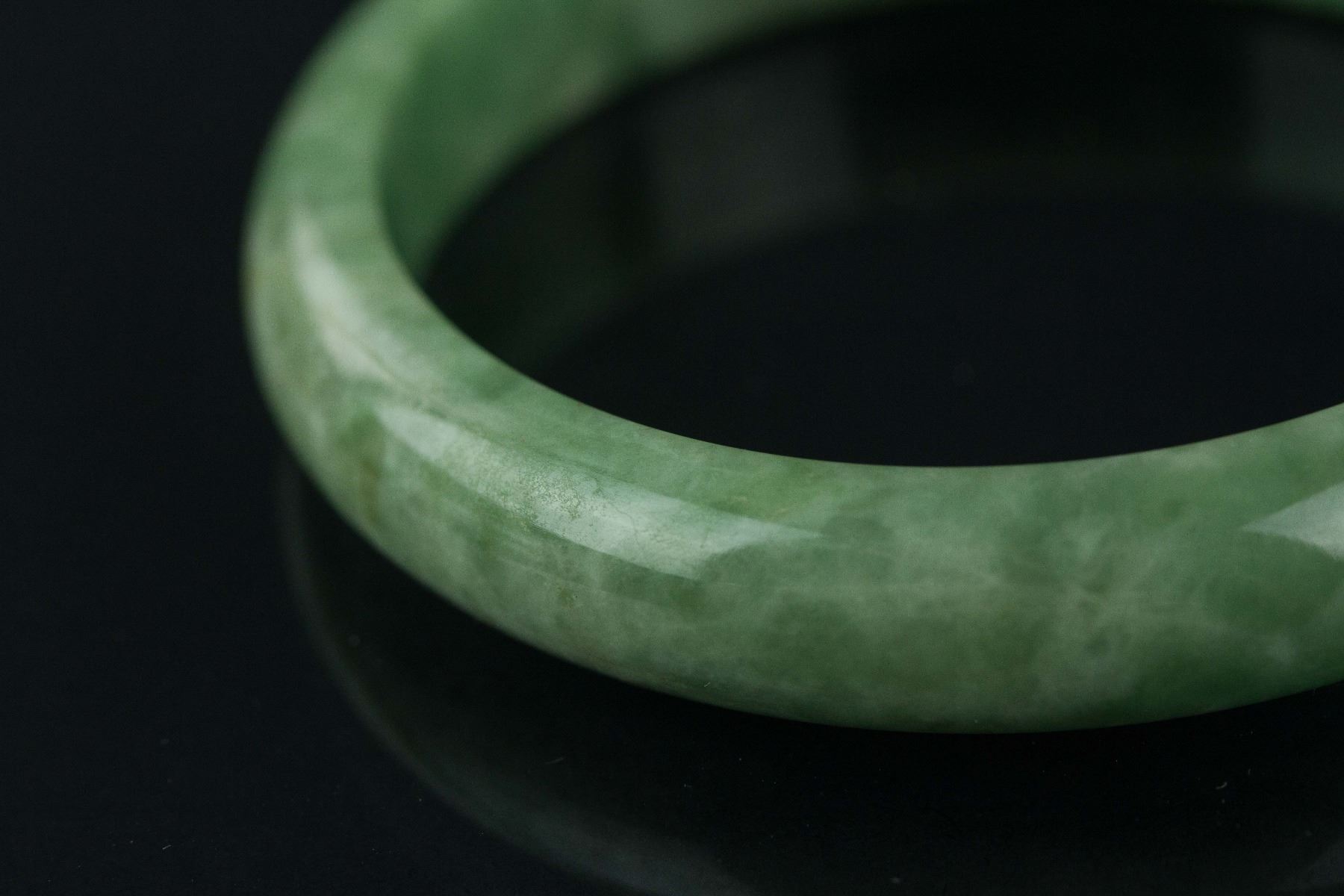 Burma fine green jadeite bangle; of mottled green tone; rounded outside and flatten inside; H: 1.3 cm, D: 6.9 cm, Inner D: 5.8 cm, 38 grams, Density: 3.12
