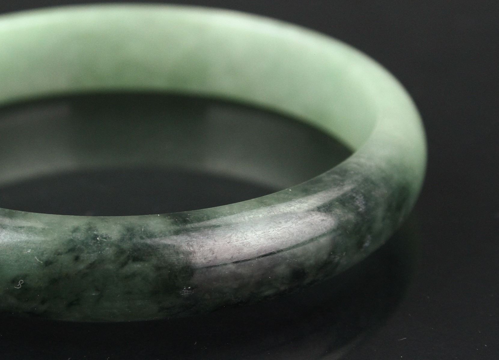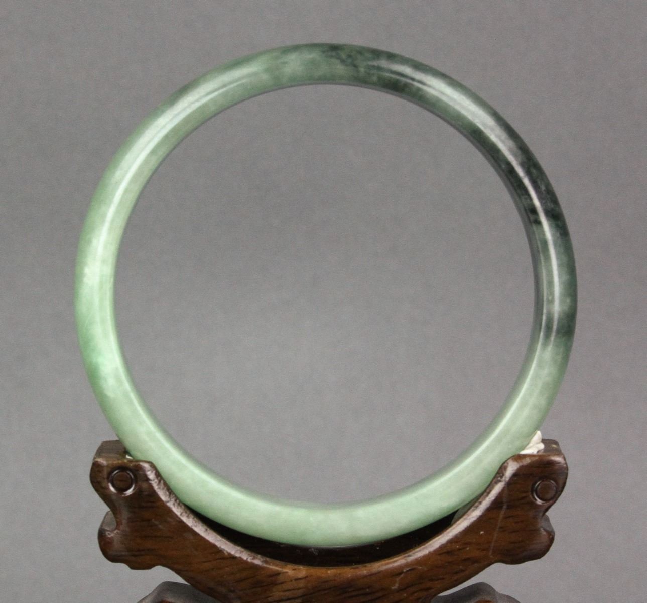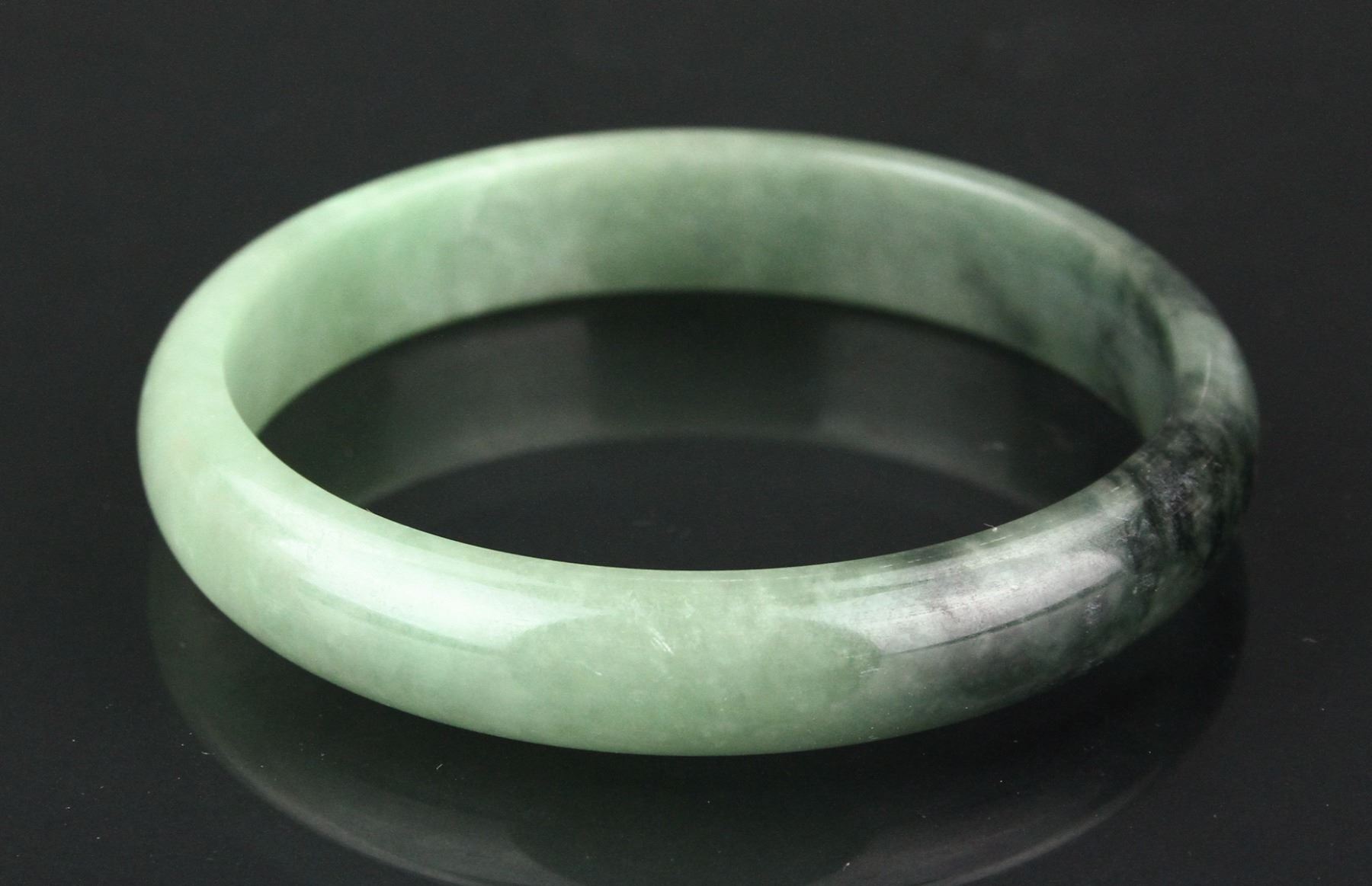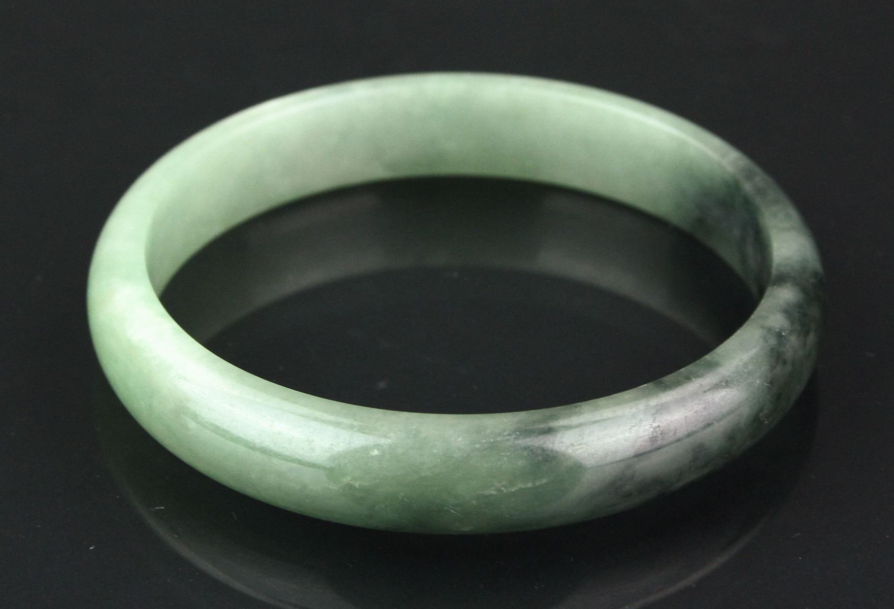 Burma green jadeite bangle; rounded outside and flatten inside; D: 8 cm, 57 grams; Density: 3.21