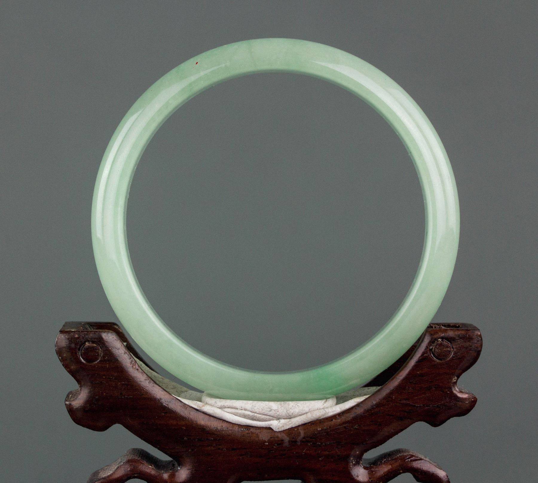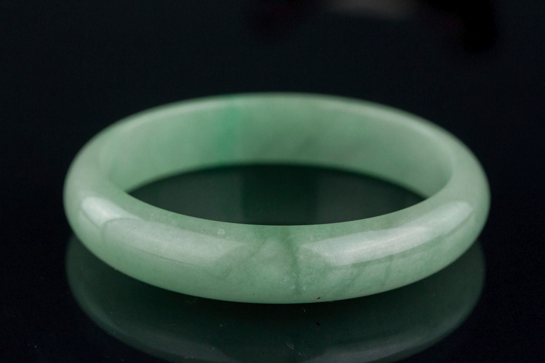 Burma green jadeite carved bangle; of rounded outside and flatten inside; of pale green tone; D: 5.6 cm, W: 1.1 cm, 38 grams, Density: 3.30
