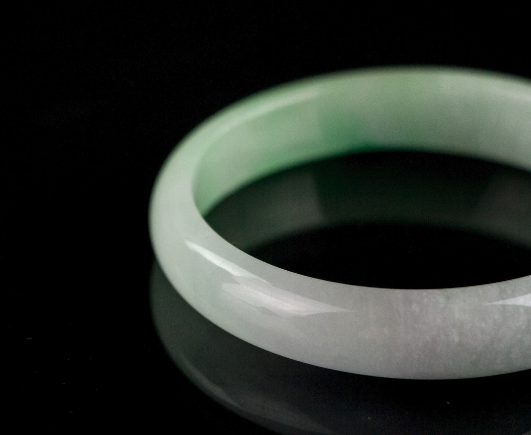 Burma green jadeite carved bangle; of rounded outside and flatten inside; of pale green tone with apple green tinge; D: 5.4 cm, W: 0.7 cm, 35 grams, Density: 3.28