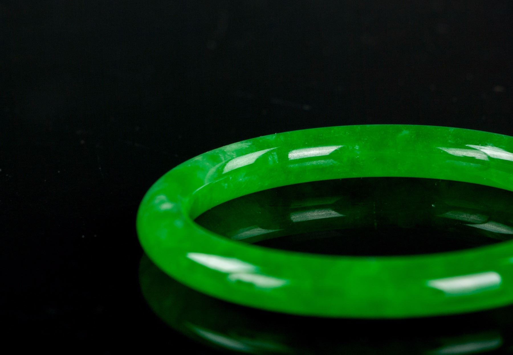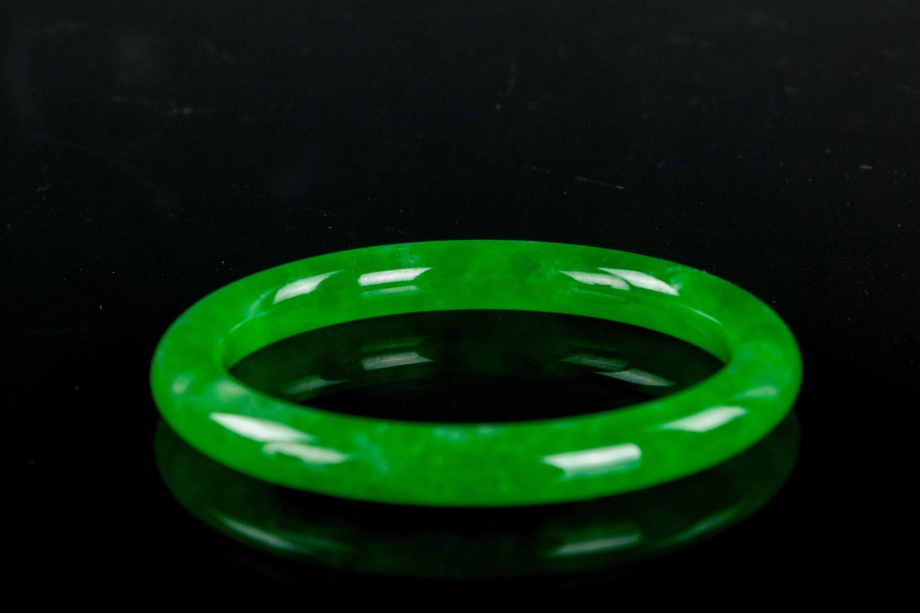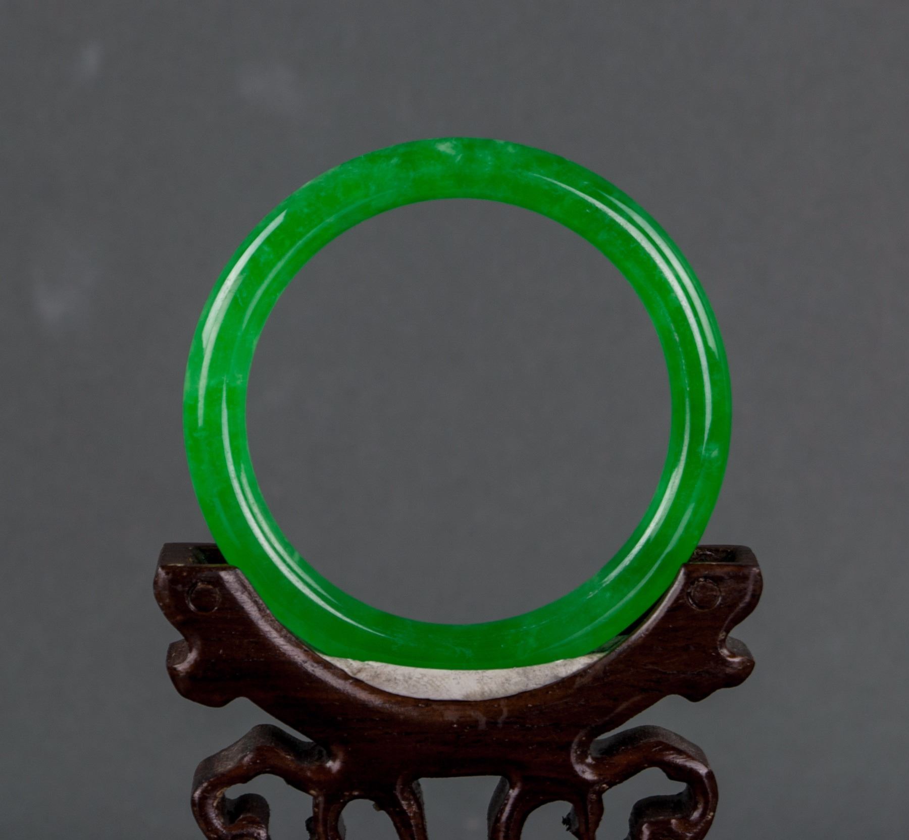 Burma green jadeite carved bangle; of rounded outside and inside; of emerald green tone; D: 5.7 cm, W: 0.7 cm, 35 grams, 3.31