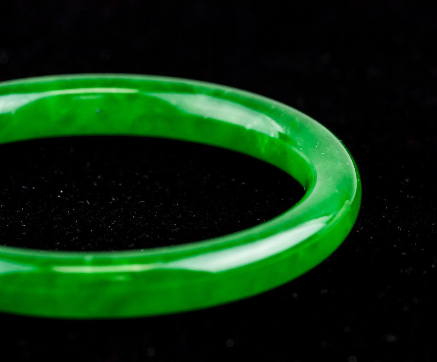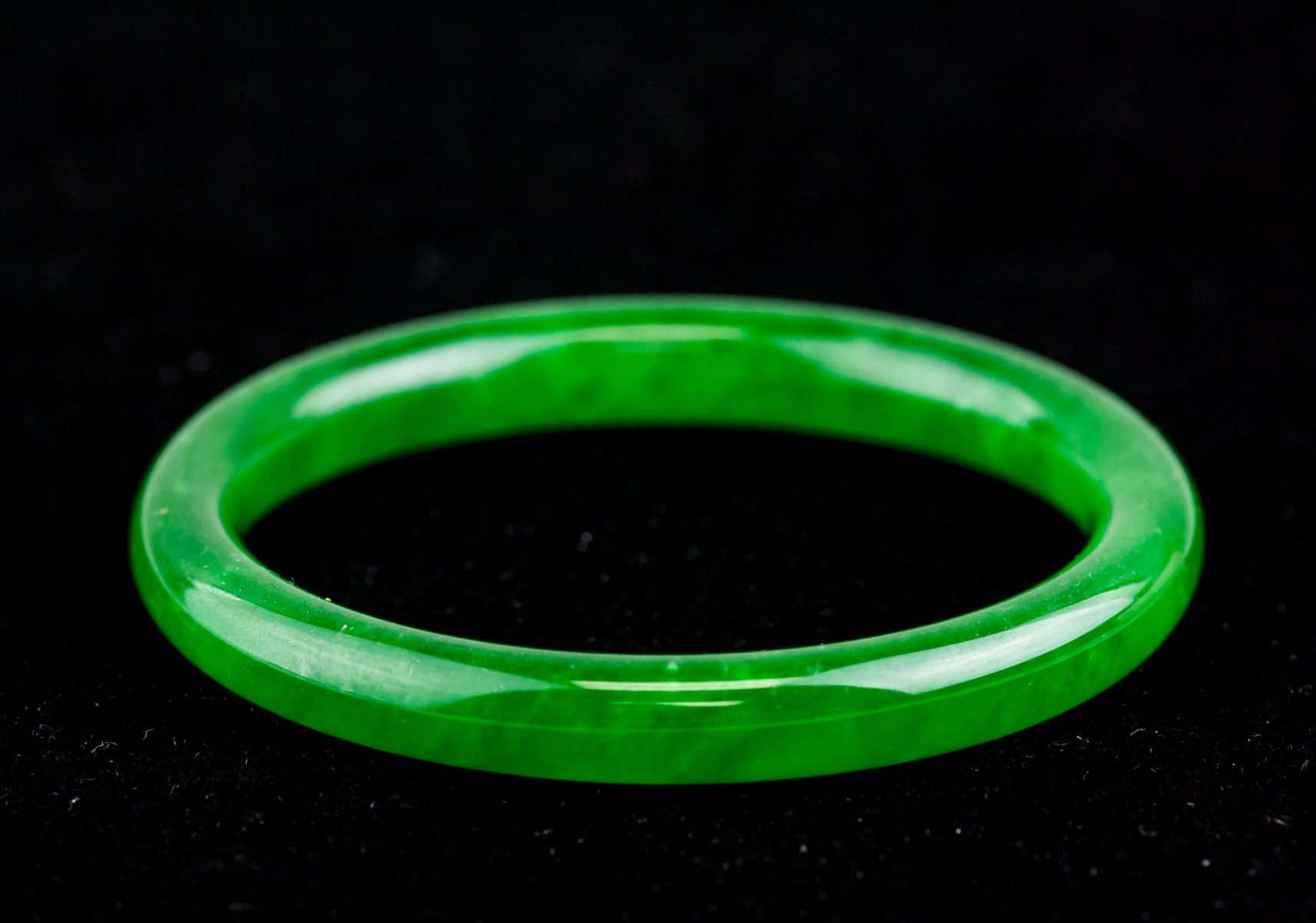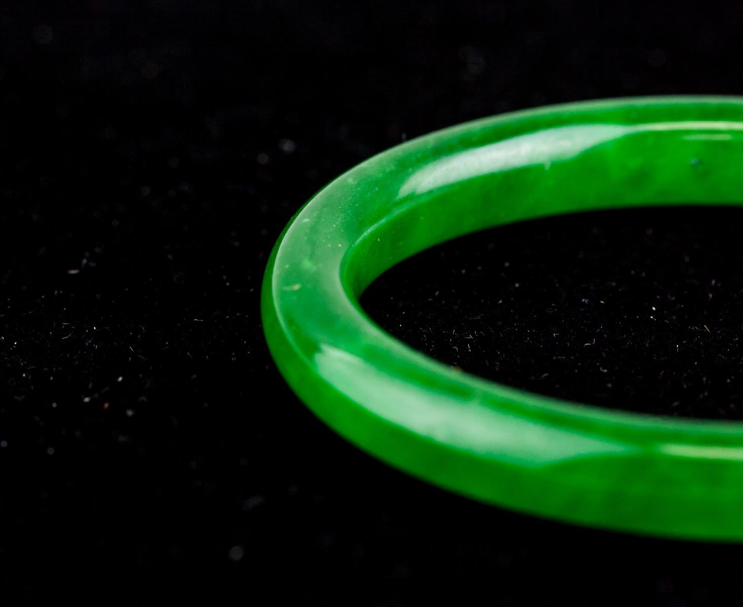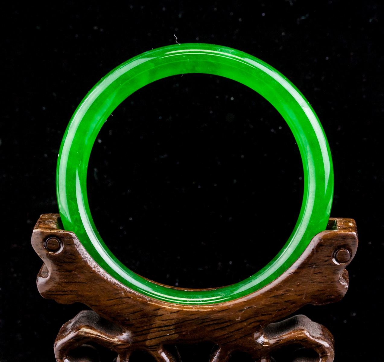 Burma green jadeite carved bangle. Of rounded outside and inside. Of emerald green tone. OD: 67.6 mm, ID: 53.2 mm, 29 grams, density: 3.31