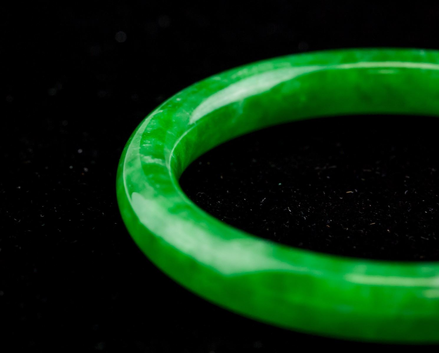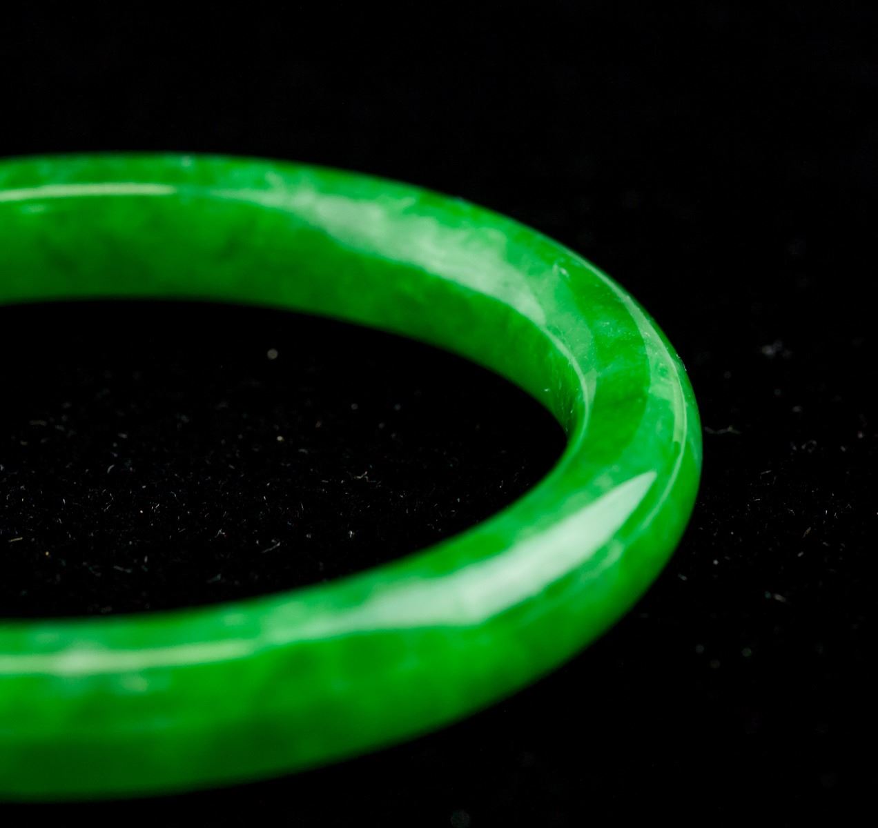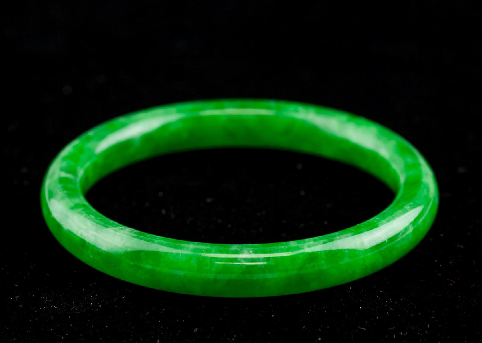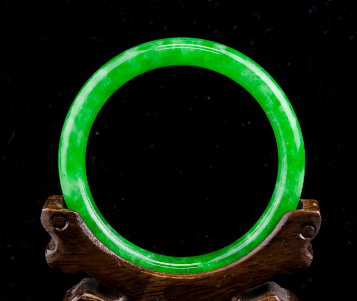 Burma green jadeite carved bangle. Of rounded outside and inside. Of emerald green tone. OD: 70.4 mm, ID: 54.8 mm, 35.3 grams, density: 3.29