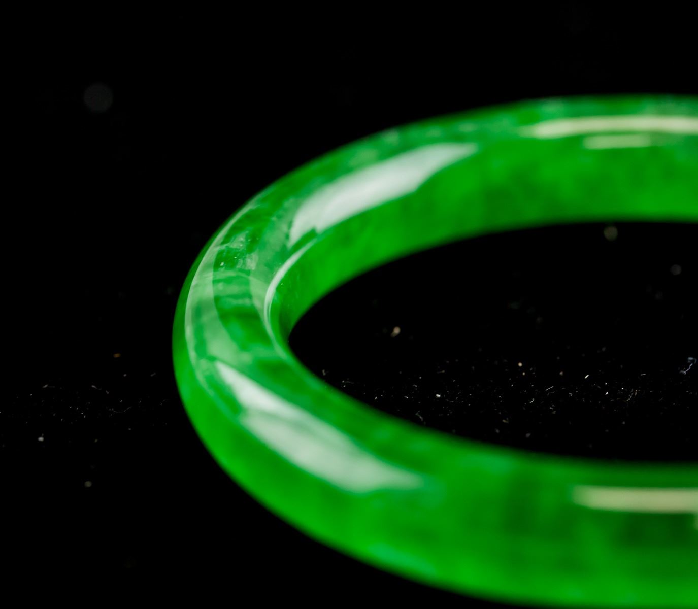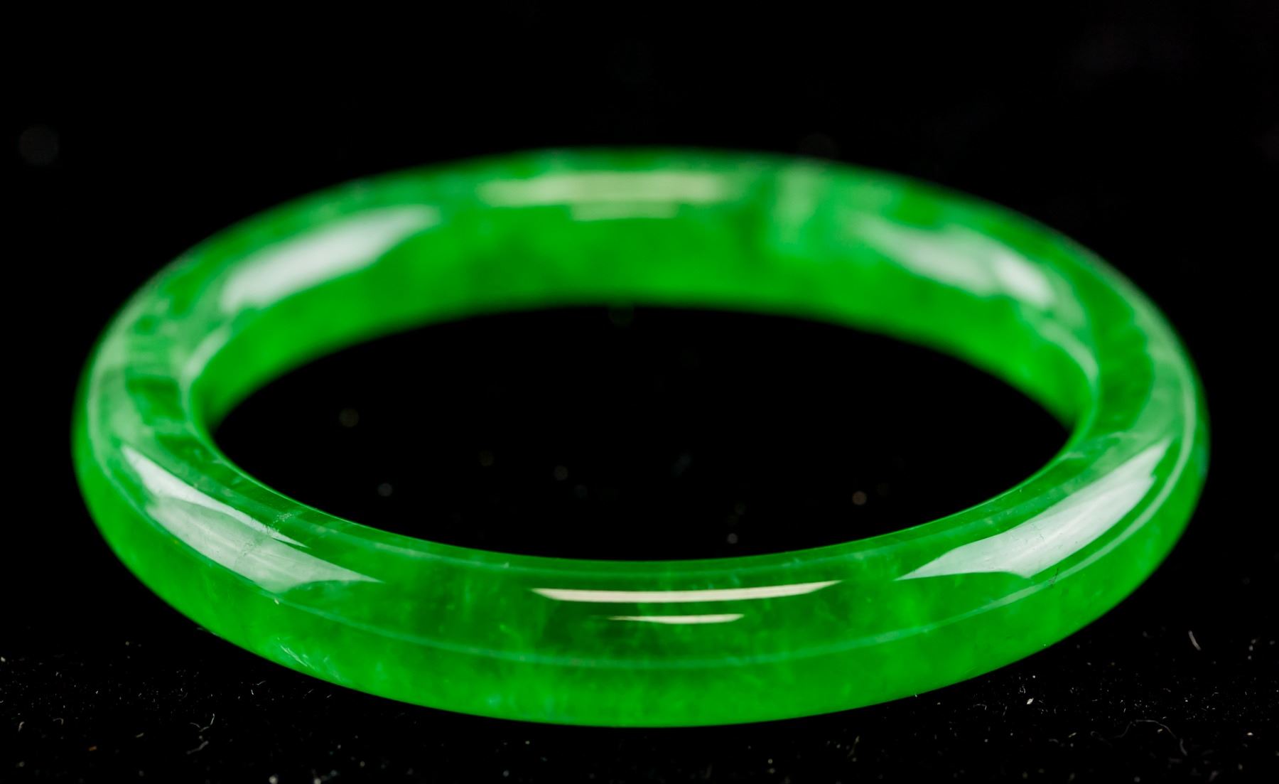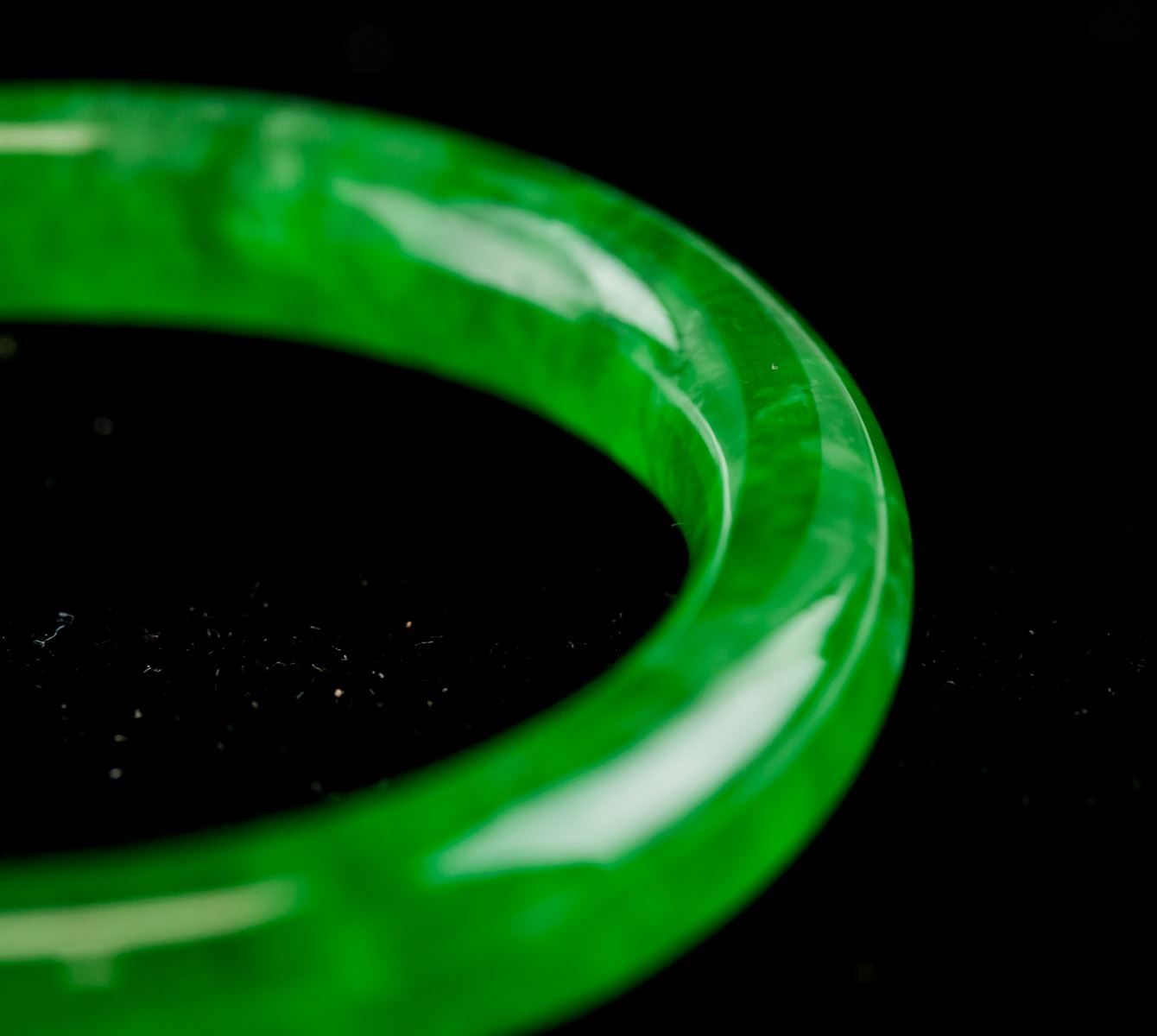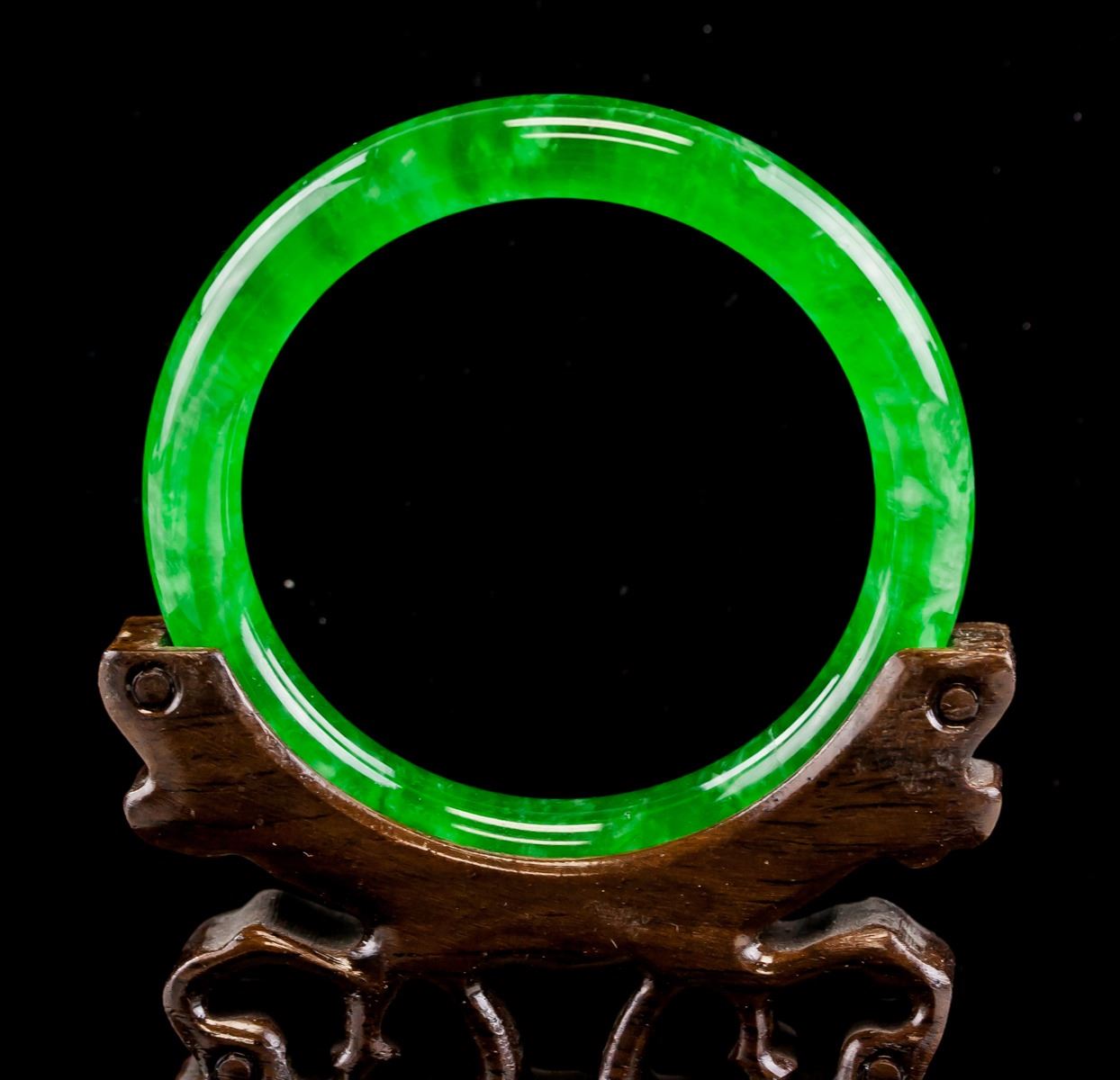 Burma green jadeite carved bangle. Of rounded outside and inside. Of apple green tone. D: 54.58 mm, 43.54 grams, Density: 3.31