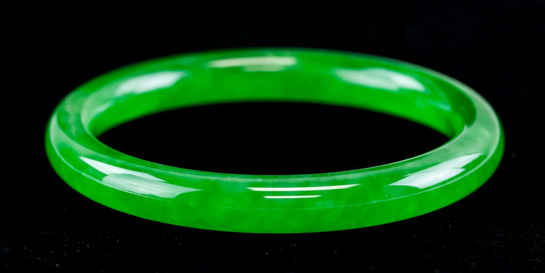 Burma green jadeite carved bangle. Of round outside and inside. Of apple green tone. Inner Diameter: 5.5 cm, Outer Diameter: 7 cm, 32.3 grams, Density: 3.3