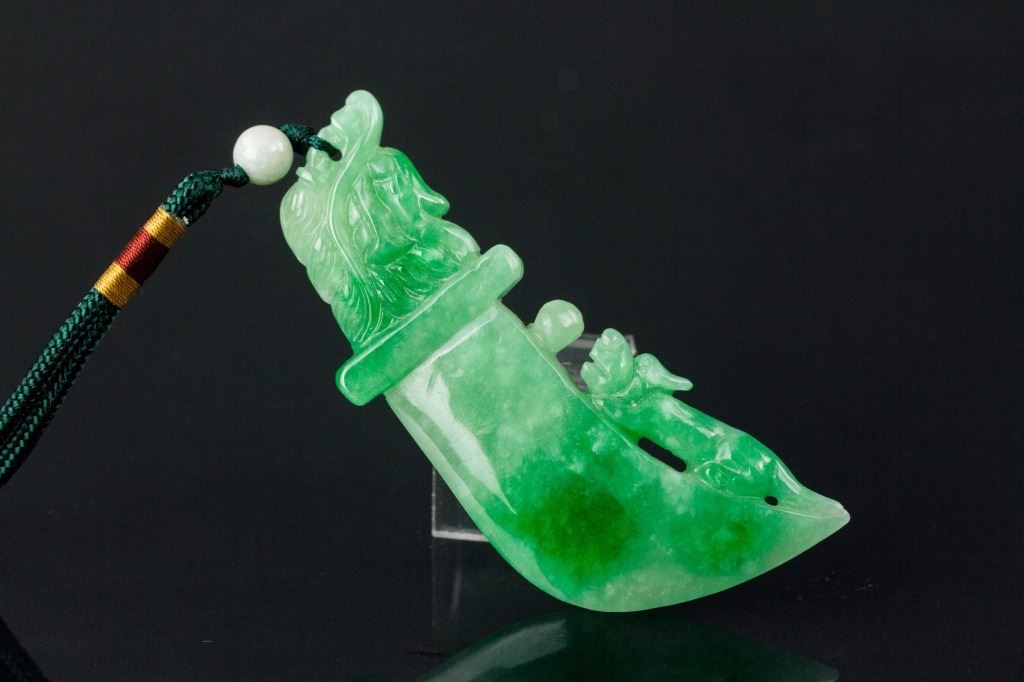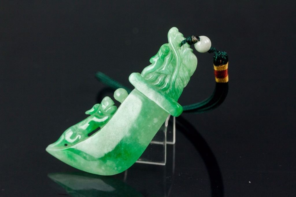 Burma green jadeite pendant; carved in knife form; pierced for suspension; of pale green tone with apple green tinge; 9 cm x 4.5 cm x 14 (strap), 52 grams, Density: 3.06