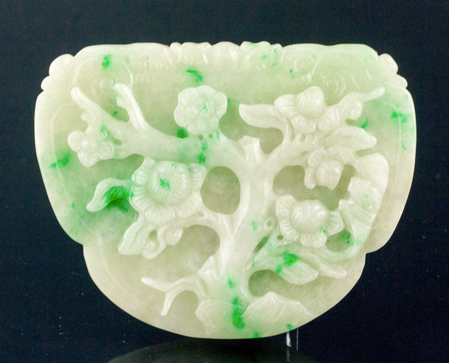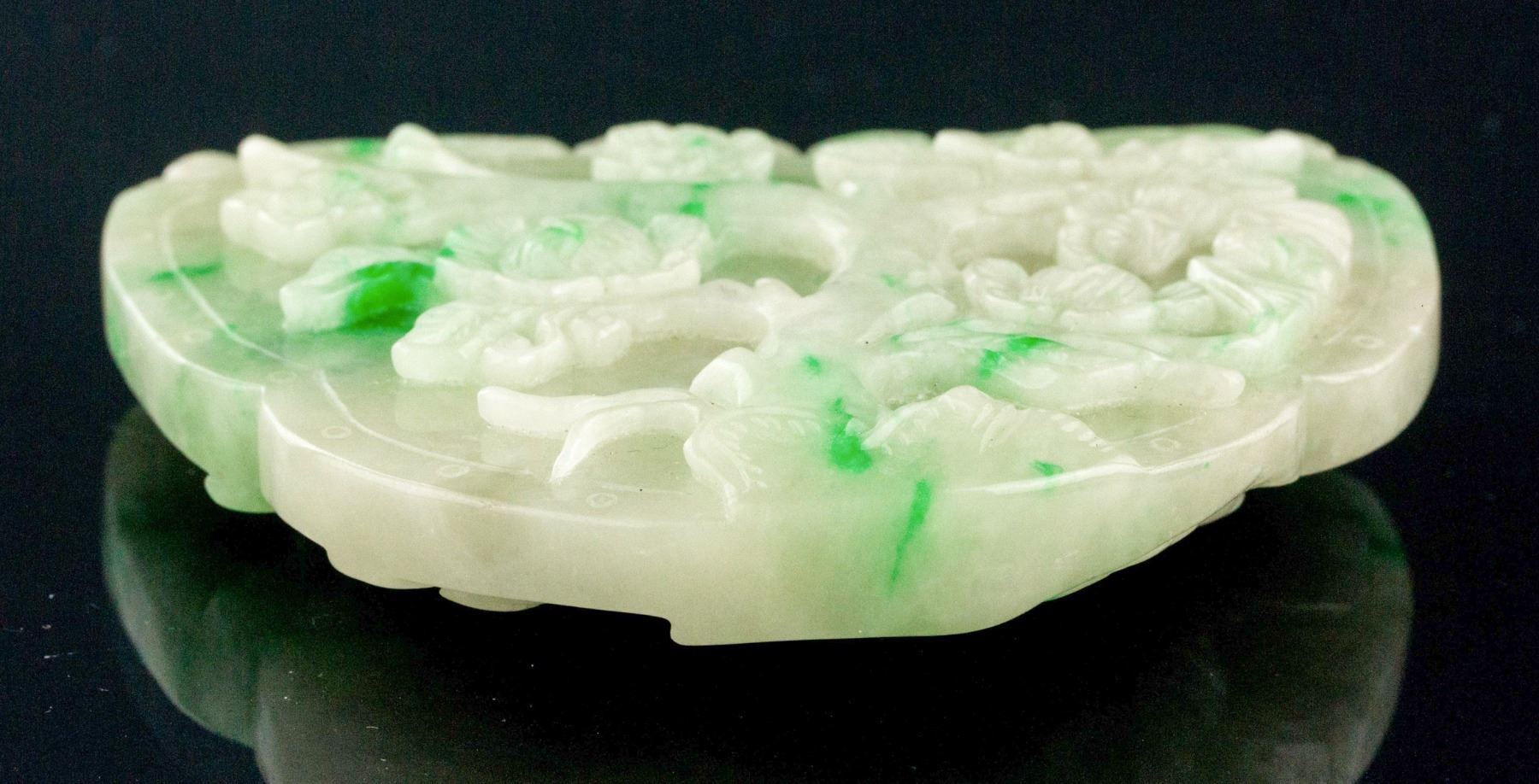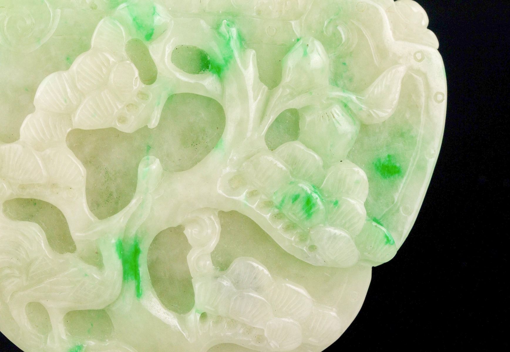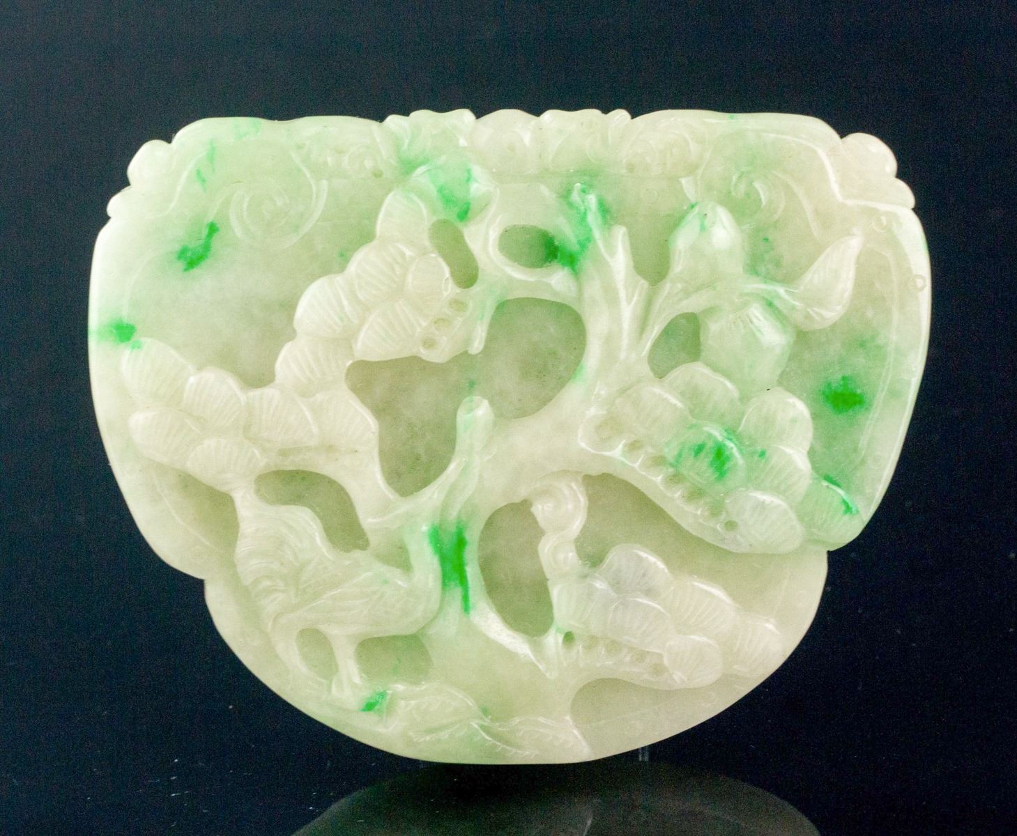 Burma green jadeite carved toggle; of semi-sphere form; carved with pine tree and crane; of pale green tone and apple green tinge; H: 7 cm, W: 9.5 cm, 220 grams, Density: 3.21