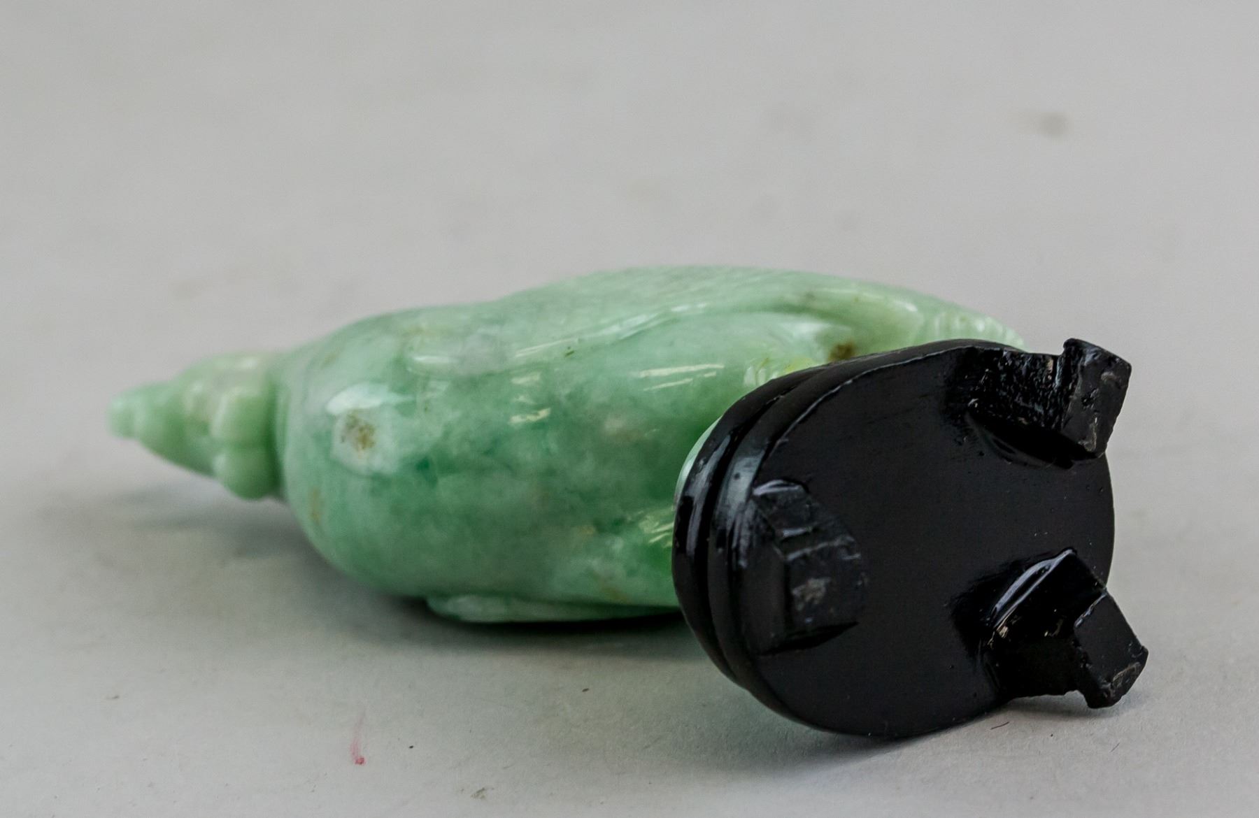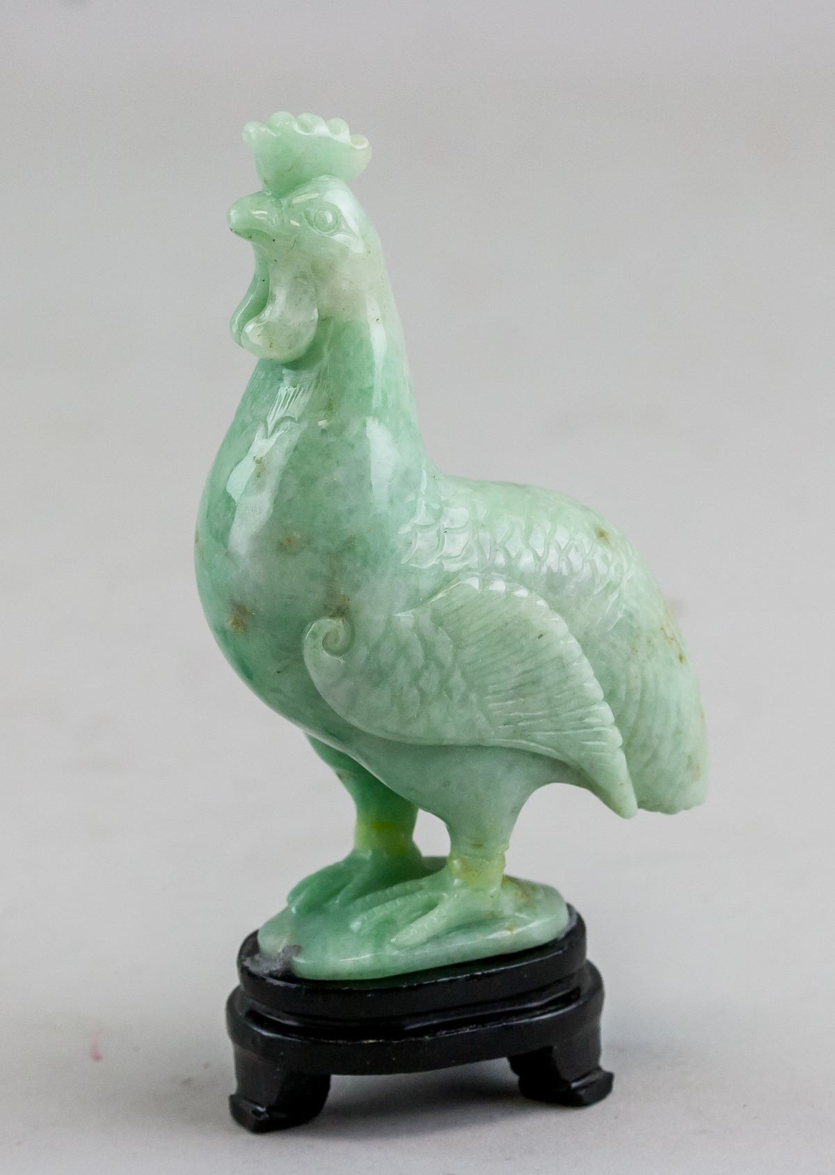 Burma green jadeite carved statue. Featuring standing rooster. With wood stand. 9 x 5 cm, 84 grams (with stand)