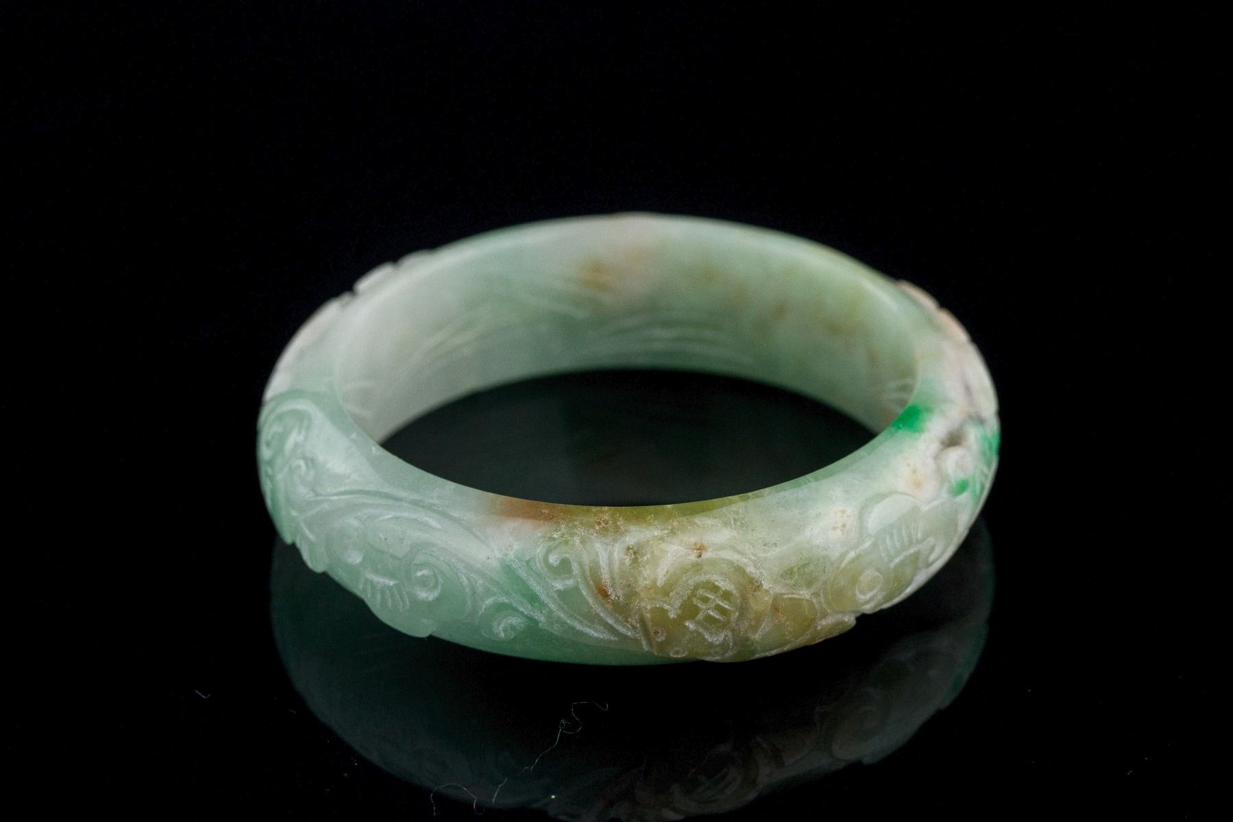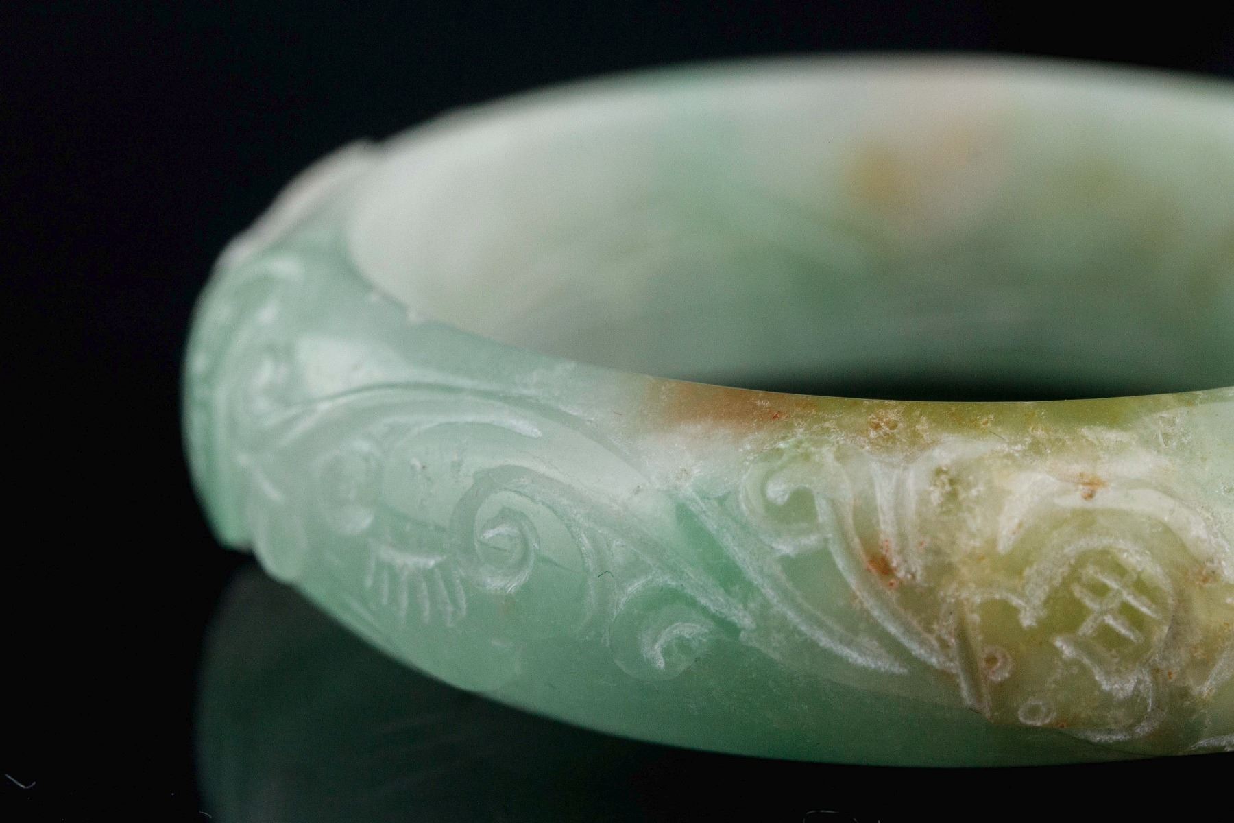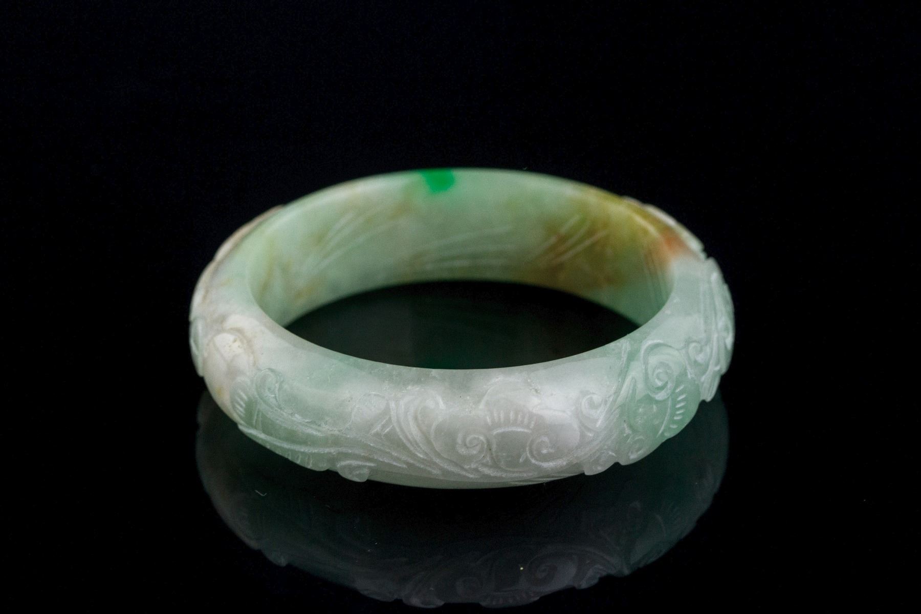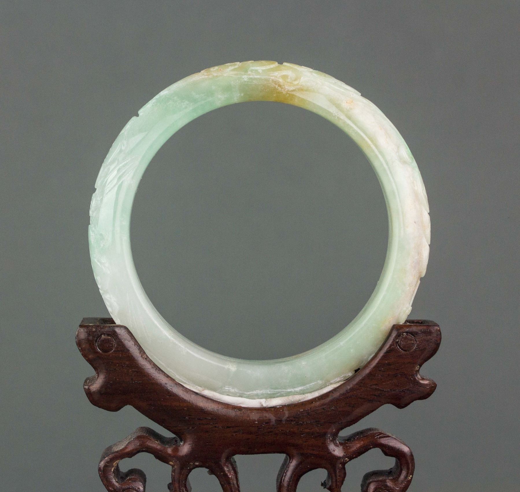 Burma green jadeite carved bangle; of rounded outside and flatten inside; outside carved ruyi pattern; of pale green tone with apple green and brown tinge; D: 5.7 cm, W: 1.7 cm, 72 grams, Density: 3.24