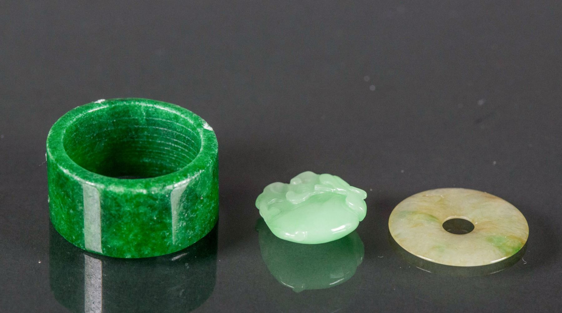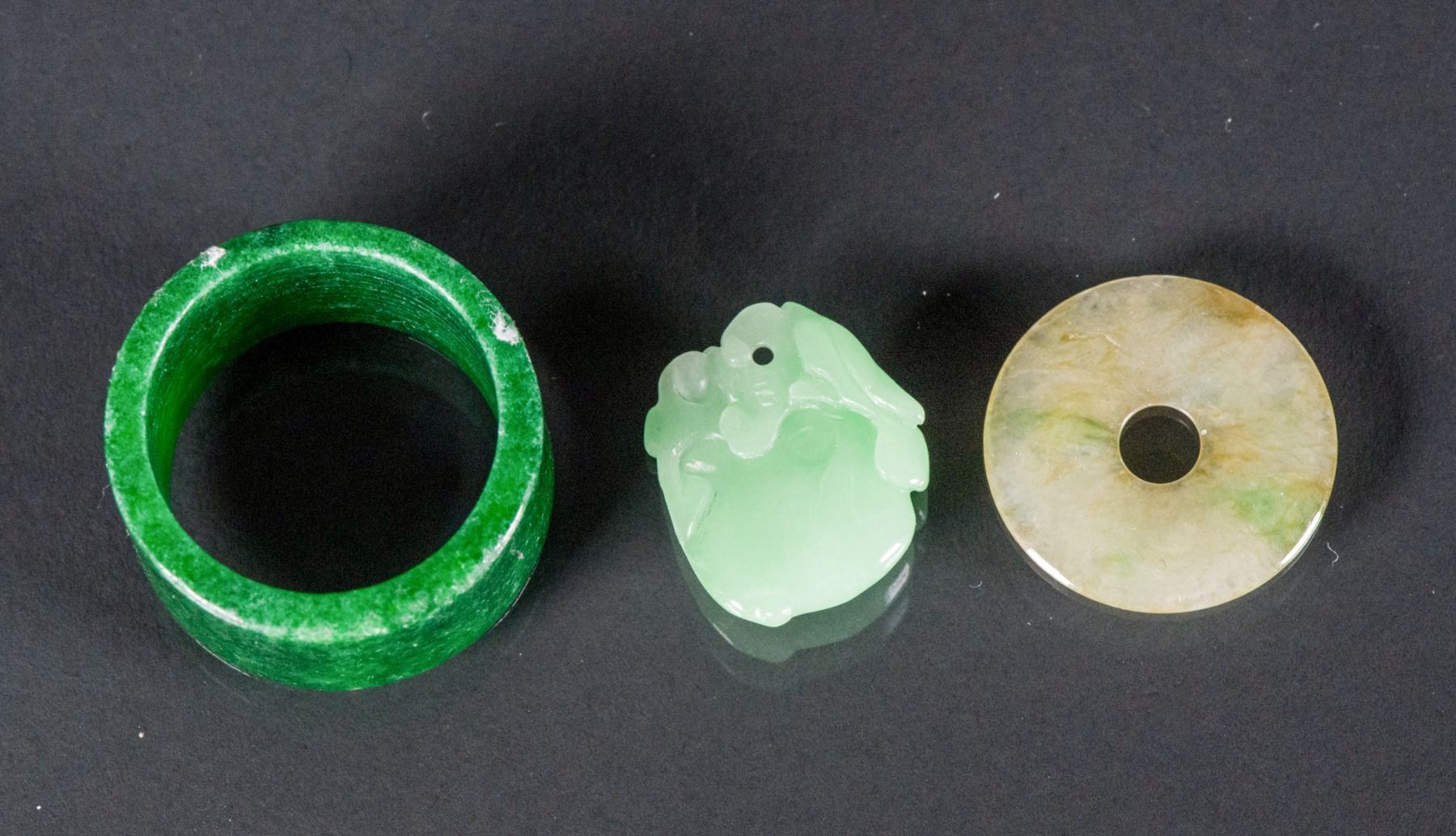 Three (3) assorted Burma green jadeite pendants, comprised of an apple green fruit pendant, a celadon green bi disc and a emerald green ring, D: 2.5 cm, 11 grams total, densities: 3.25 (green ring); 3.40 (disc), 3.19 (fruit)