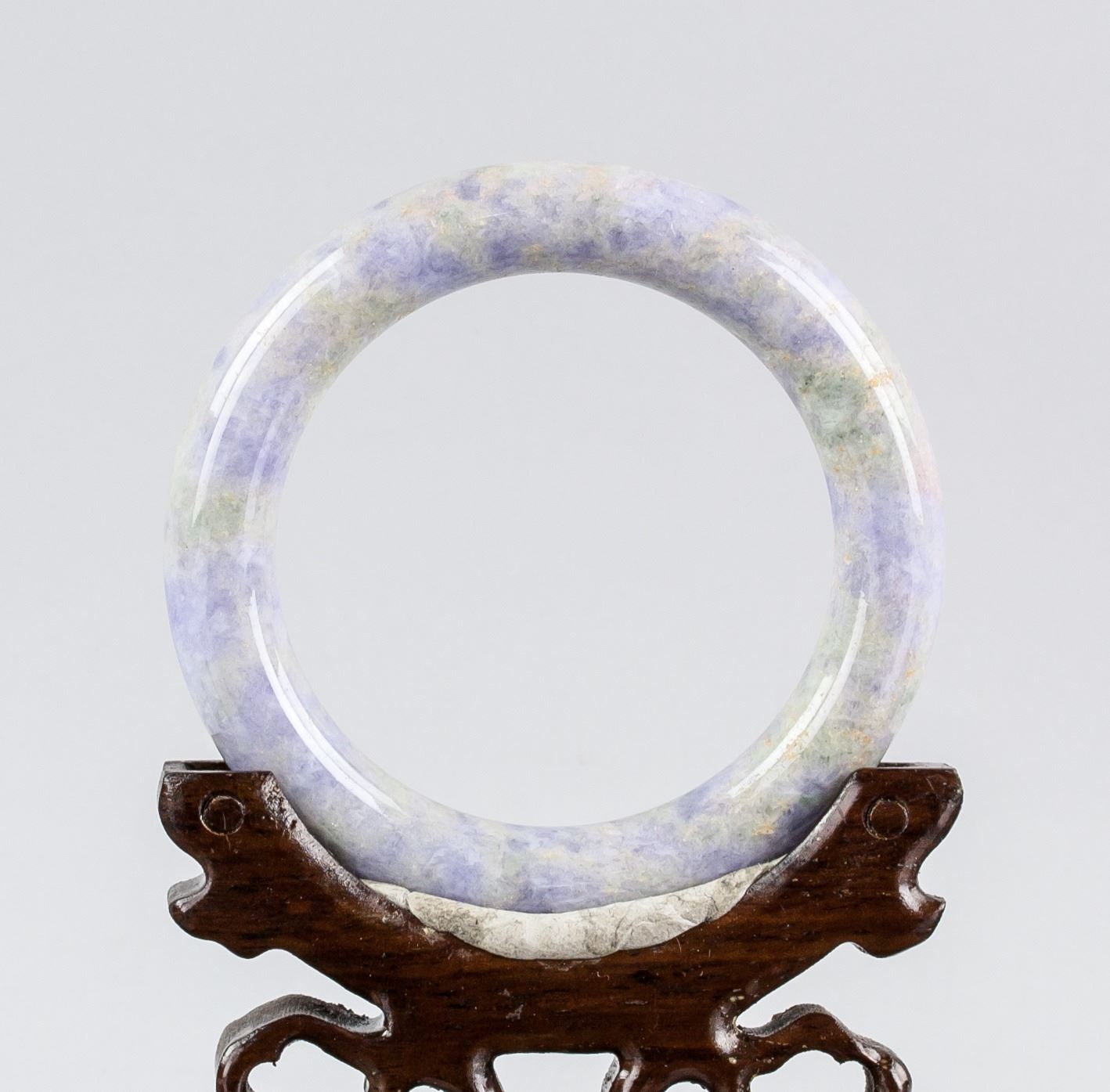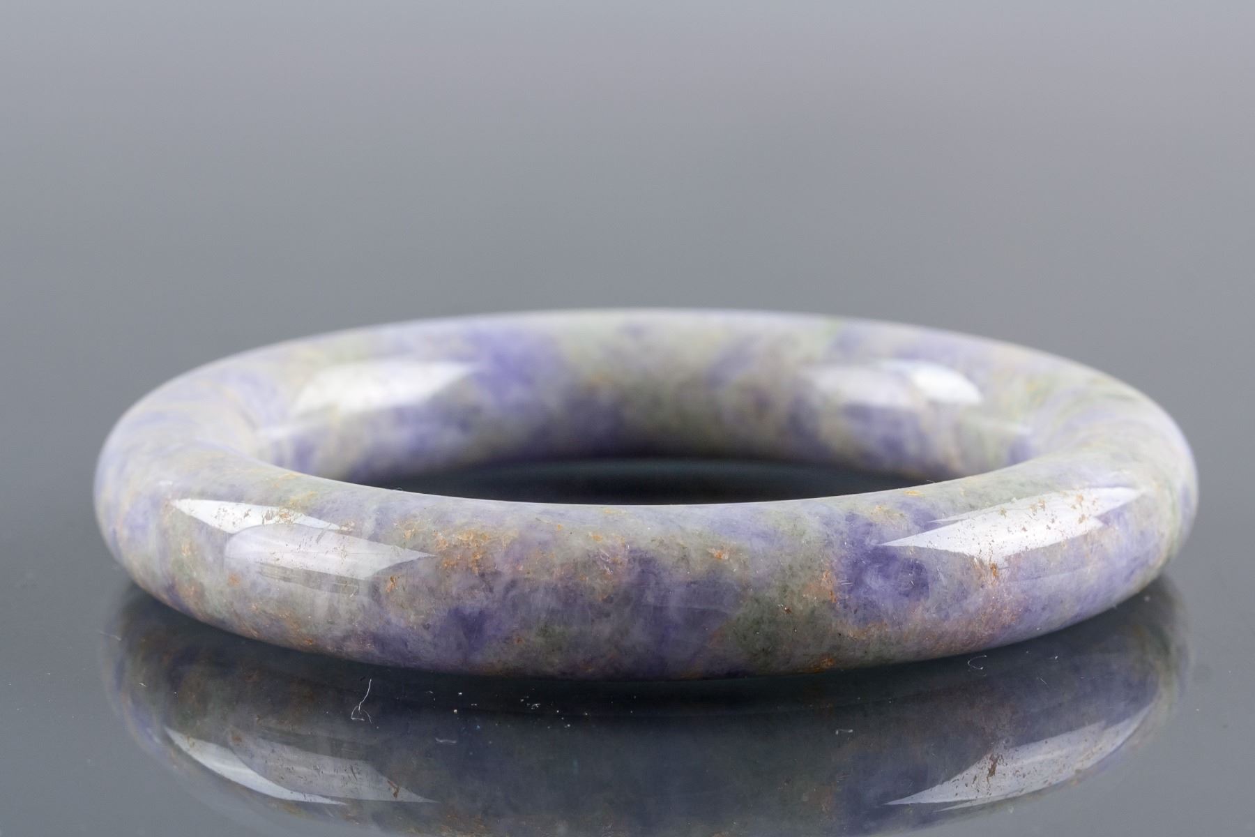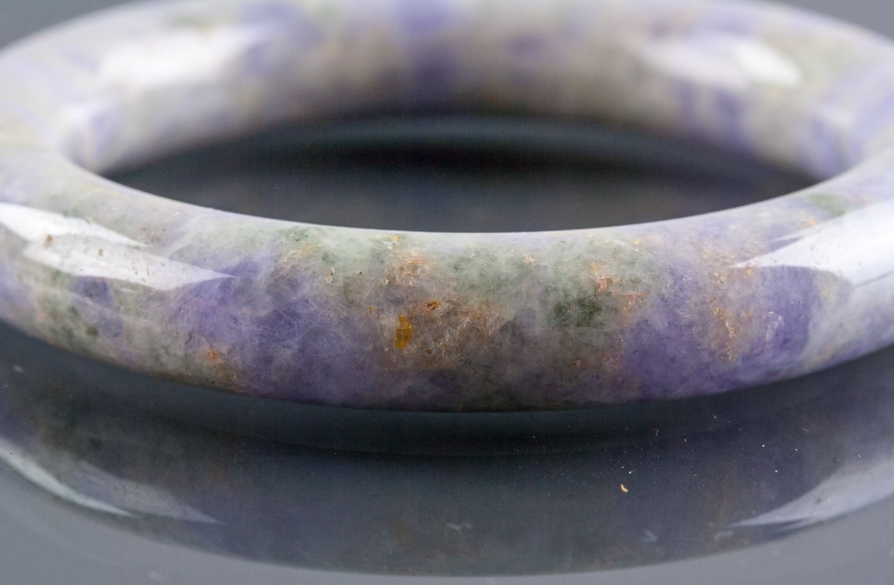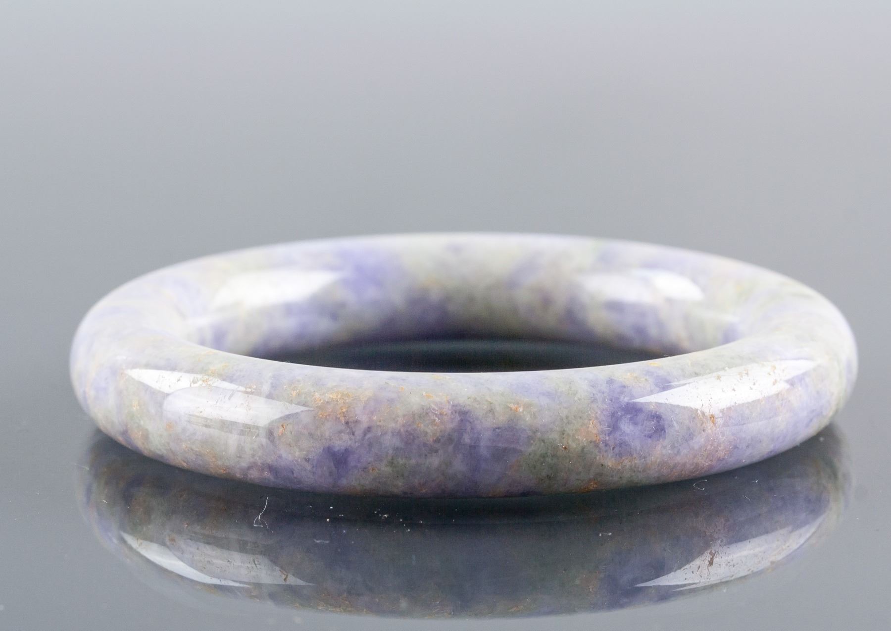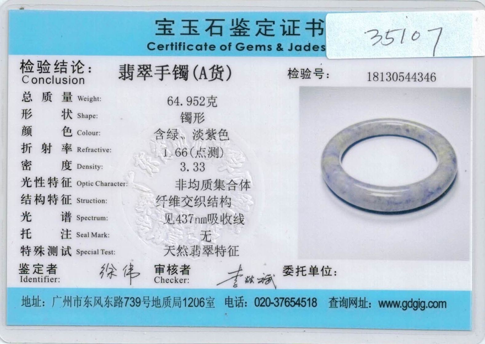 Burma green and lavender jadeite carved bangle, of round outside and inside, of mixed green and lavender tong, with Grade A certification, Inner Diameter: 5 cm, Outer Diameter: 6.5 cm, 64 grams, Density: 3.33