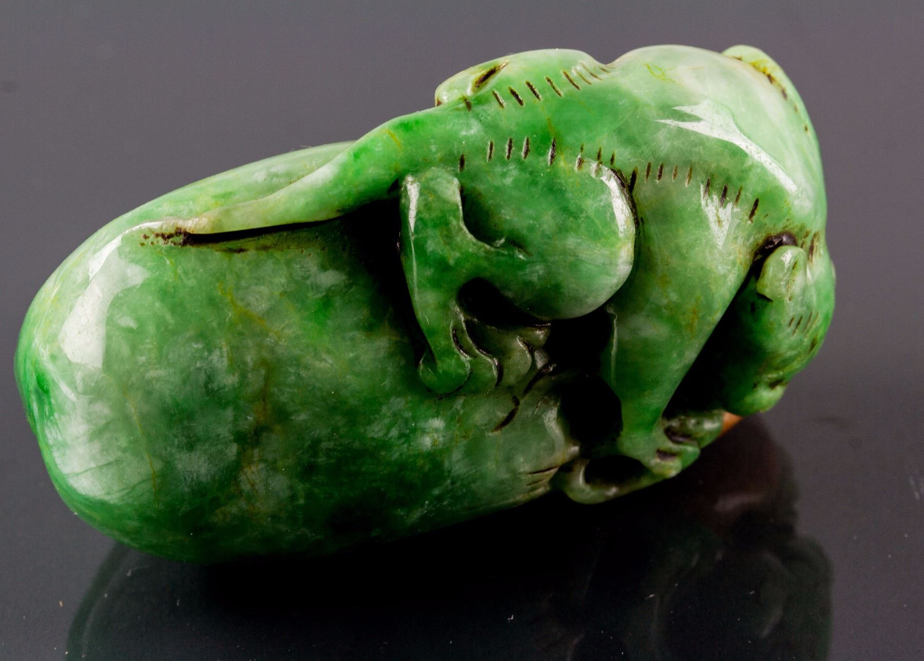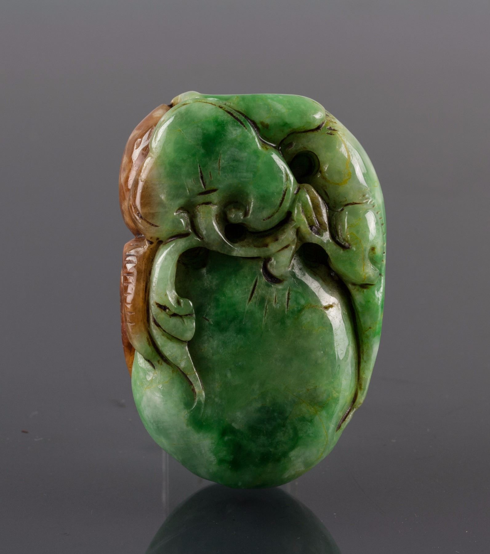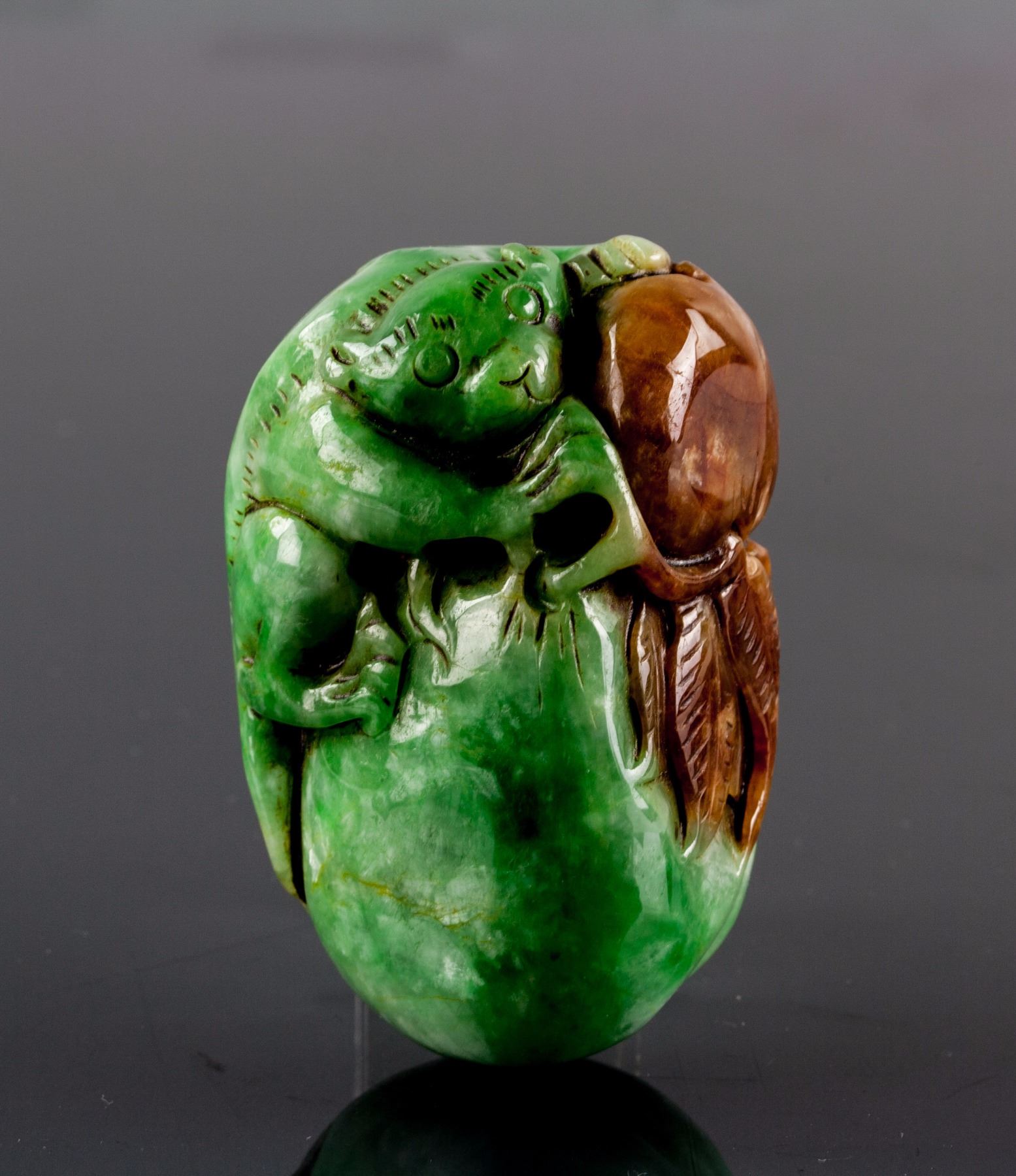 Burma russet and green jadeite carved toggle; carved in a small panda holding a melon; of green tone with russet skin; pierced for suspension; 7.5 cm x 5 cm, 215 grams, Density: 3.25