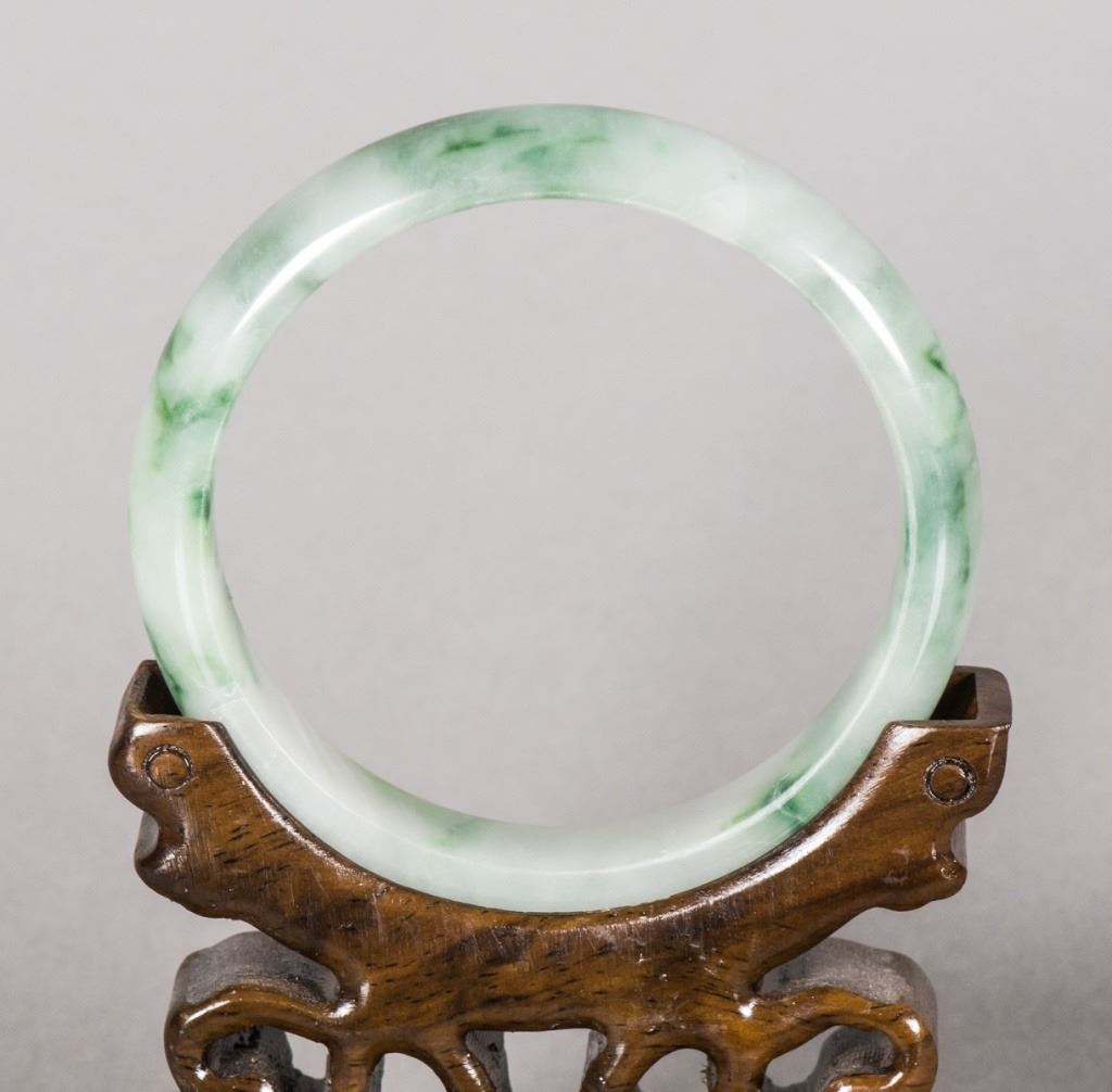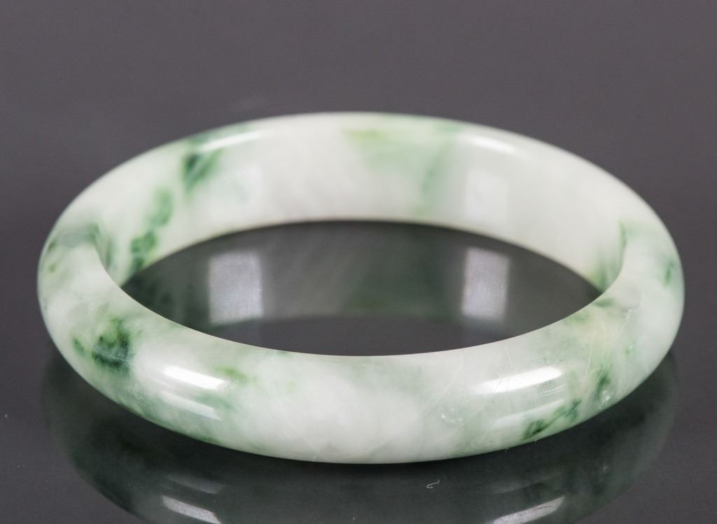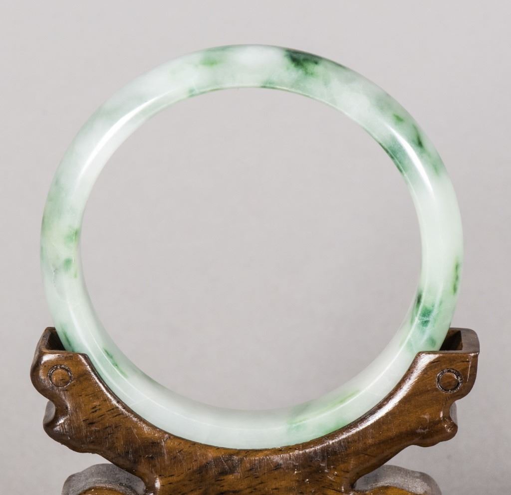 Burma green jadeite bangle; rounded edge outside and flatten edge inside; of white tone with spinach green suffusions; D: 7.5 cm, Inner D: 6 cm, 50 grams; Density: 3.25