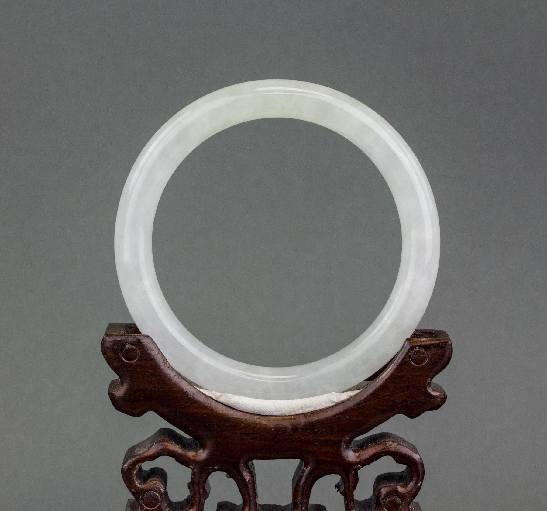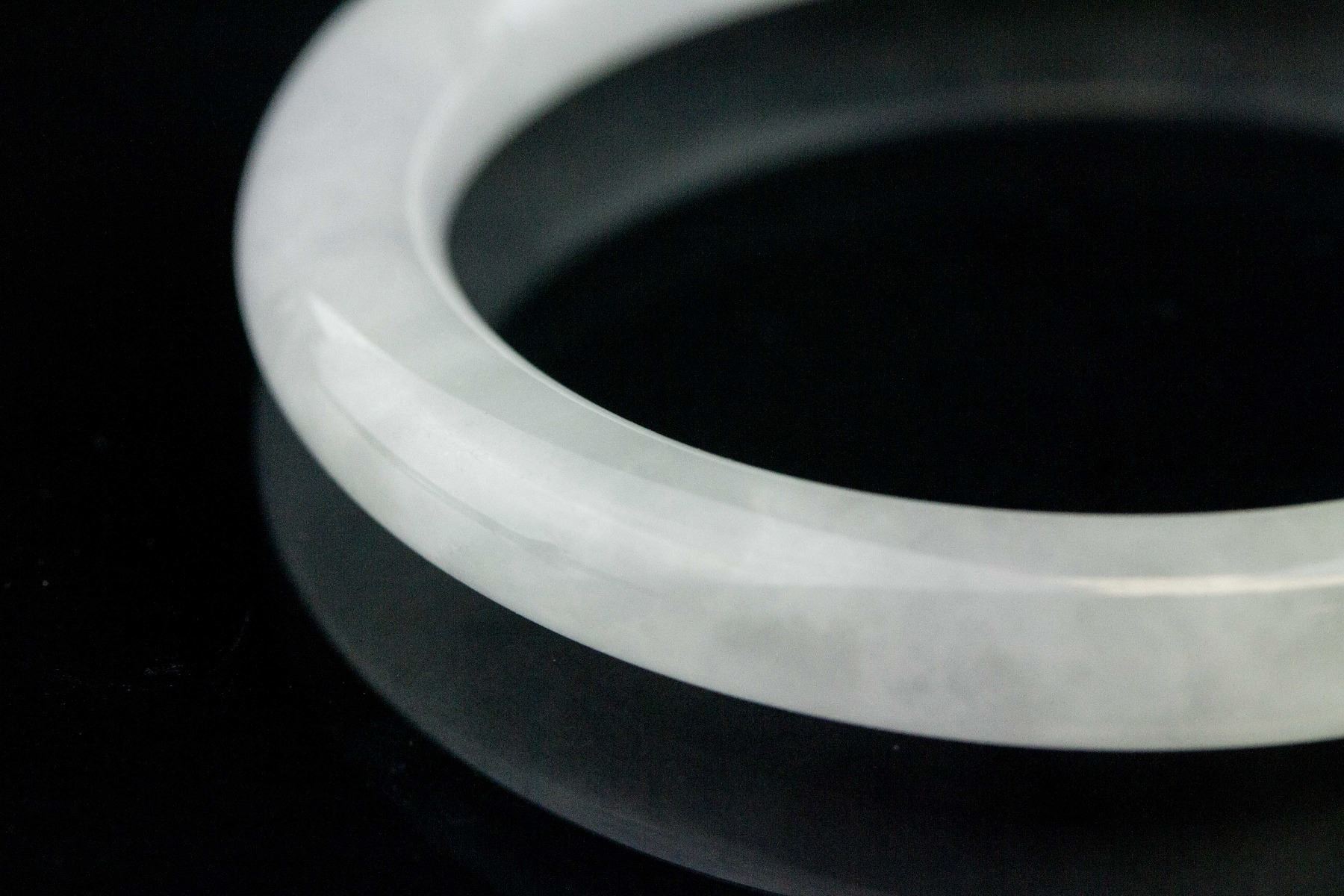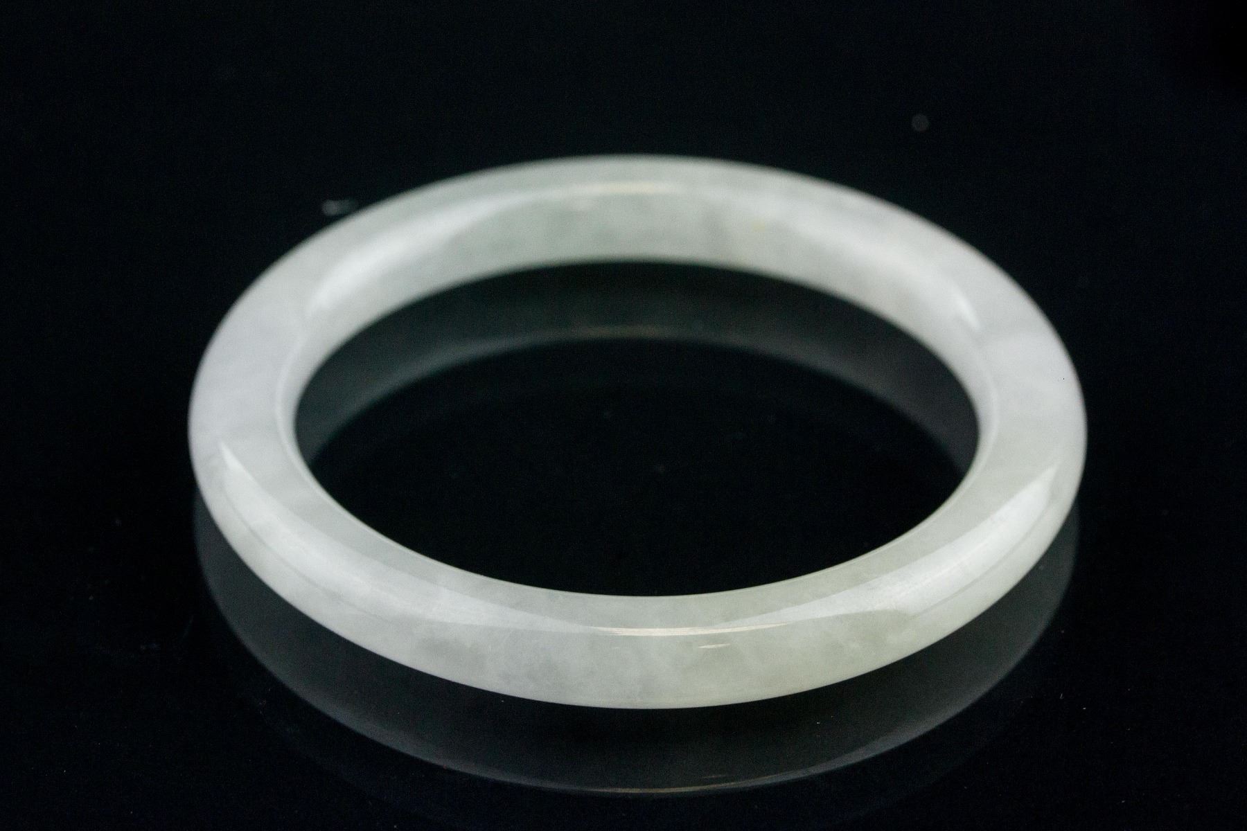 Burma white jadeite carved bangle; of rounded outside and inside; of icy white tone; D: 5.7 cm, W: 0.6, 40 grams, Density: 3.31
