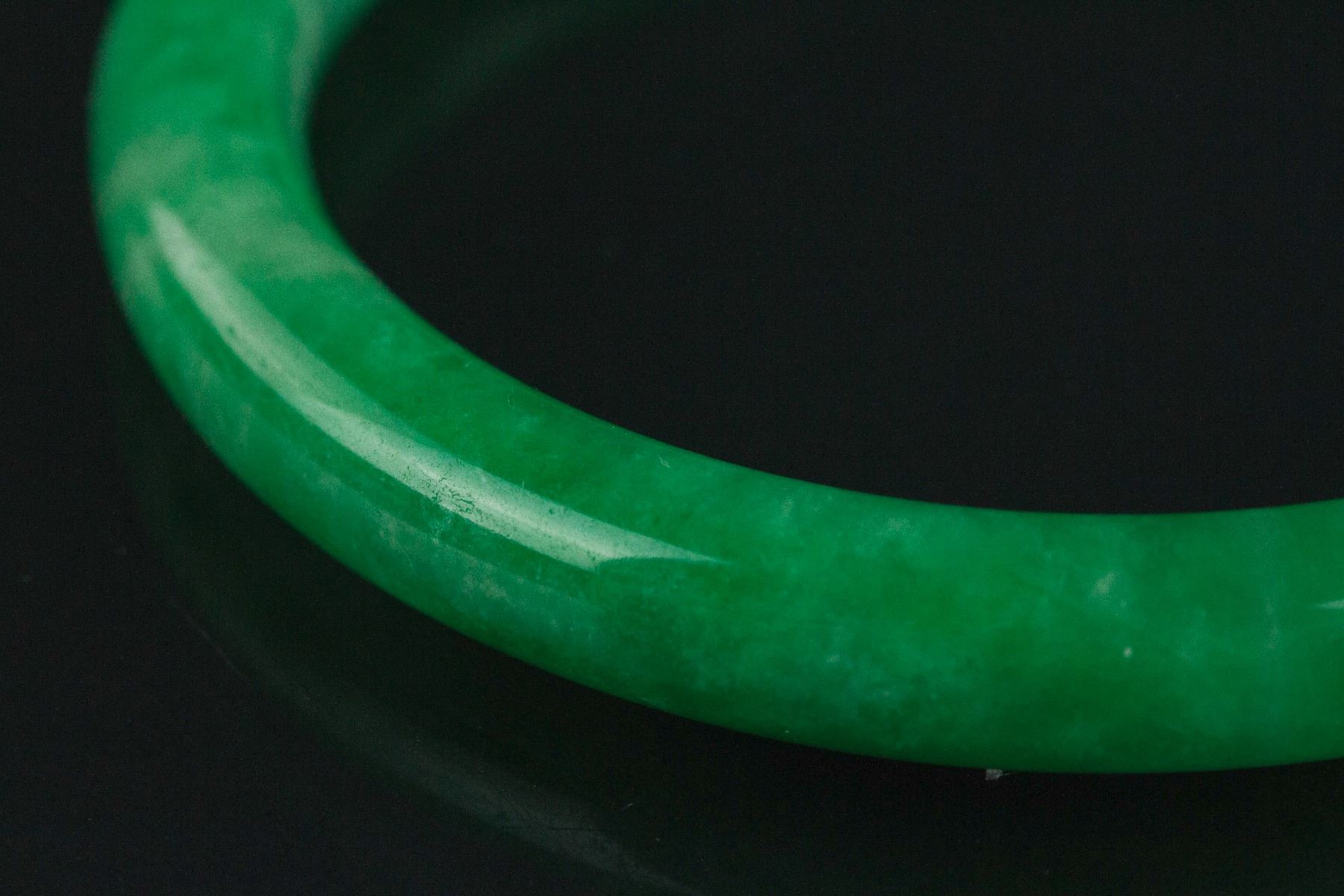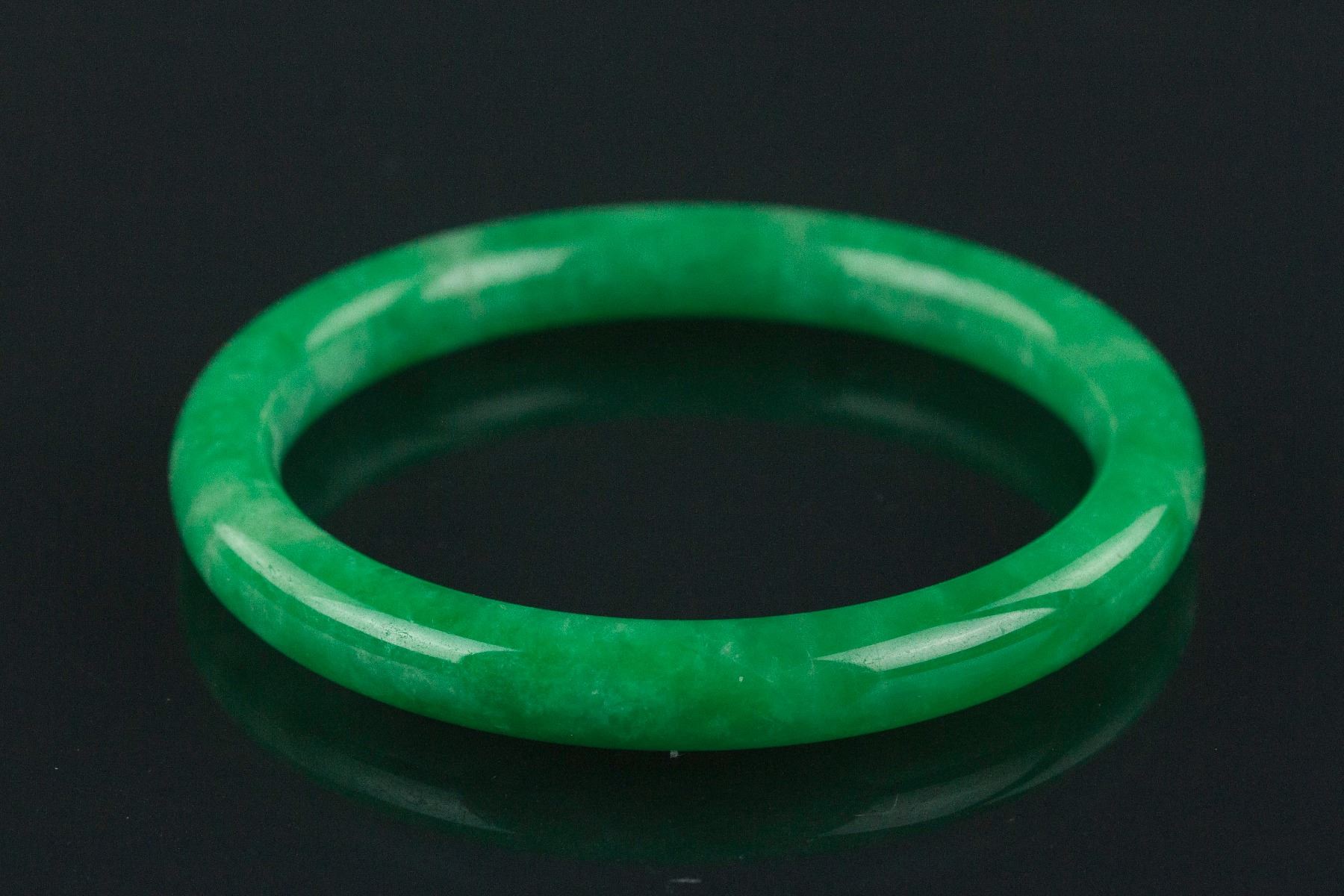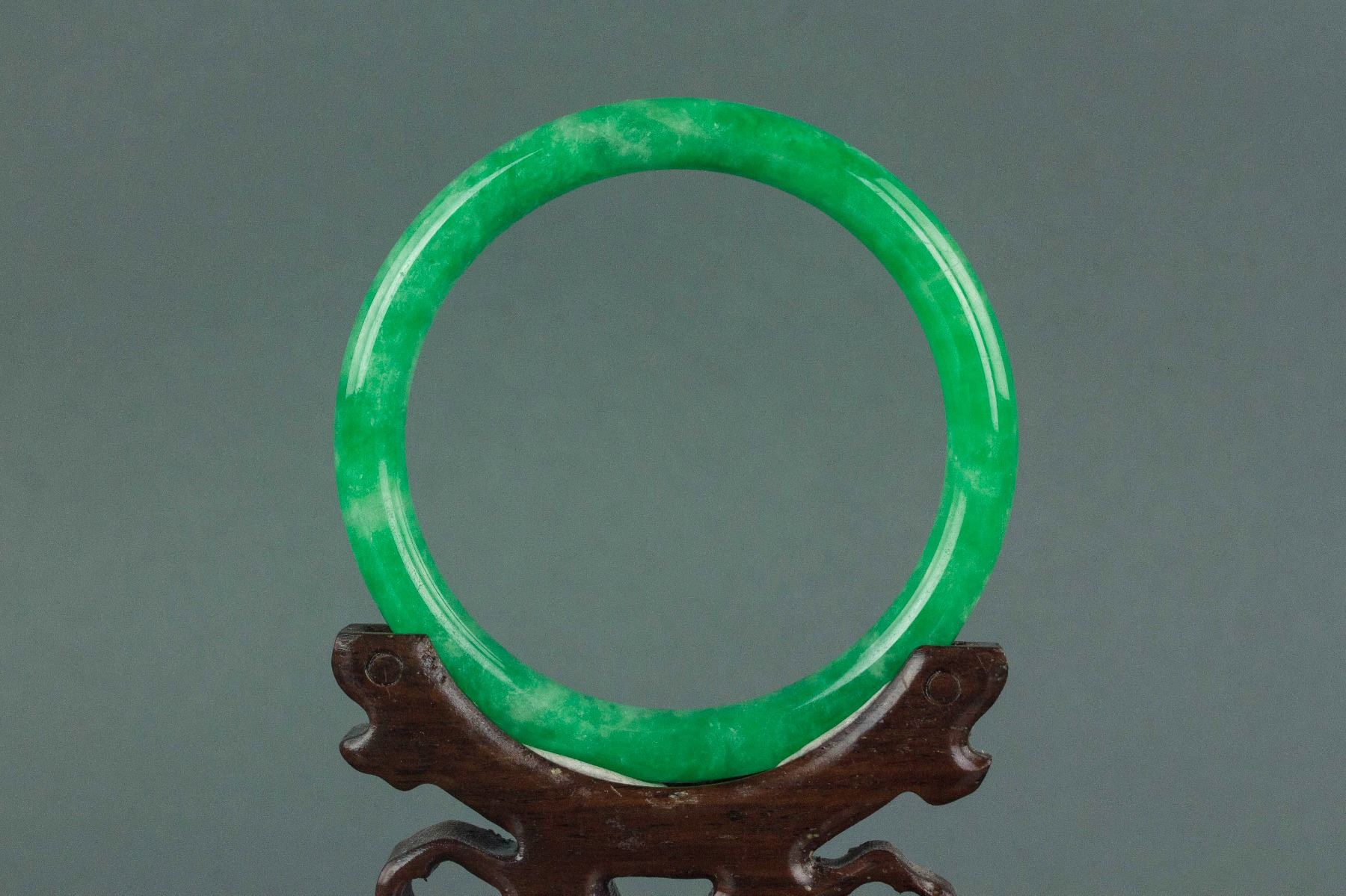 Burma jadeite bangle; of rounded edge; of imperial green tone; D: 7.5 cm, 46 grams; Density: 3.29