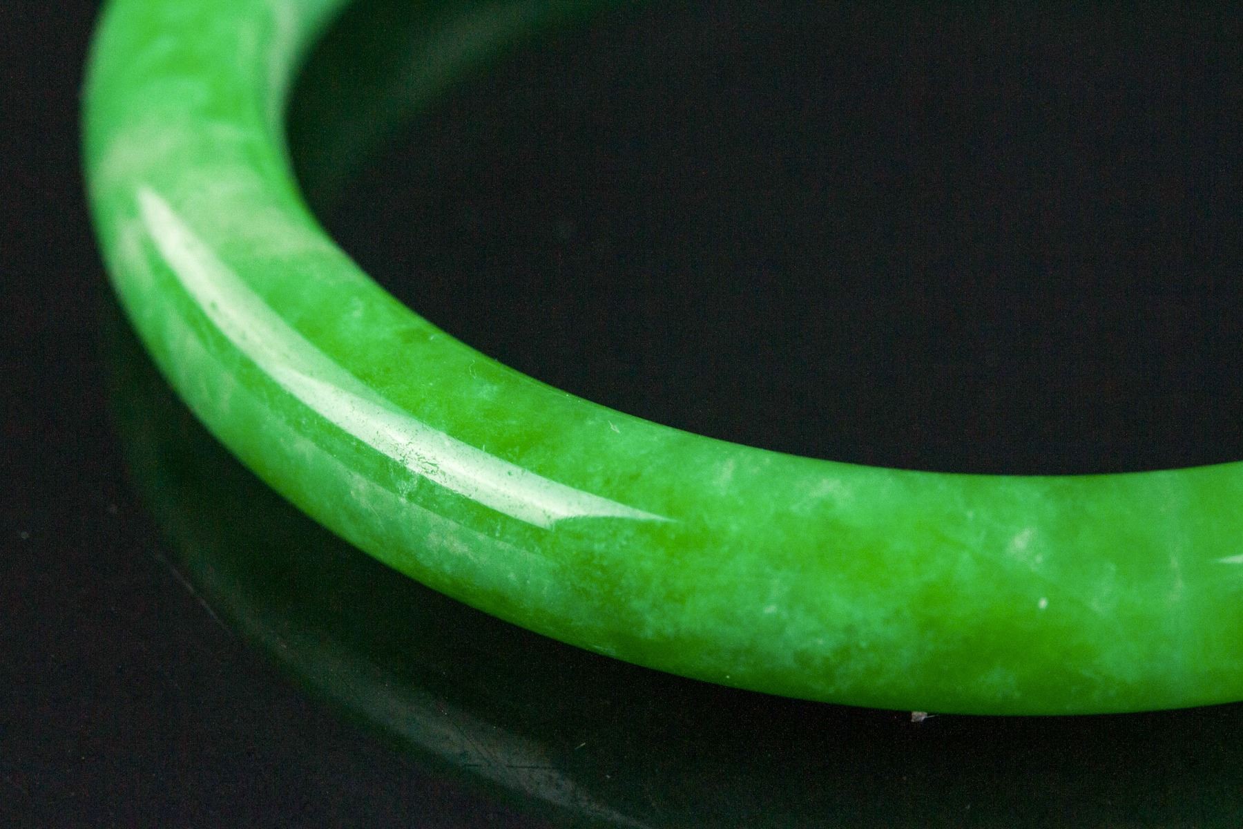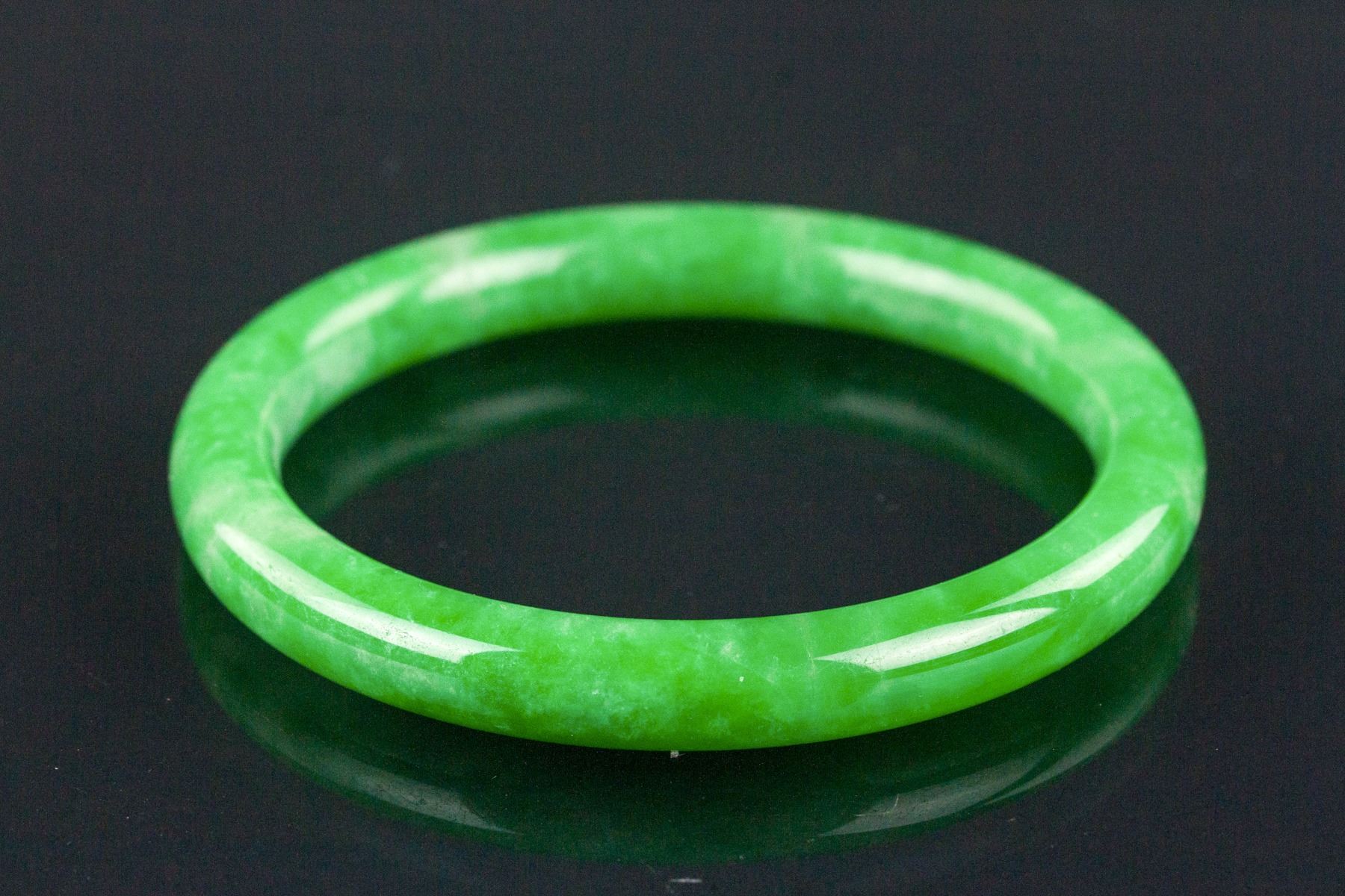Burma green jadeite carved bangle. Of rounded edge. Of imperial green tone. D: 62.89 mm, 46 grams; Density: 3.29