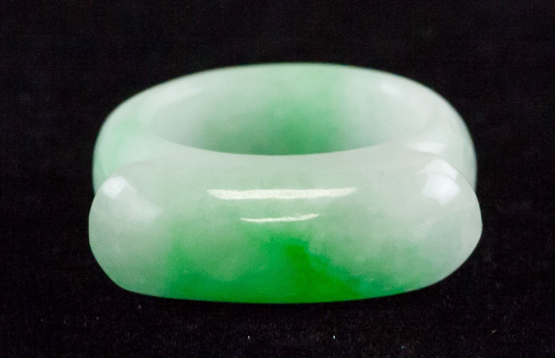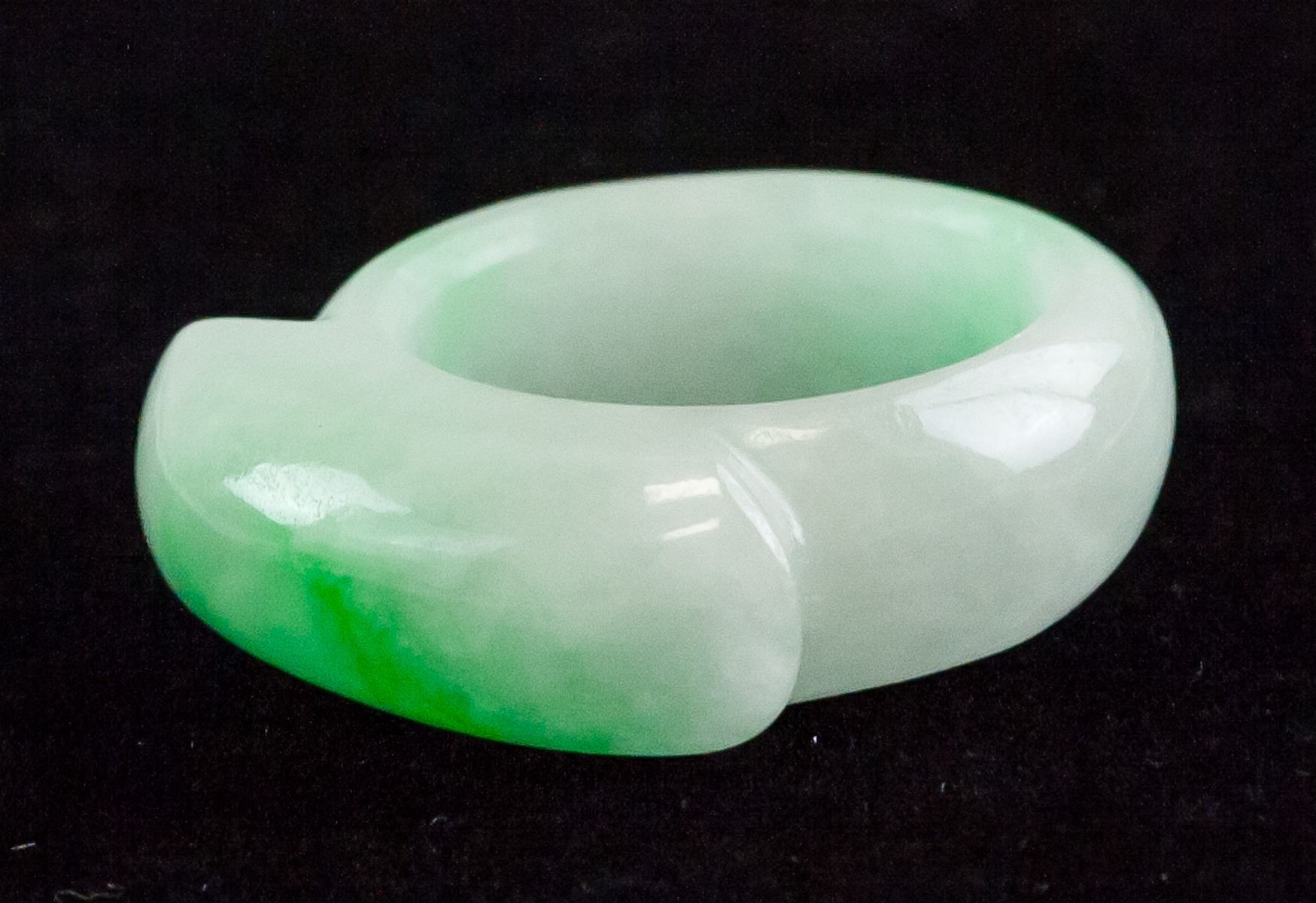 Burma jadeite archer's ring. Of green and white tone. Of flat interior and rounded exterior. Inner diameter: 18.5 mm, Outer diameter: 30.87 mm, 11 grams, Density: 3.26