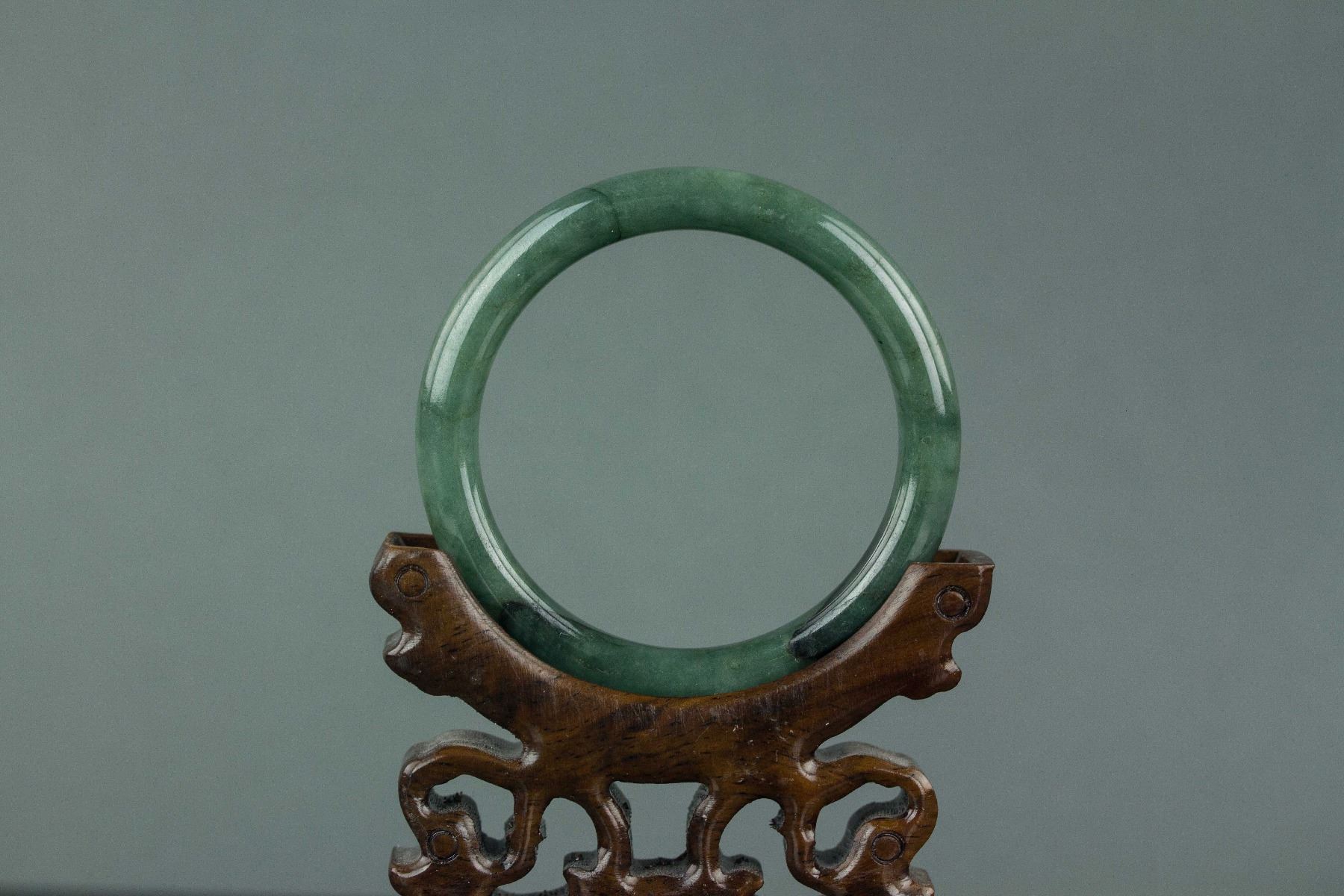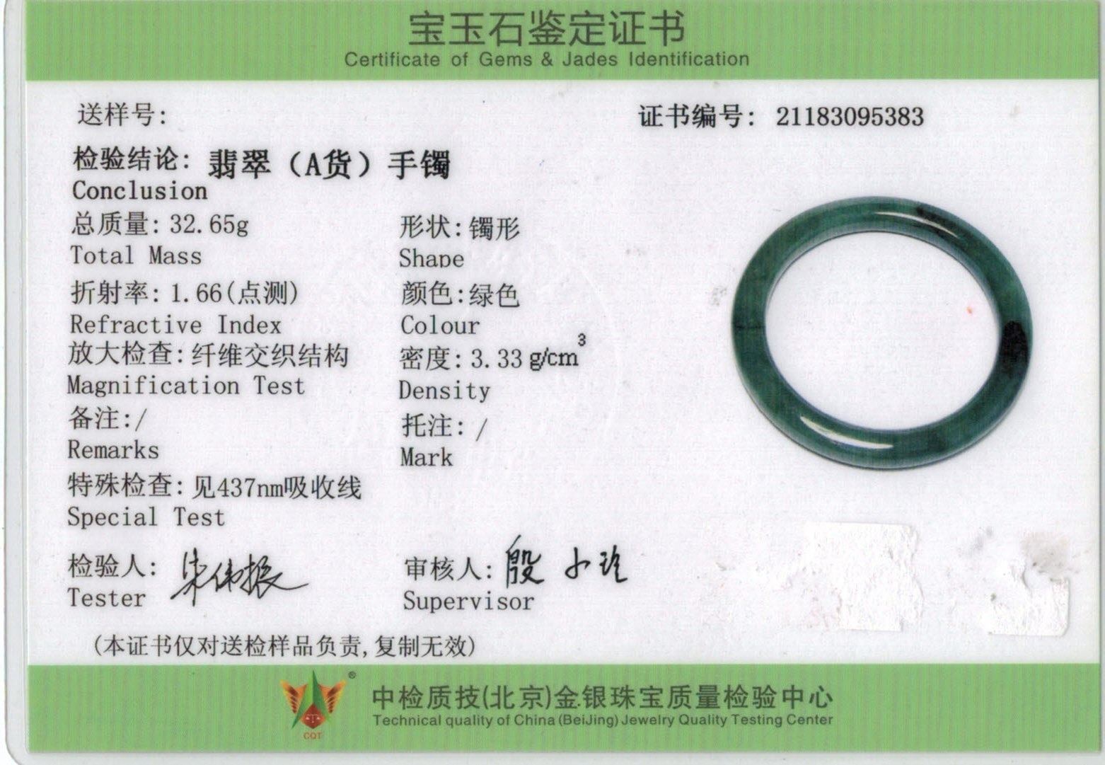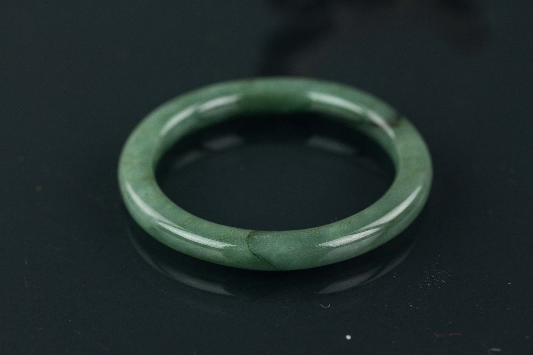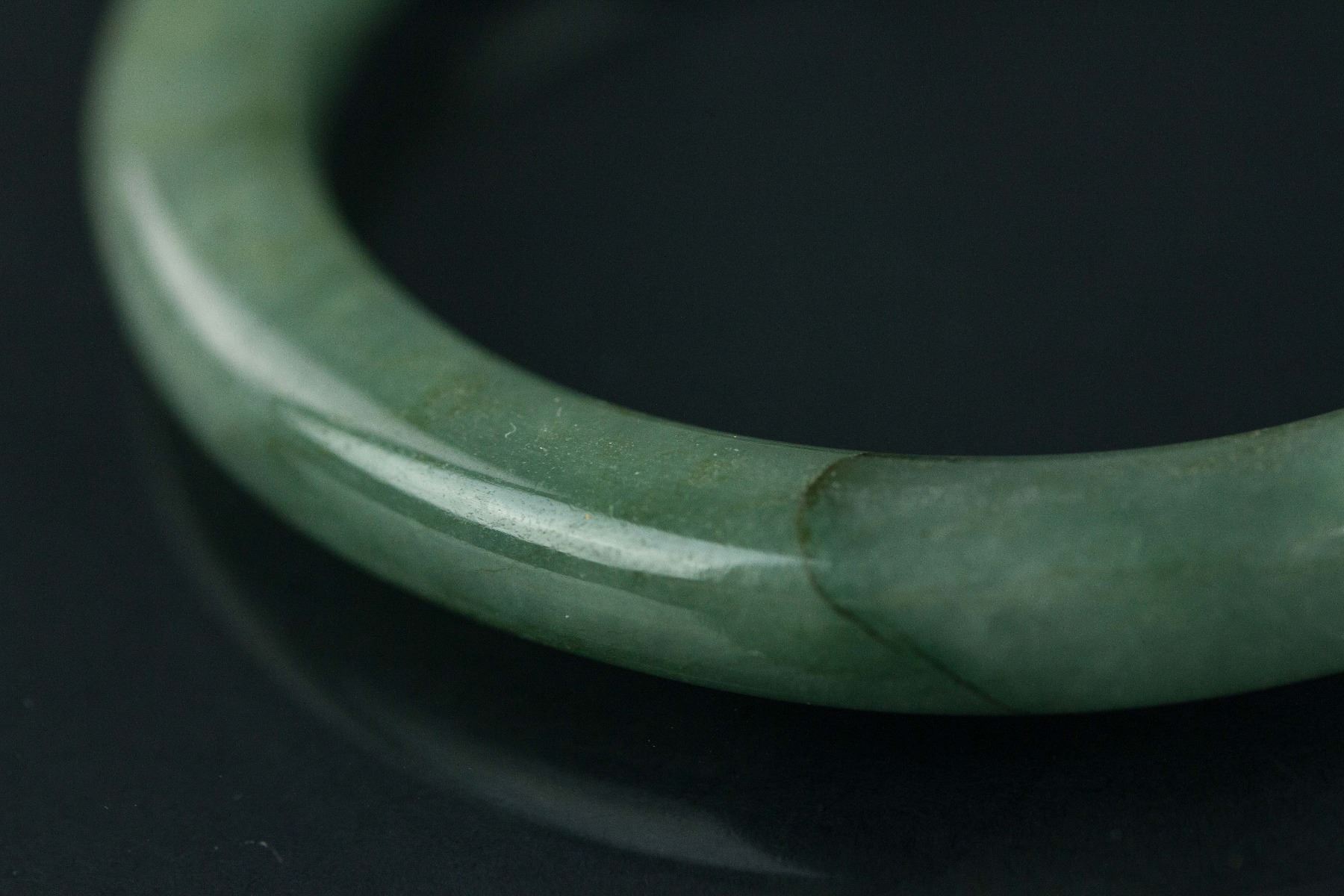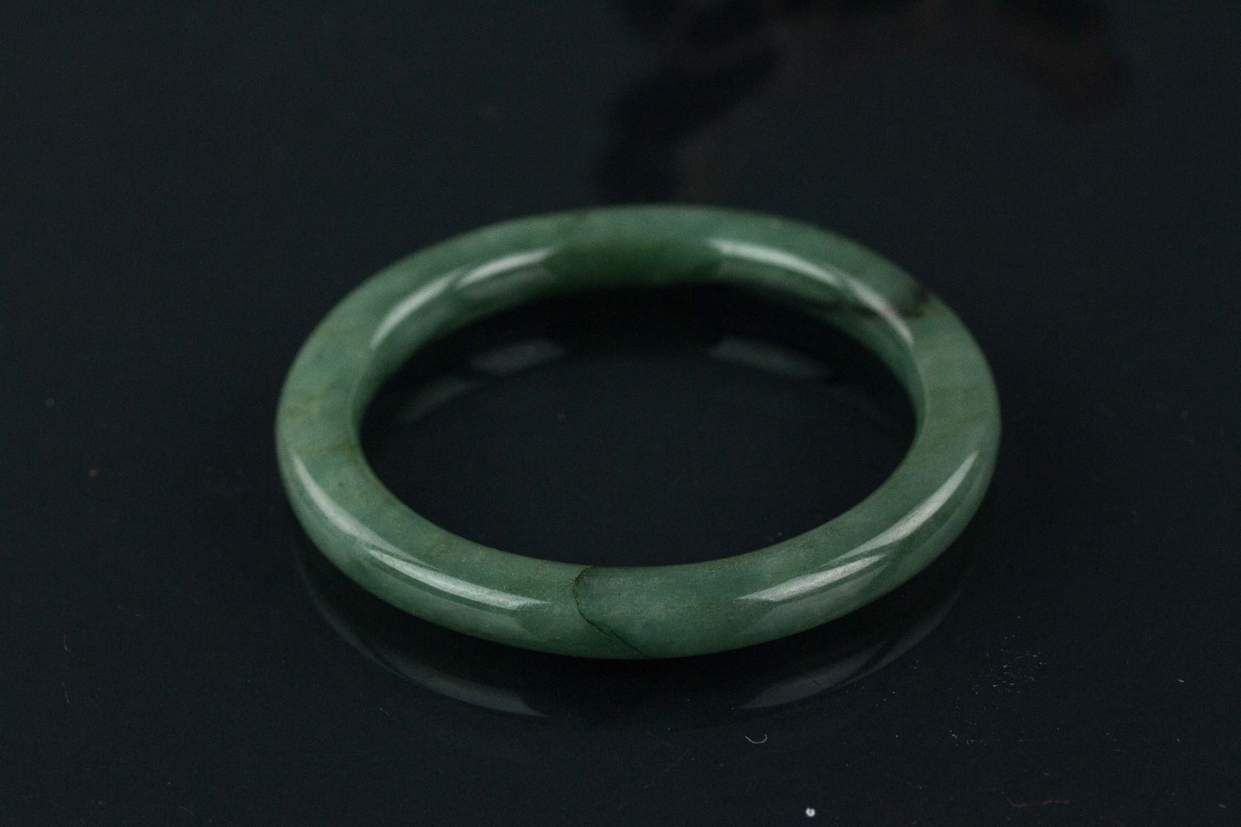 Burma jadeite bangle; of rounded edge; the stone of olive green tone; accompanied with Grade A certificate; H: 0.7 cm, D: 6.8 cm, Inner D: 5.3 cm, 32 grams, Density: 3.32