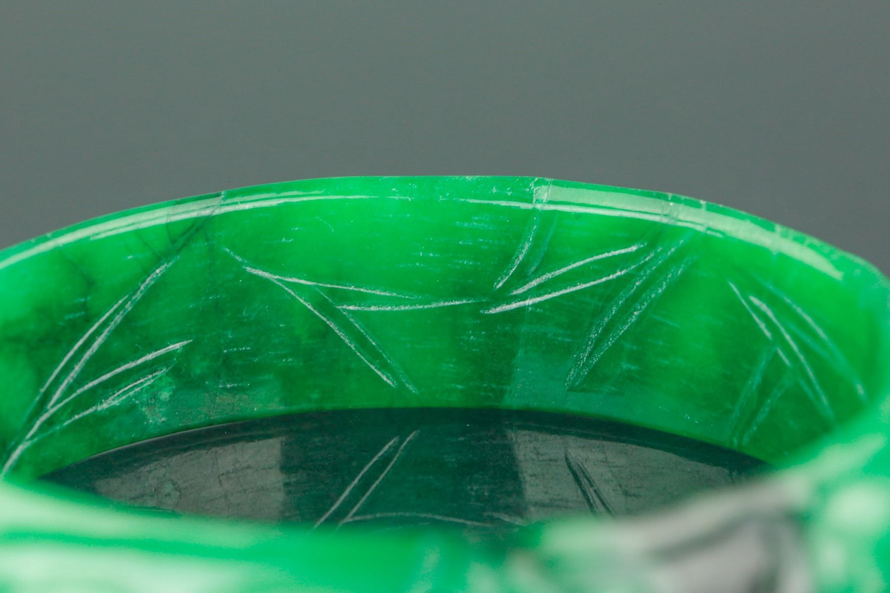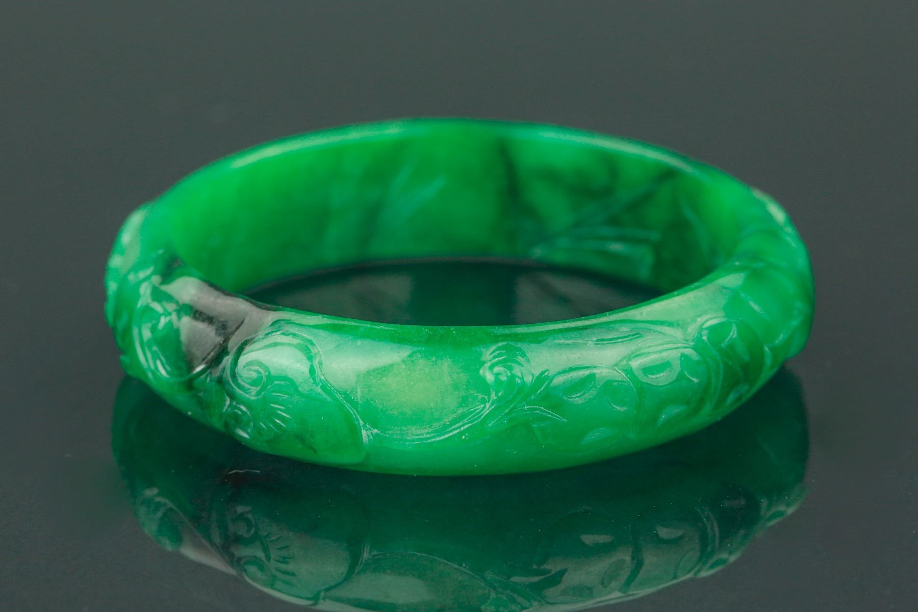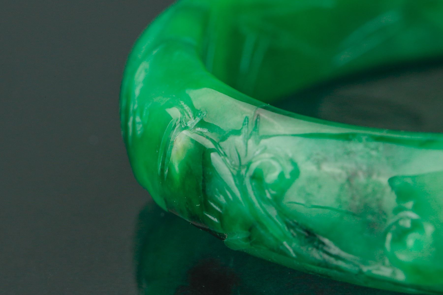 Burma jadeite carved bangle; featuring scrolling lingzhi mushroom in low relief; of emerald green with spinach green suffusions; D: 6 cm, 49 grams; Density: 3.26