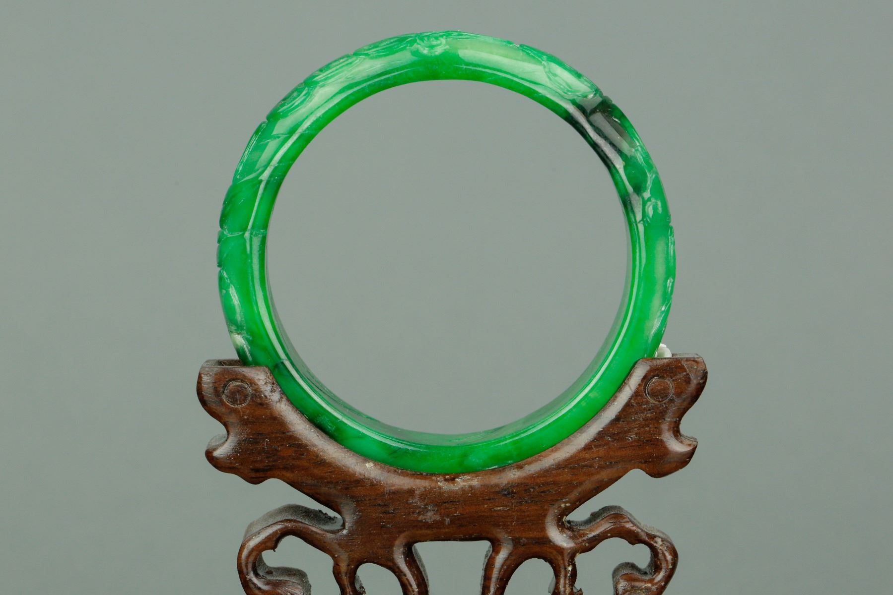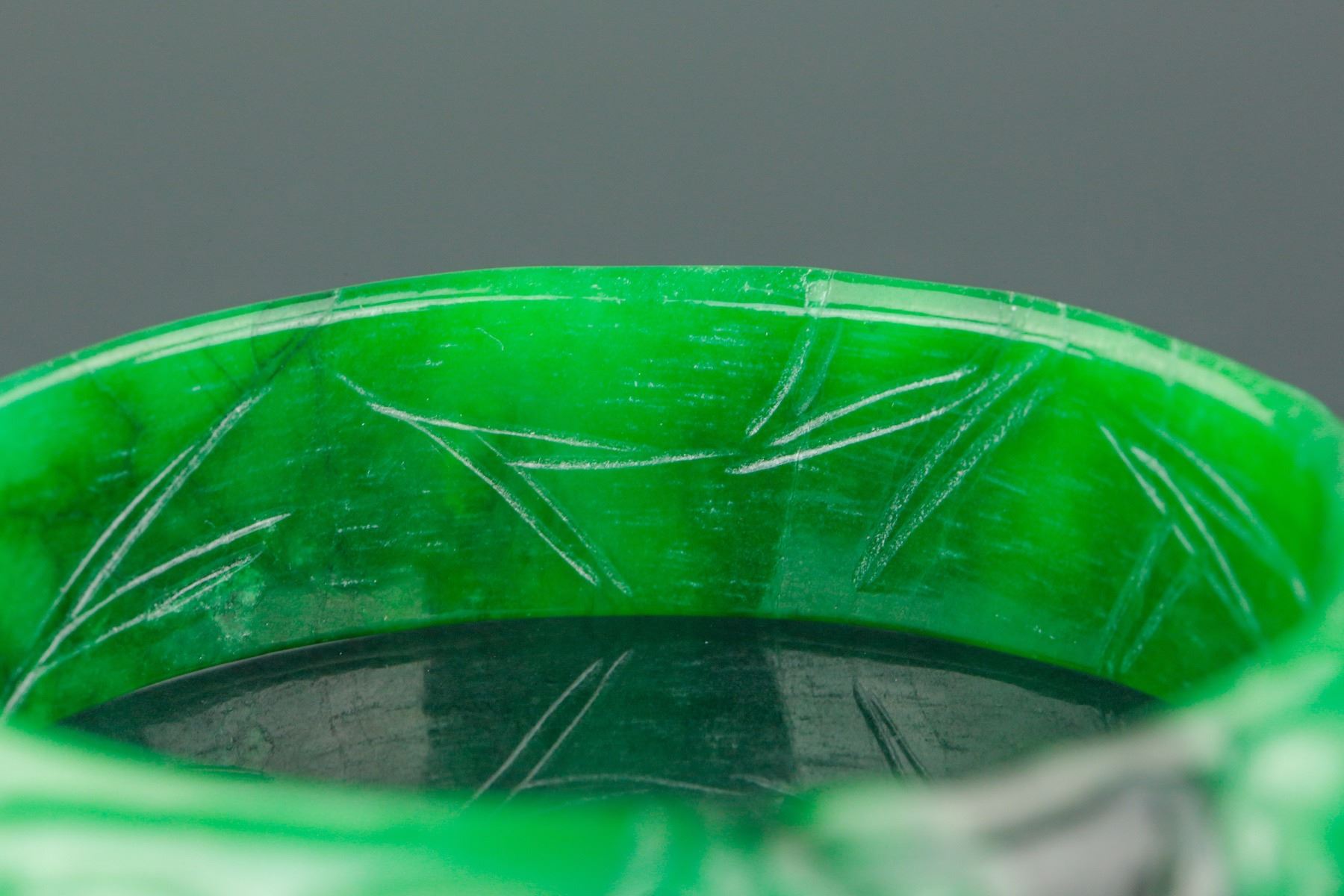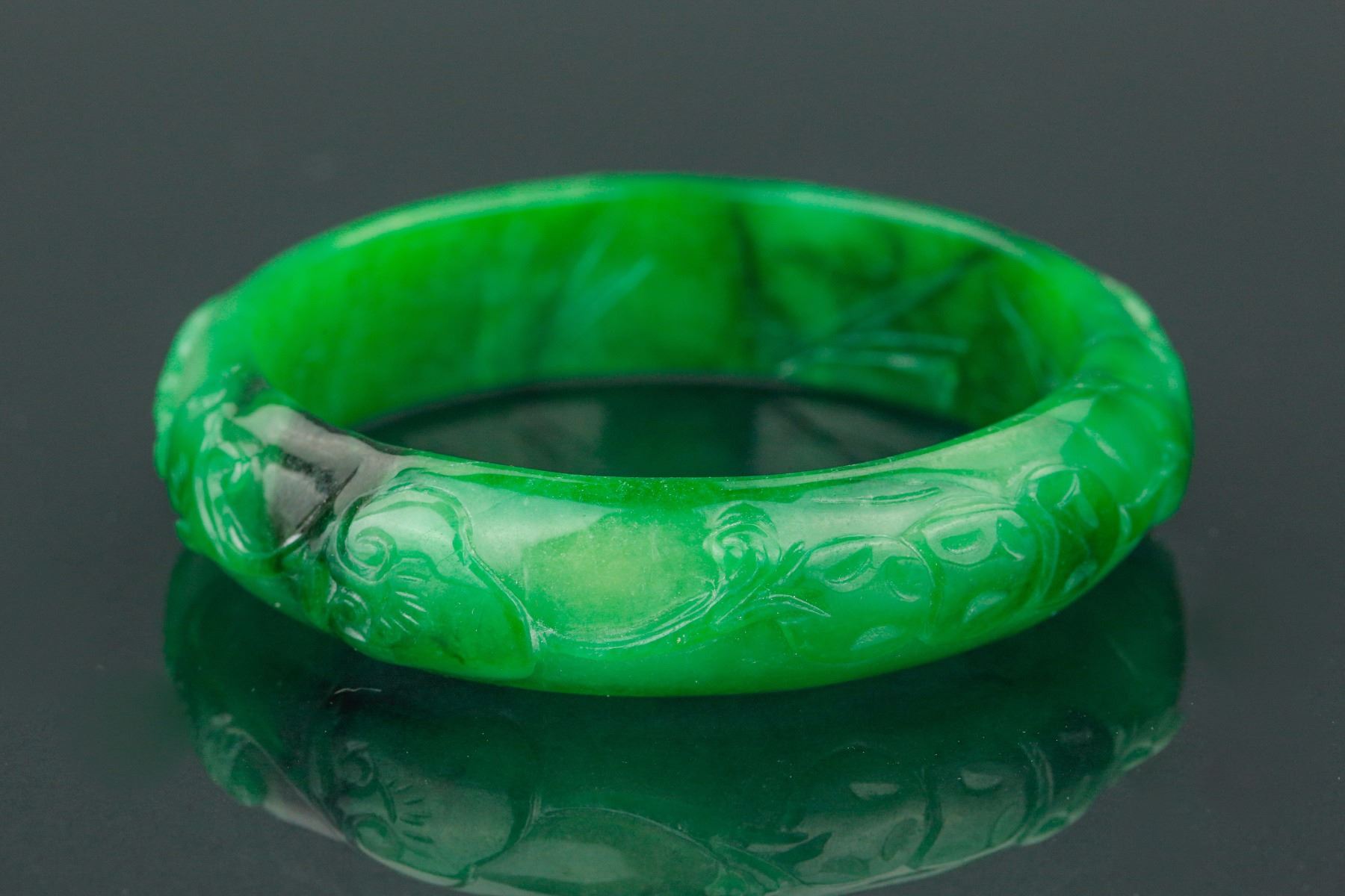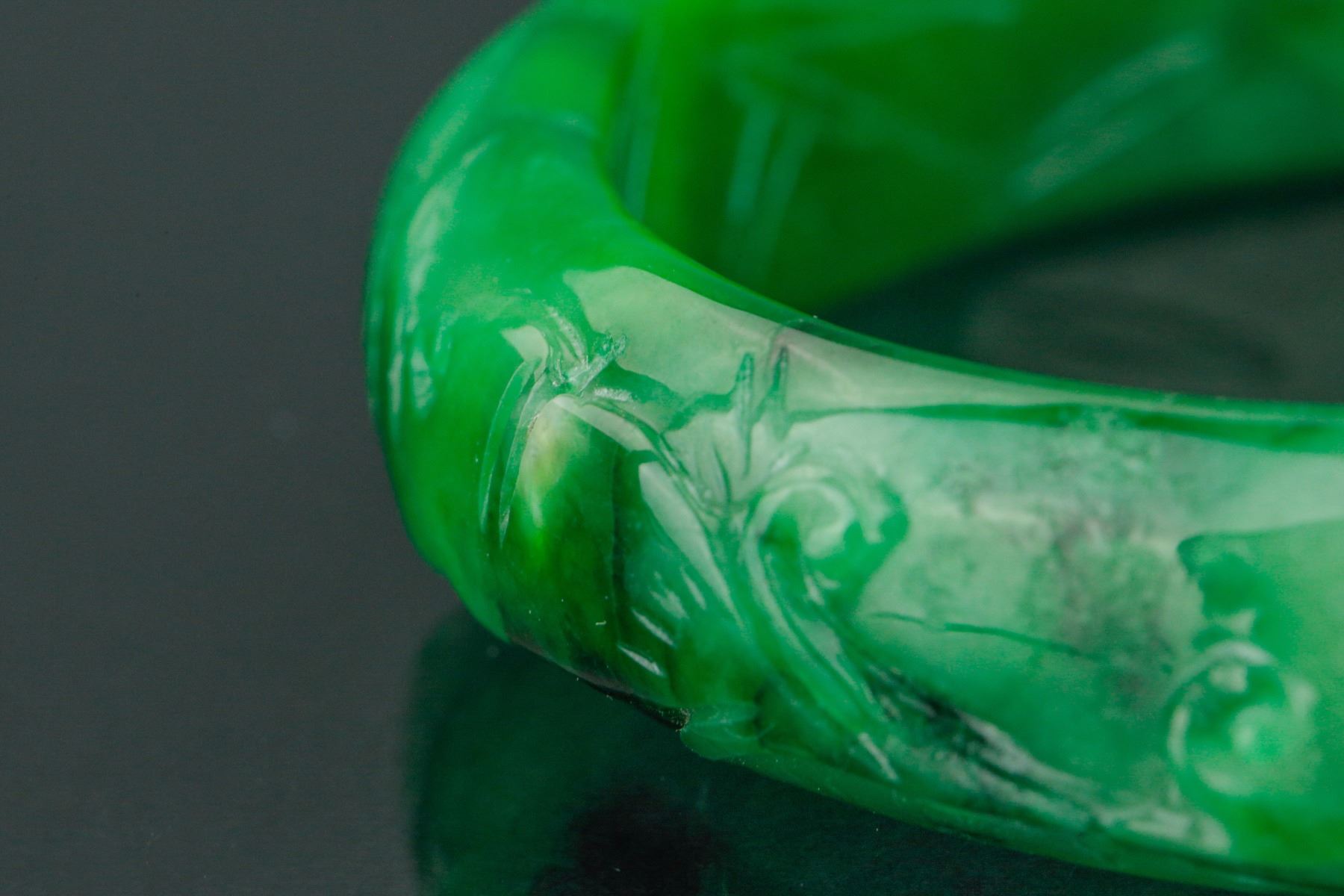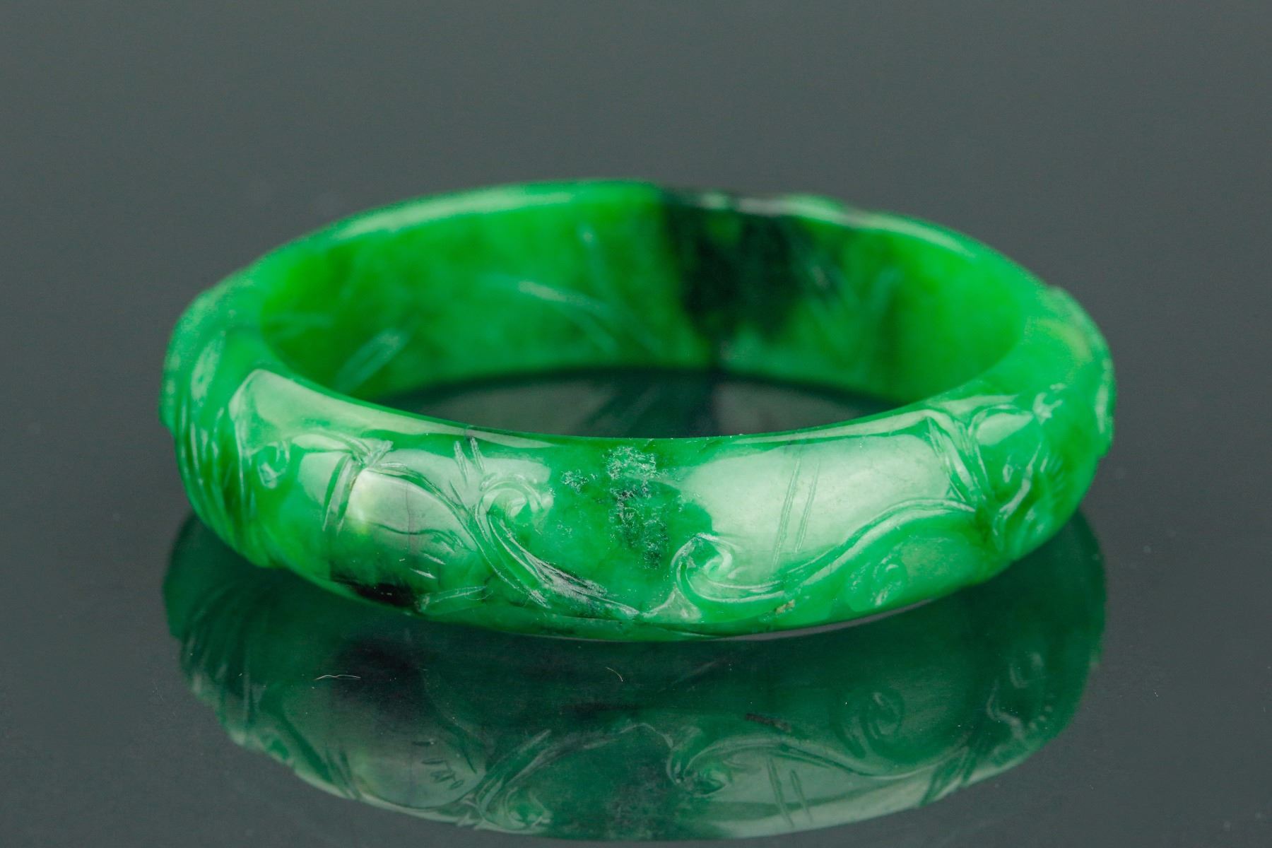 Burma jadeite carved bangle; featuring scrolling lingzhi mushroom in low relief; of emerald green with spinach green suffusions; D: 6 cm, 49 grams; Density: 3.26