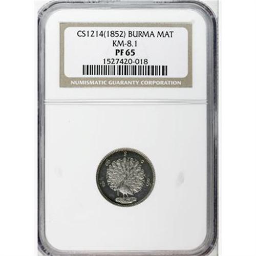 <B>Kingdom. Pagan, silver "Peacock" Proof Mat, CS1214 (1852),</B></I> KM-8.1, PR65 NGC, a boldly struck and very choice example, surfaces mirrored and lightly toned. Rare and beautiful.<BR><BR><b>Shipping:</b> Coins & Currency (<a target="_blank" href="http://www.heritageauctions.com/common/shipping.php">view shipping information</a>)