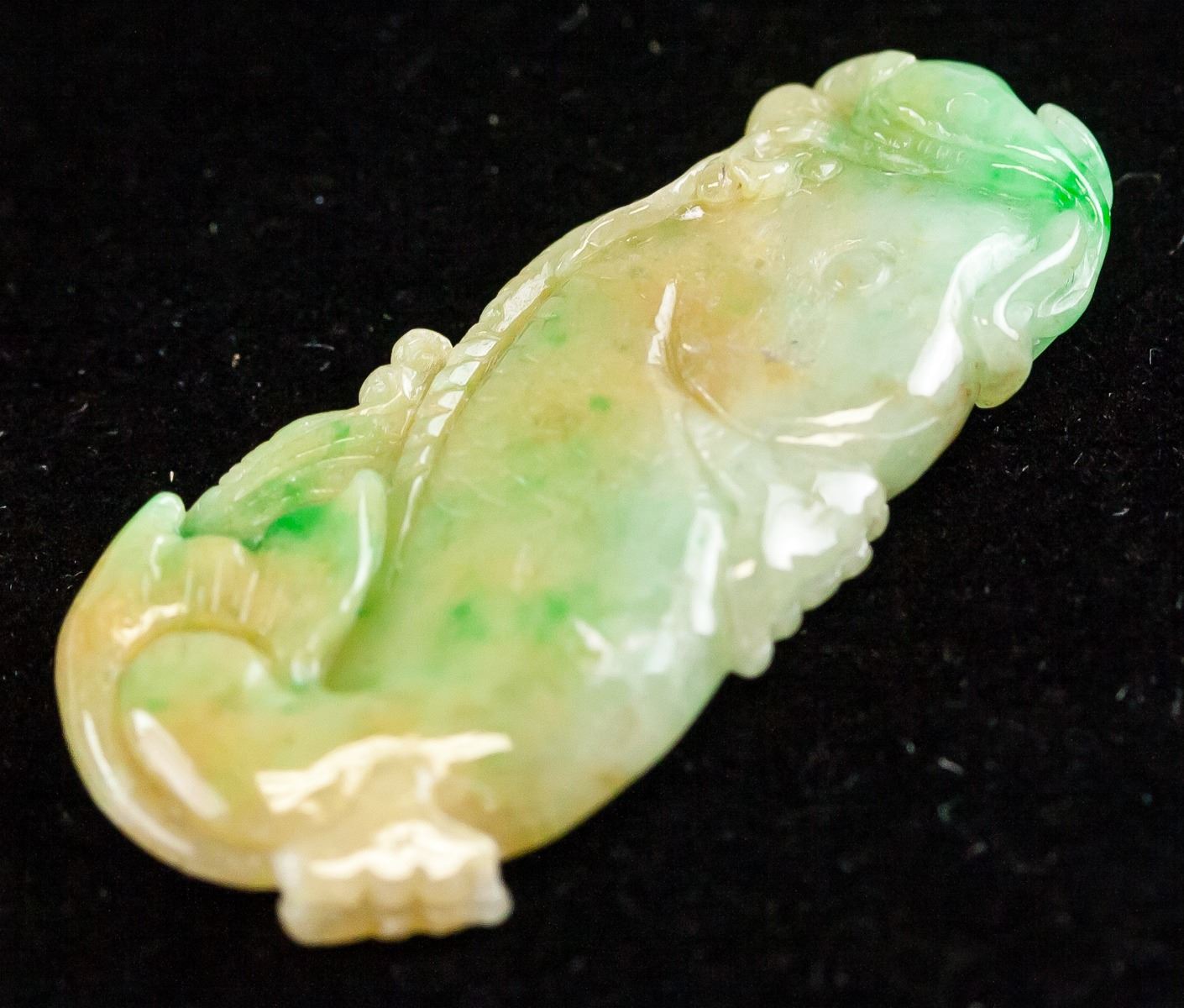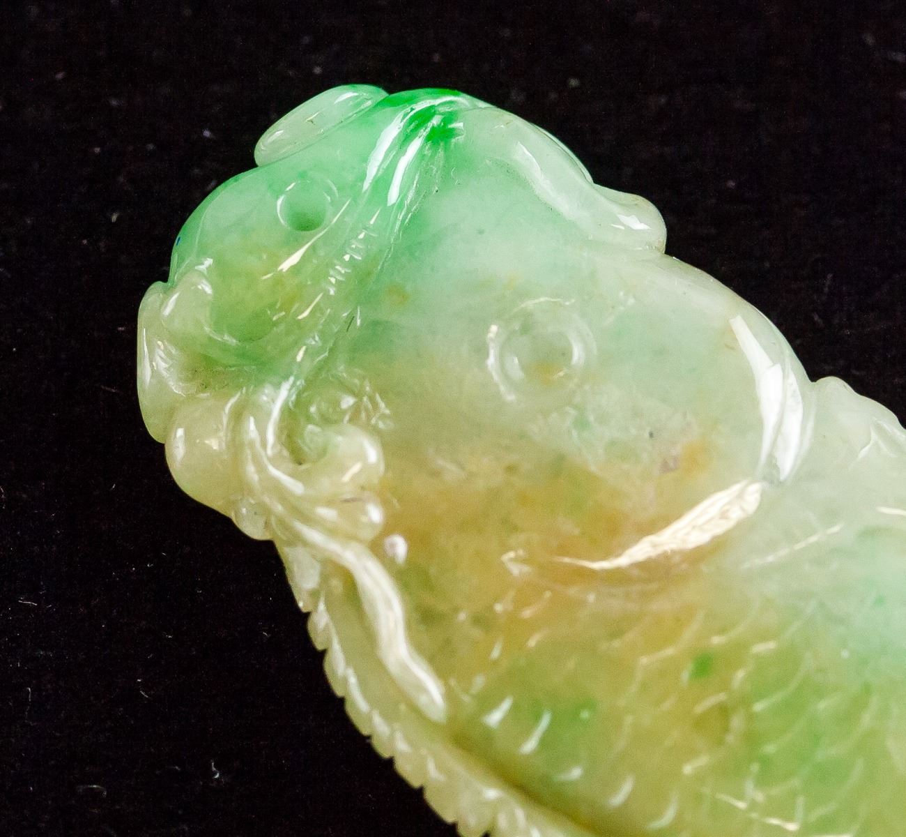 Burman mixed tone jadeite carved pendant. Featuring fish. Of green tone and brown tinge. 4.5 x 2 cm, 12 grams, density: 3.30