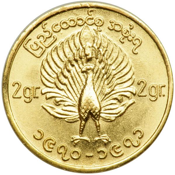 Burma/Myanmar. Mu, 1970-1971. Fr-10; KM-X#M3. Weight 0.0643 ounce. Legend around peacock. Brilliant Uncirculated.