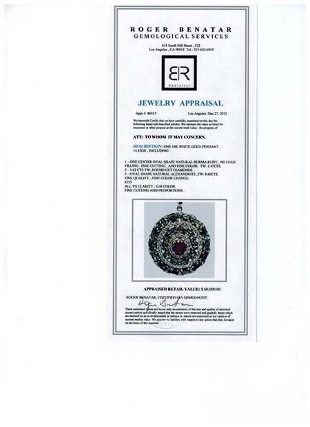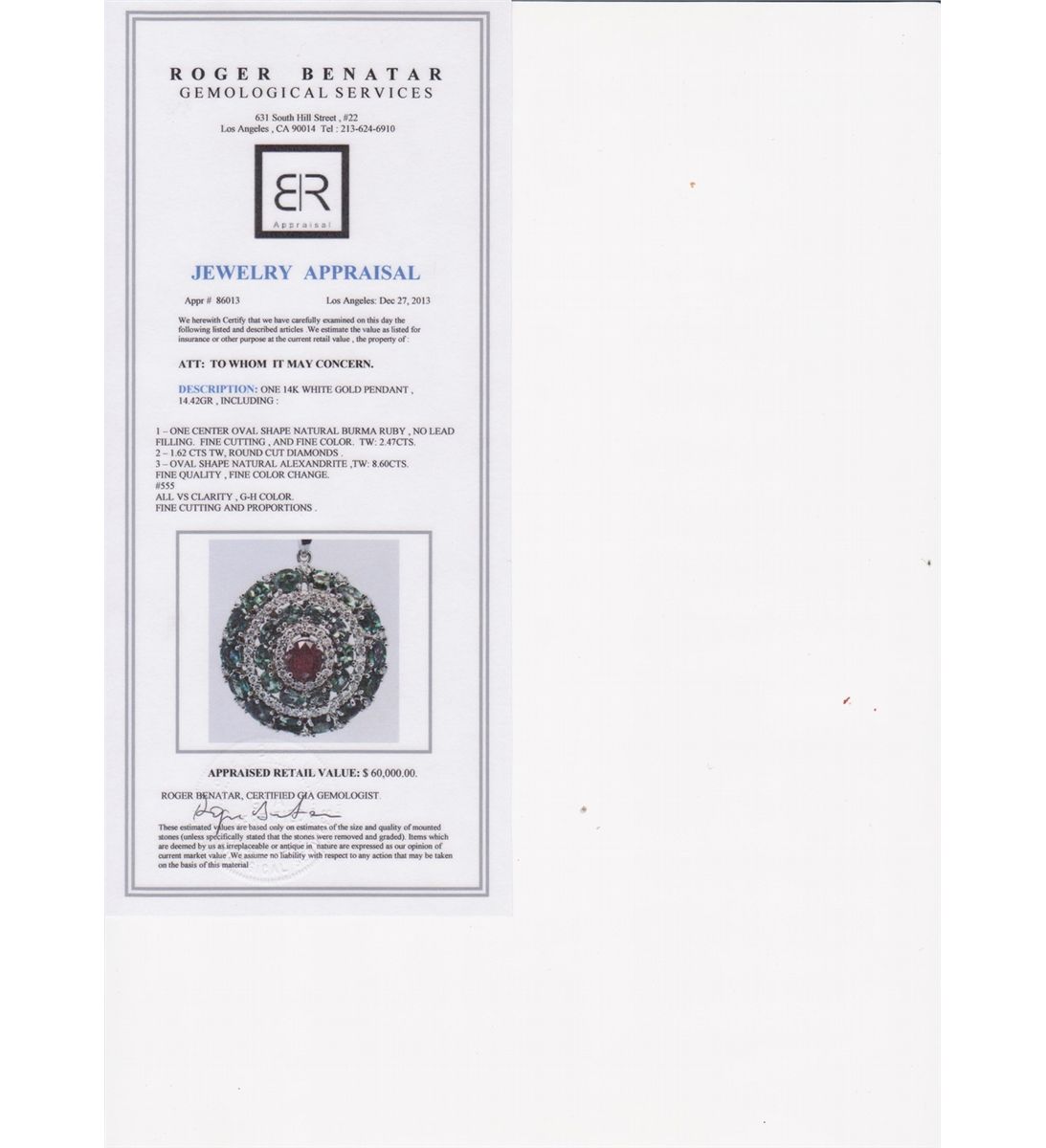 14kt White Gold 14.42 Approx grams including, 2.47ct Center Stone Oval Cut Burma Ruby (no lead) Deep Red Color, 8.60ctw Oval Alexandrite Good color and quality, 1.62ctw Round Diamond G-H color VS clarity, Appraised Retail Value $60,000.00