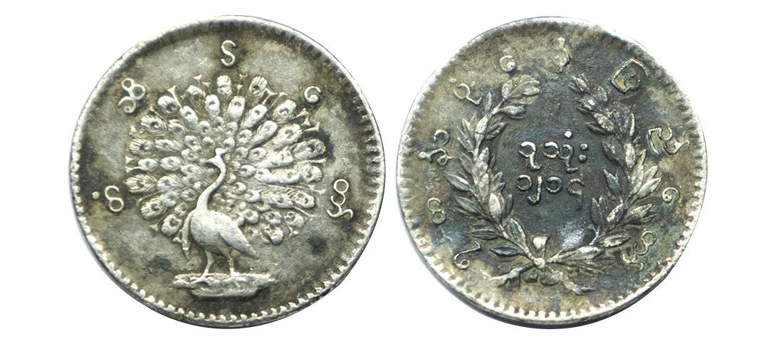 Burma, Silver MU (1/8 Rupee). Obv: Peacock facing left,