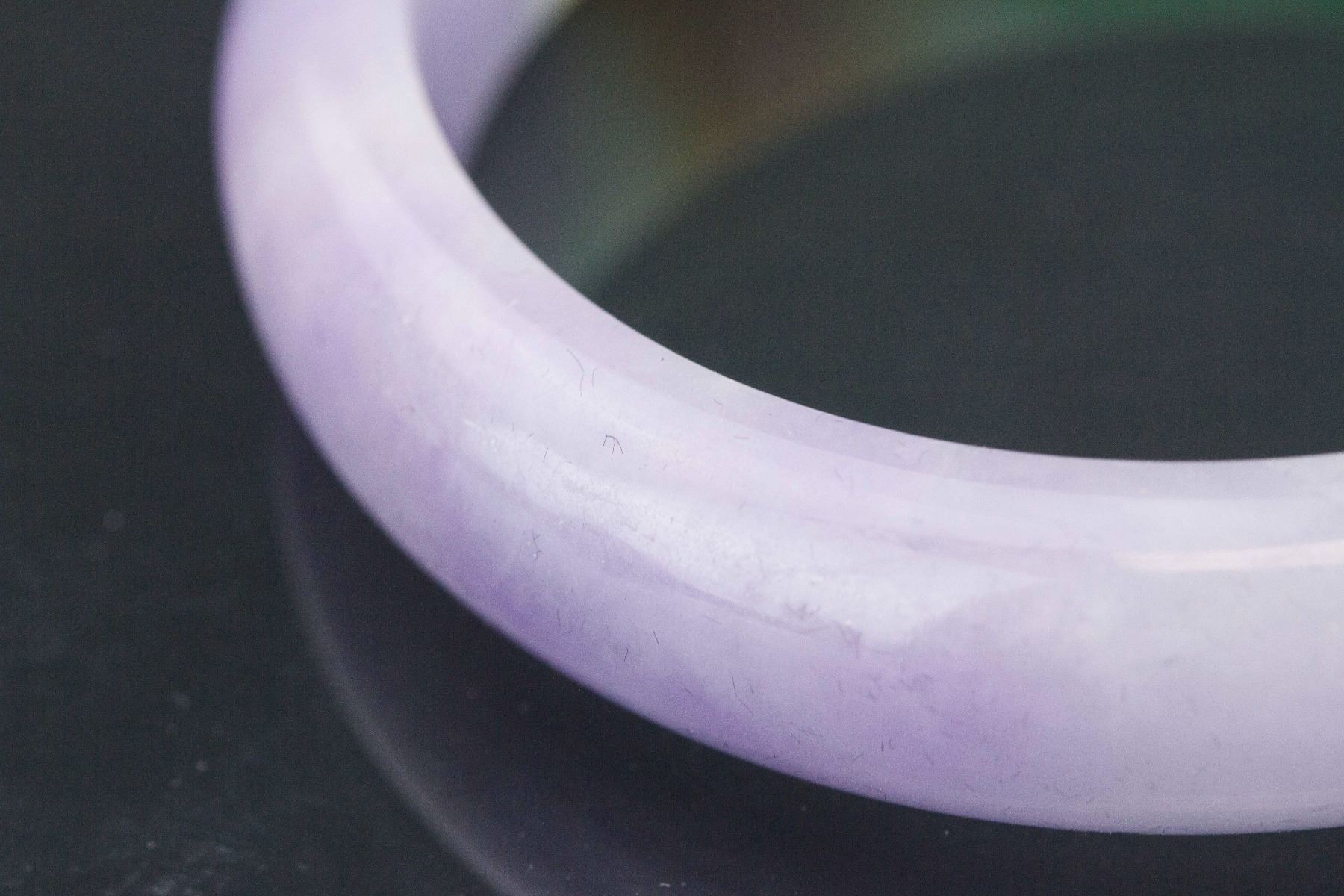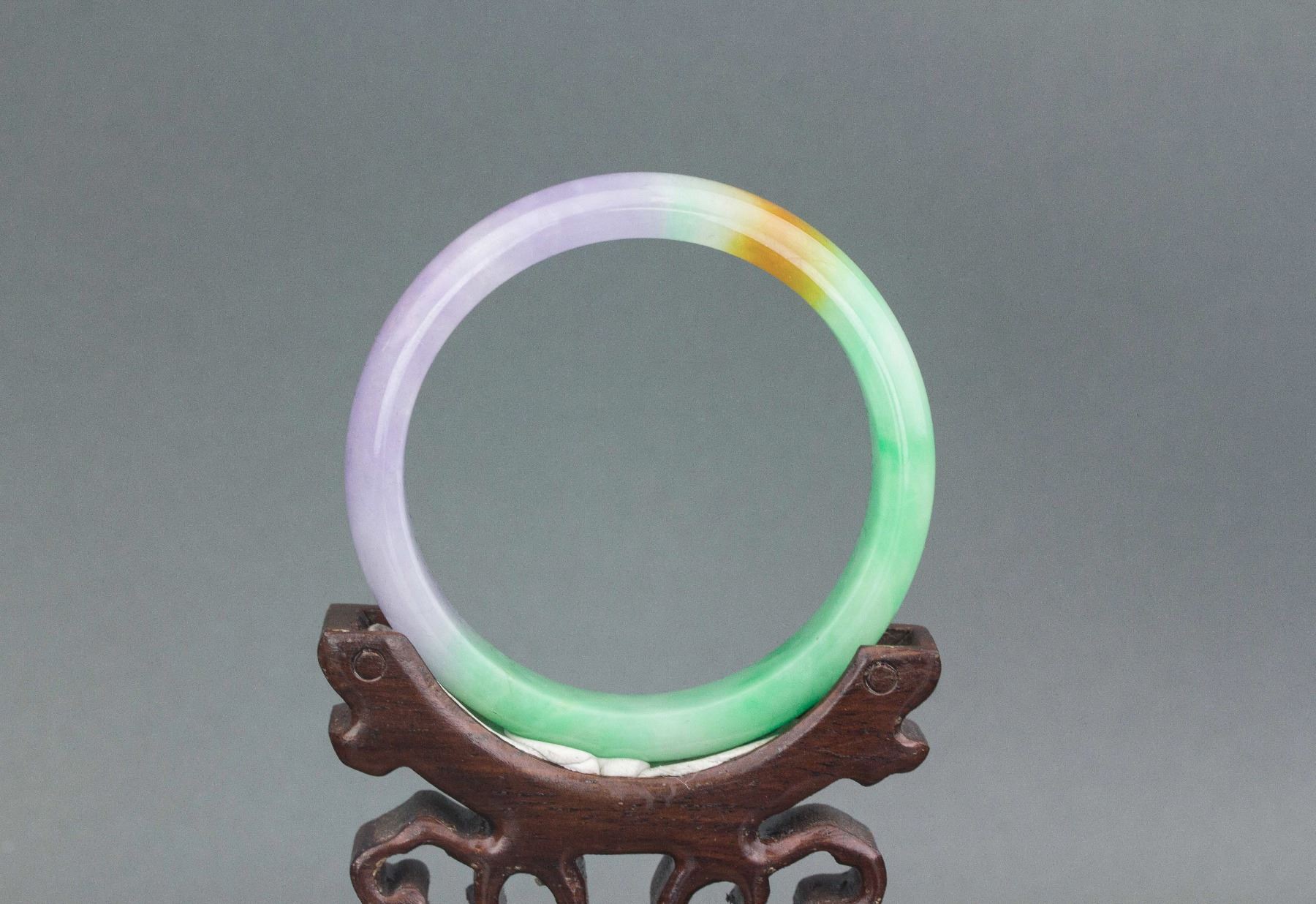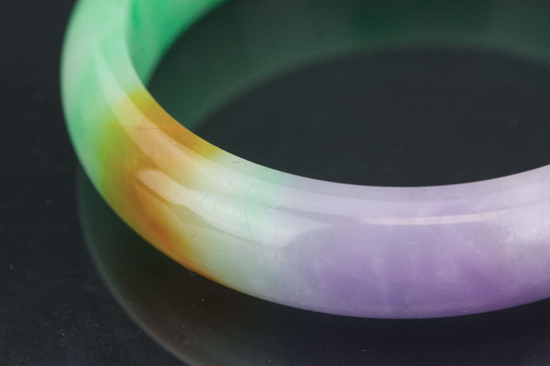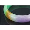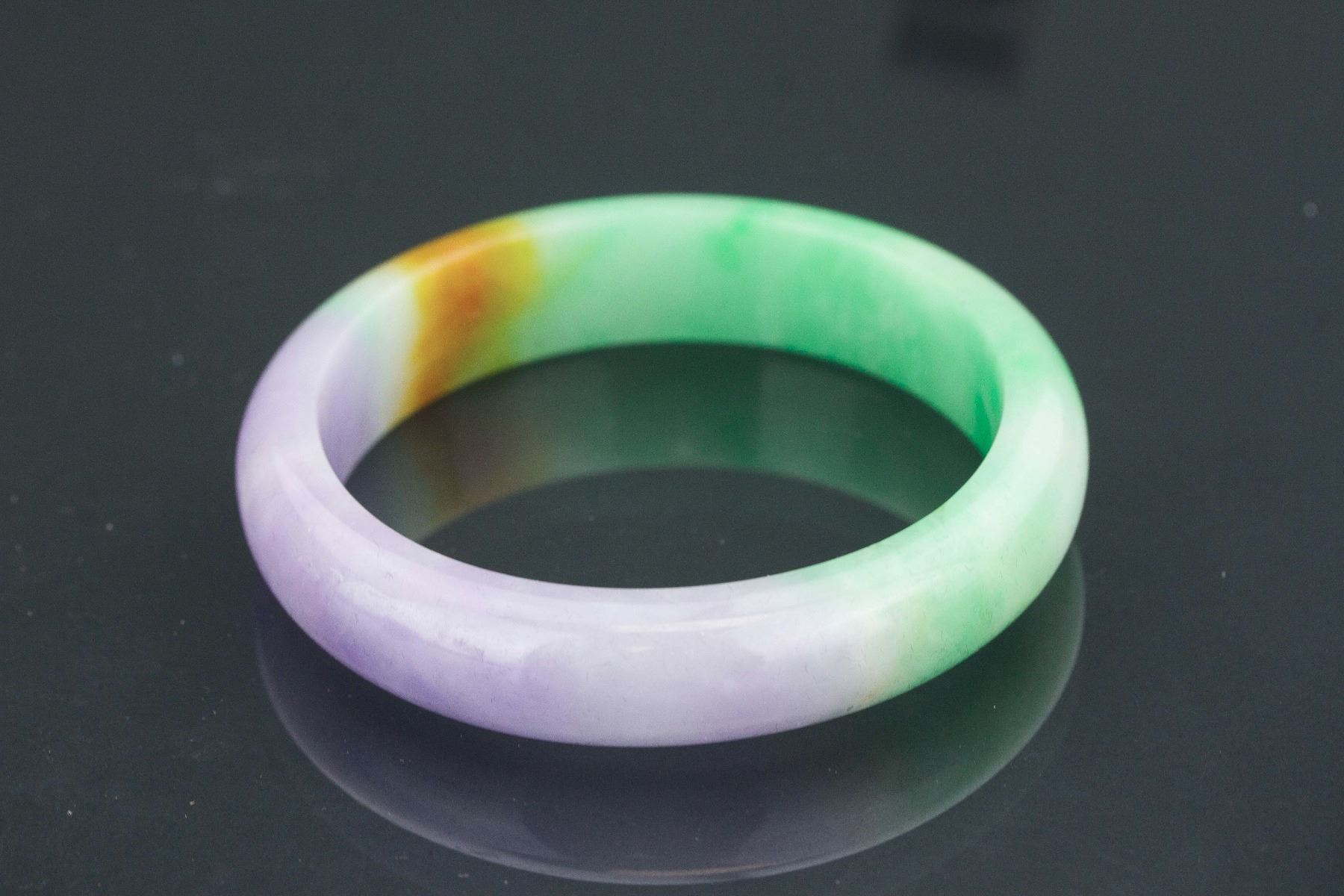 Burma three toned jadeite bangle; rounded outside and flatten inside; of mixed green, russet and purple tone; D: 7.25 cm, Inner D: 6 cm, 60 grams, Density: 3.22