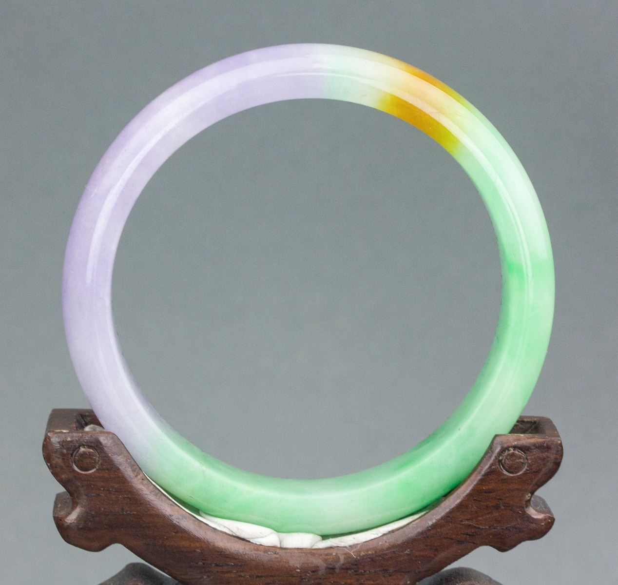 Burma three toned jadeite bangle; rounded outside and flatten inside; of mixed green, russet and purple tone; D: 7.25 cm, Inner D: 6 cm, 60 grams, Density: 3.22