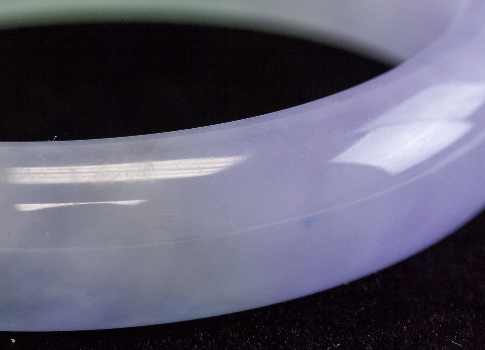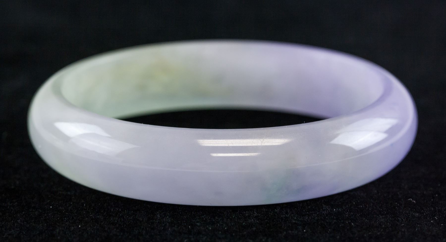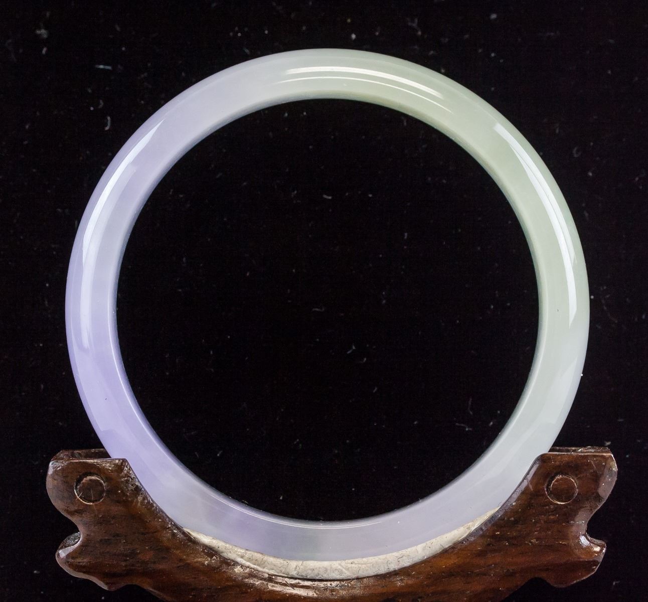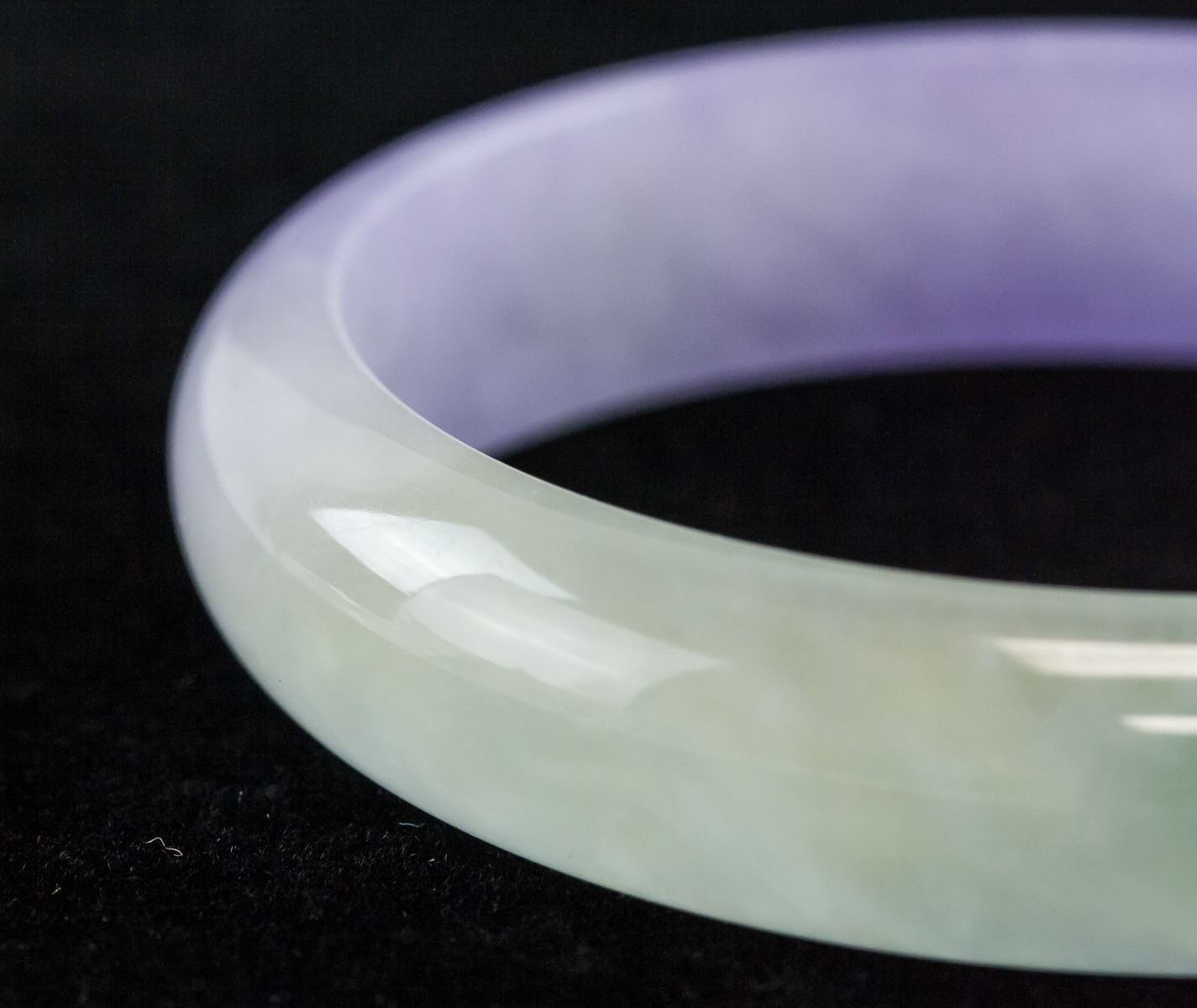 Burma two-color jadeite carved bangle. Of round outside and flat inside. Of mixed green and lavender tone. Density: 3.29, 50.09 grams