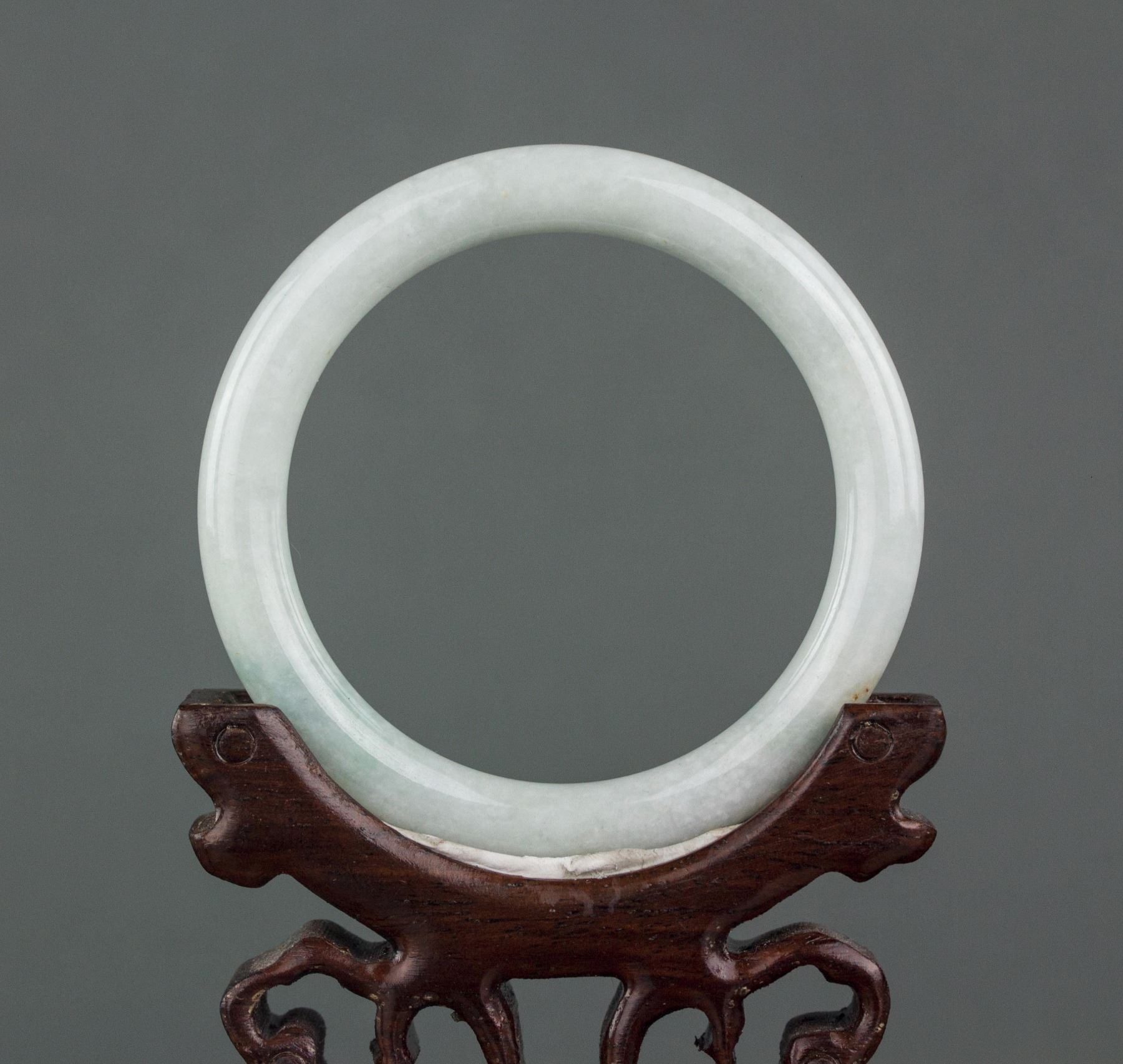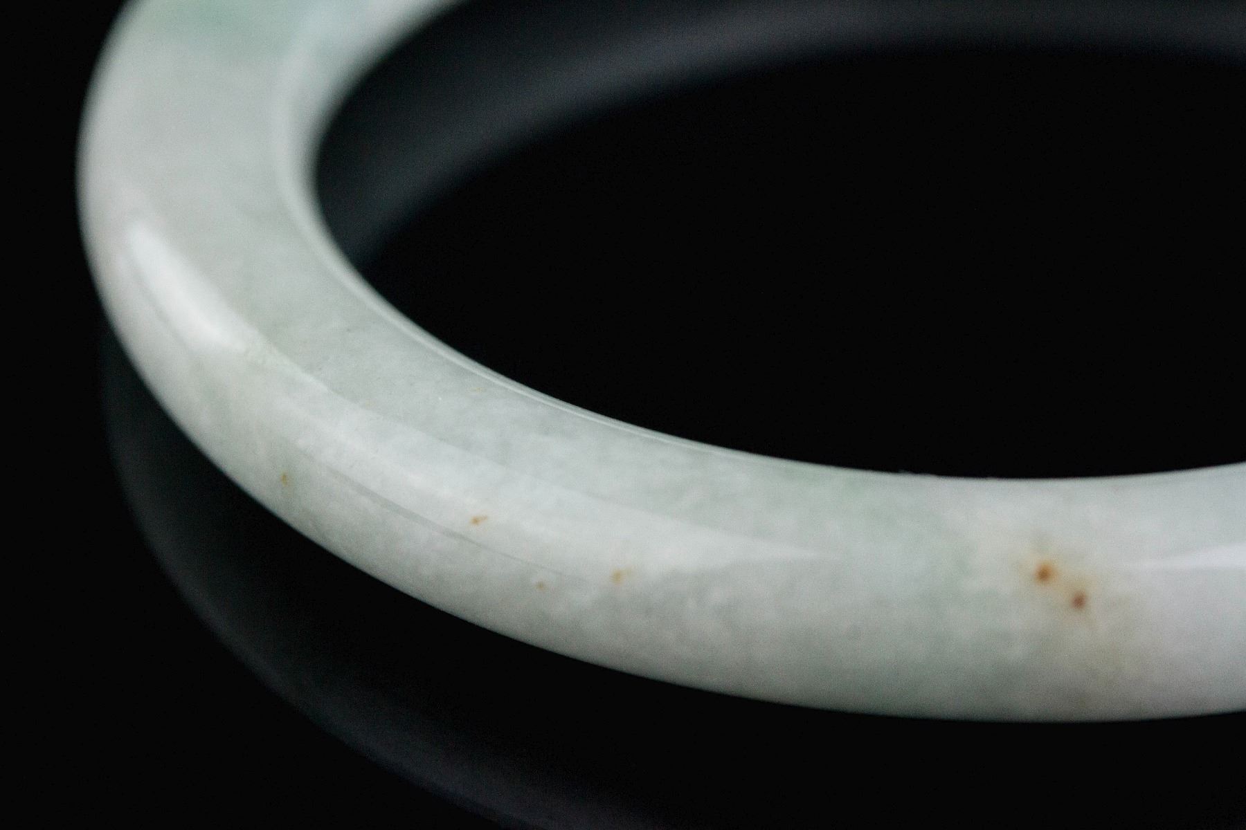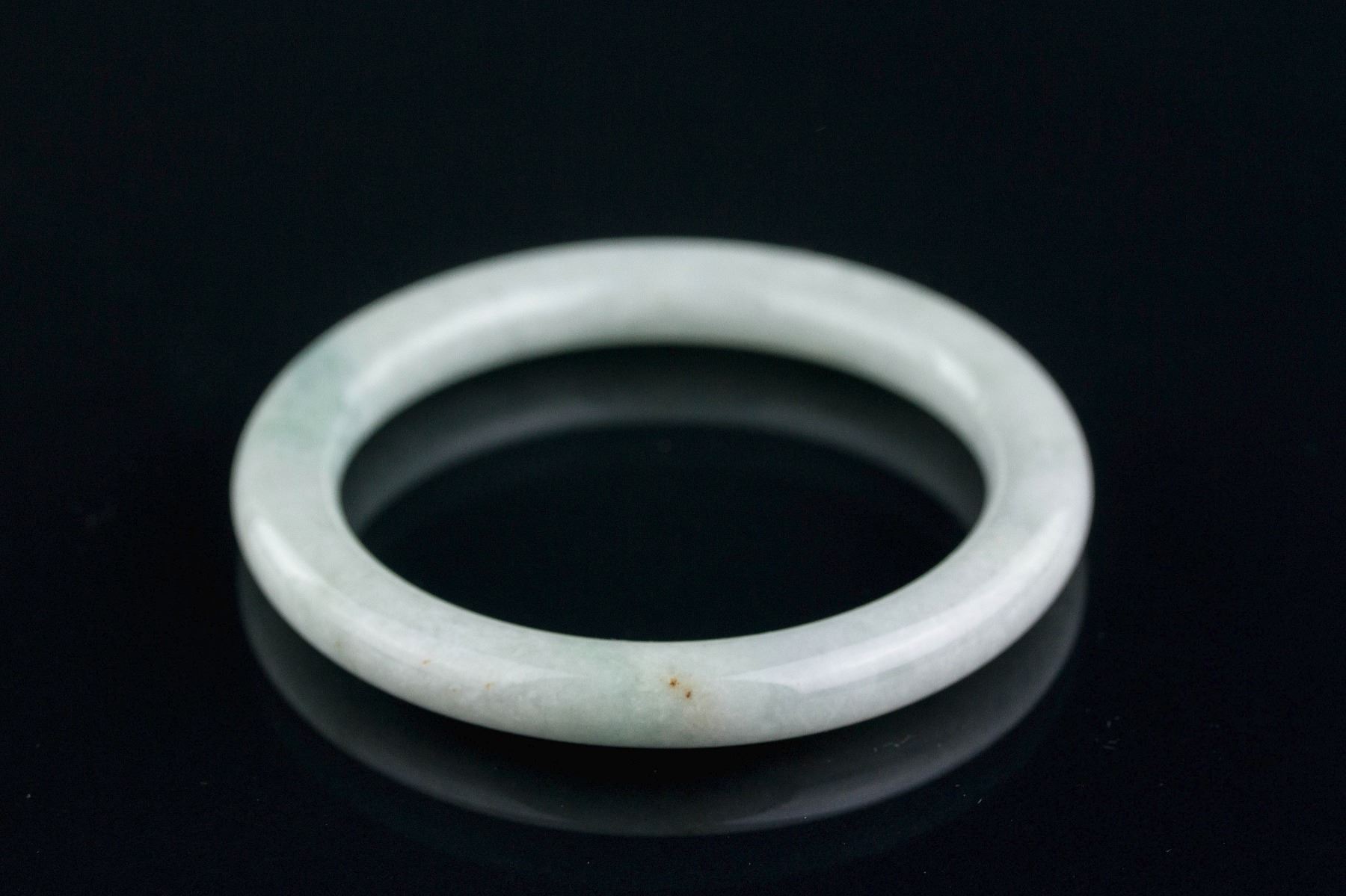 Burma white jadeite carved bangle; of rounded outside and inside; of milky white tone; D: 5.7 cm, W: 0.7 cm, 42 grams, Density: 3.30