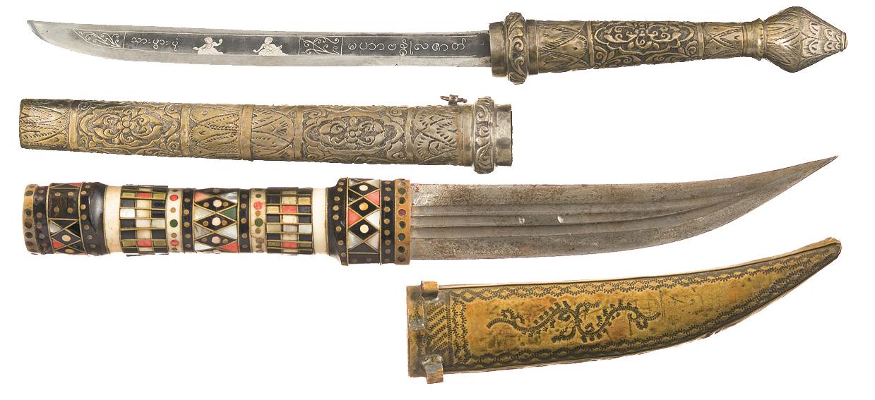 1) 11-1/4 inch blade with the center engraved with simple patterns and Buddha-like figures on a black background. Brass fancy raised engraved grip with engraved ornamental pommel. Complete with fancy raised engraved brass scabbard with carrying ring. All brass had been silver plated. 2) This colorful dagger has a 6 inch triple fuller blade, with double edges and a curved tip. The hilt is constructed from discs of ebony, ivory, brass and bone, with extensive mother of pearl, brass, and semi-precious stone inlay. Copper shod wood sheath, with extensive zig-zag pattern engraving and a pair of hanging rings.