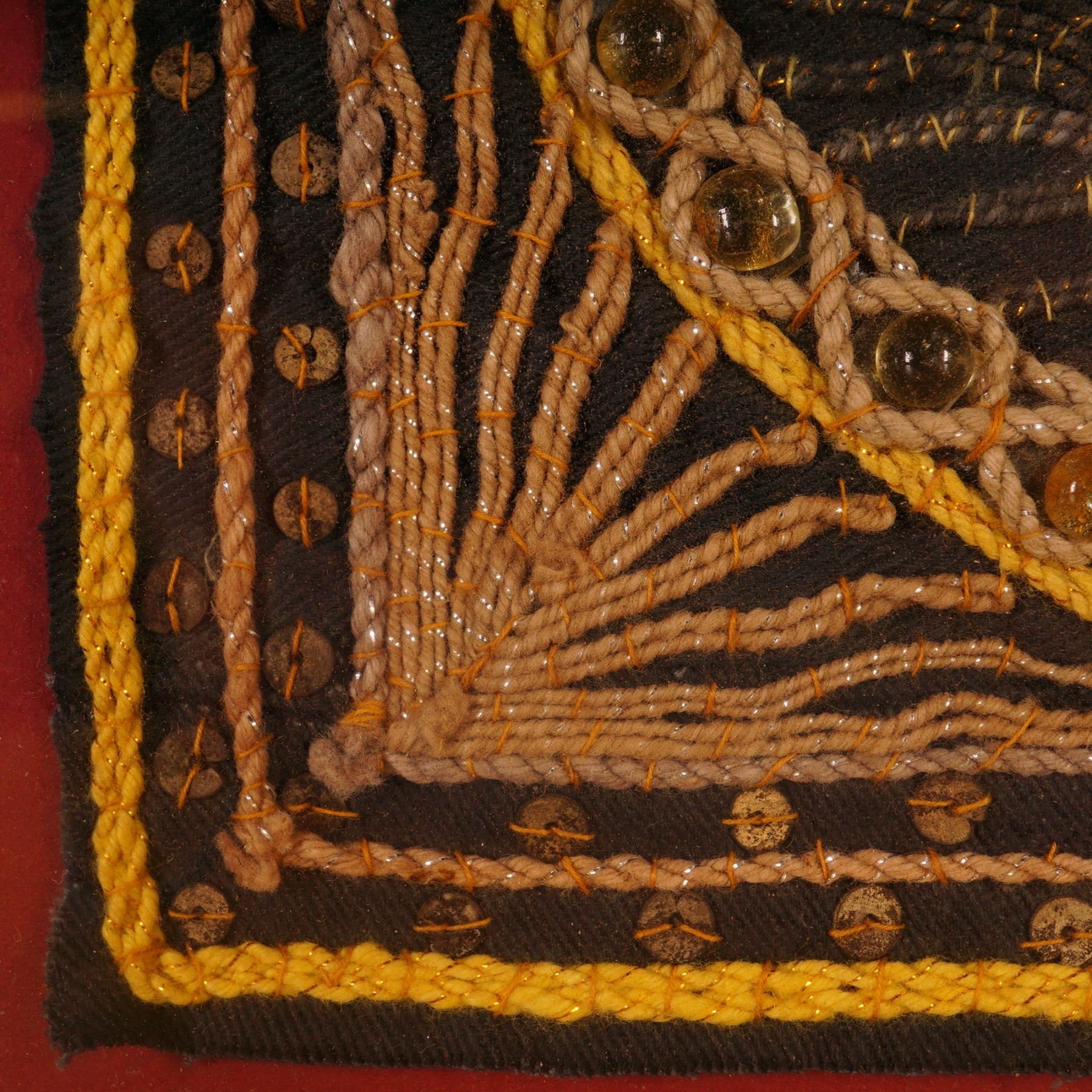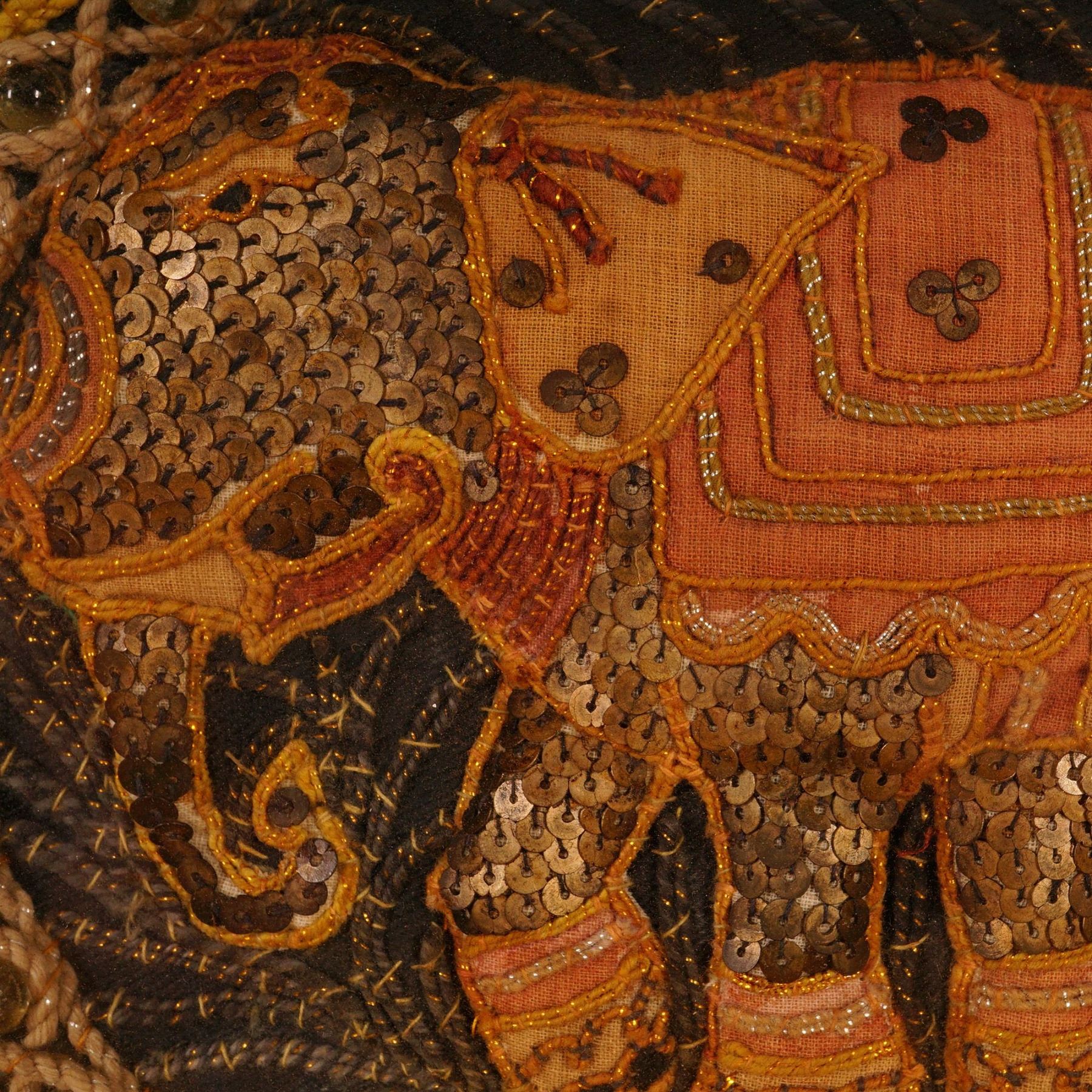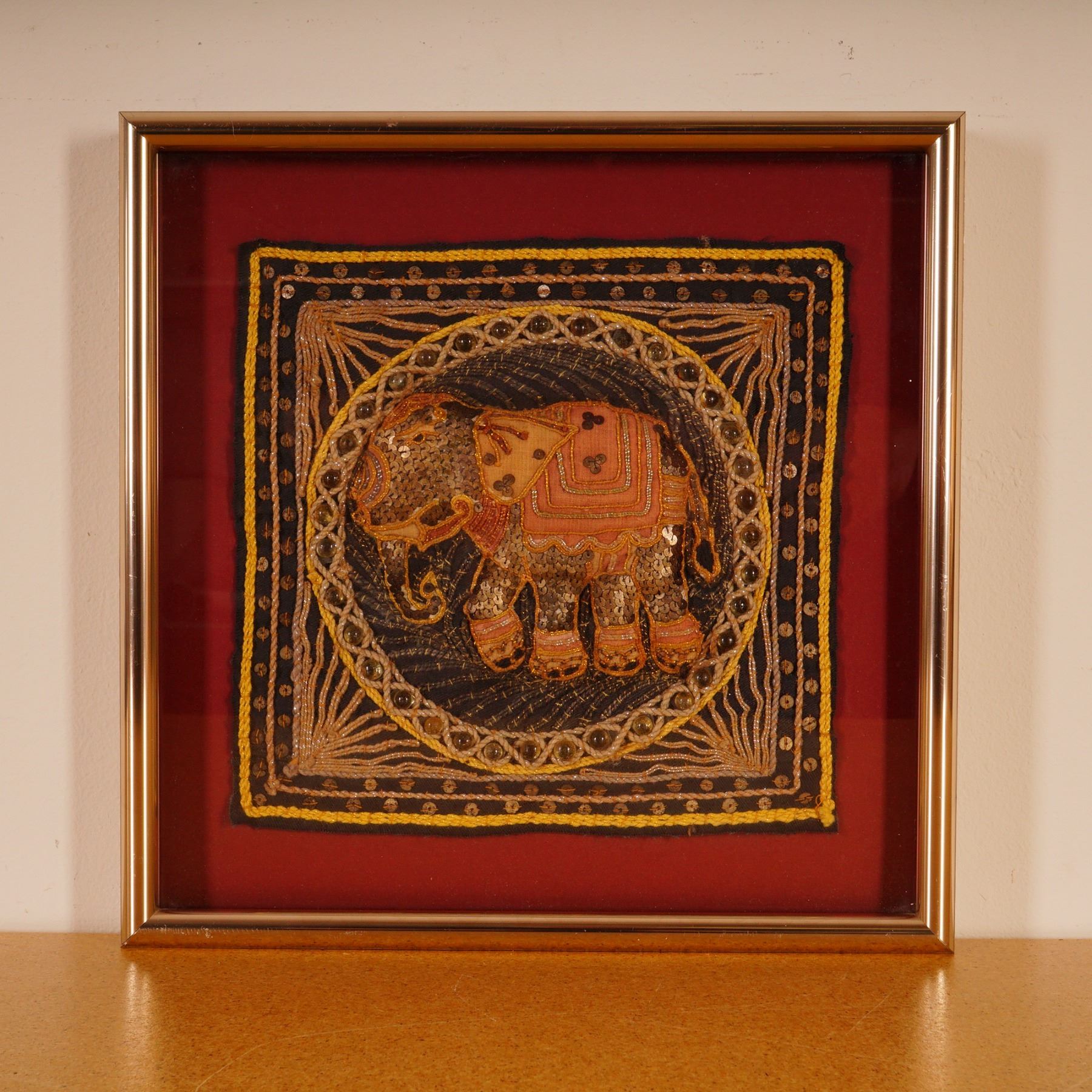 A richly detailed Burmese Kalaga tapestry panel depicting an ornate elephant adorned with gold thread, sequins, and bead embellishments. Executed in traditional applique technique on a dark fabric ground, the composition features dimensional embroidery and braided borders accented with glass beads. Mounted on a red backing and presented in a metallic shadowbox frame under glass, this work reflects the fine craftsmanship and decorative artistry characteristic of Burmese textile tradition.