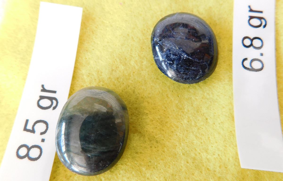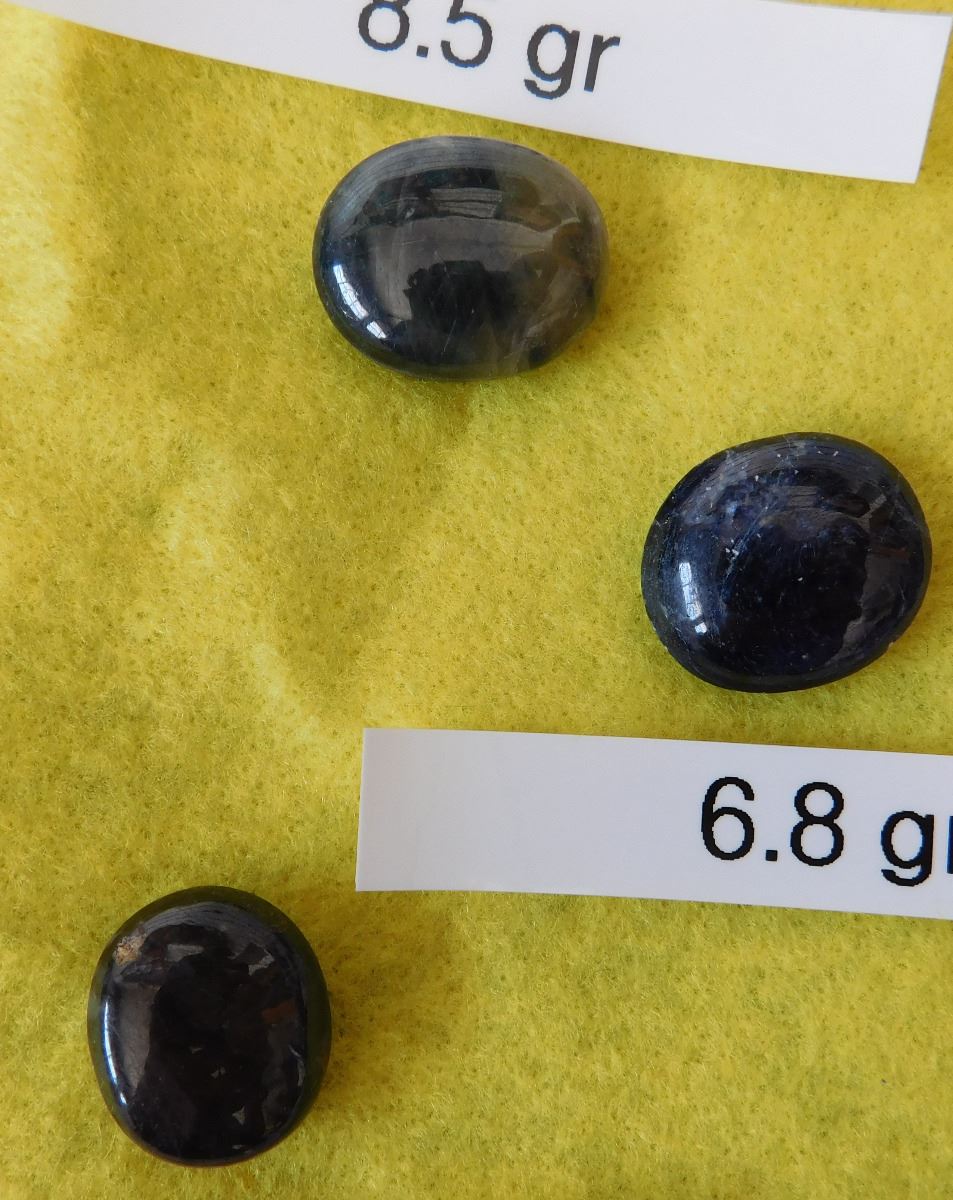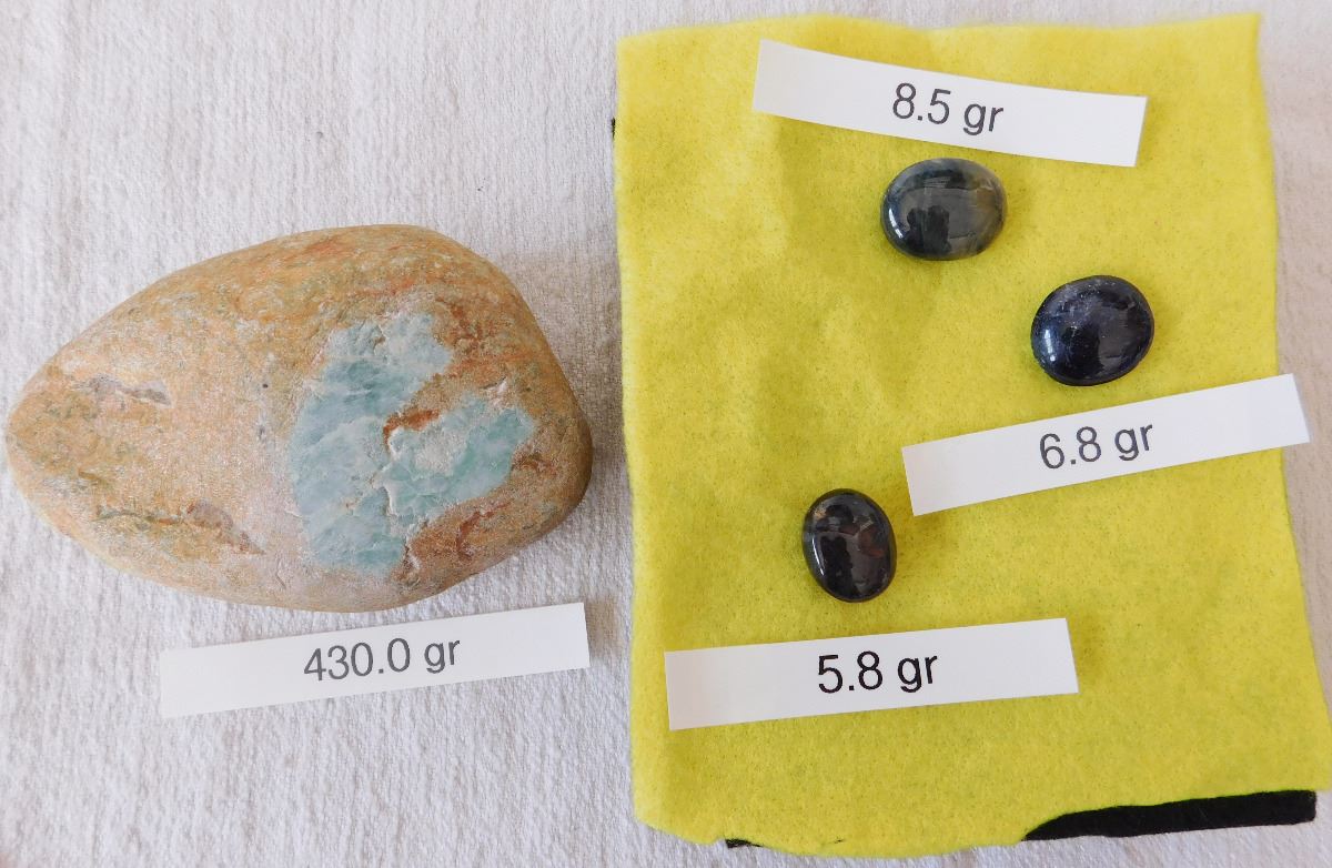 Burmese Sapphires & Jade, unknown age. High quality jade piece weighs approx 430 grams while the three sapphires weigh 8.5, 5.8 and 6.8 grams. From Burma. Sapphire cabs are ready to set! Frame not included. 5 grams per carat. Condition: Good, see images. Shipping: $20.00 w/insurance and signature.