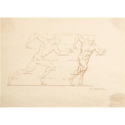 Burne Hogarth, perhaps best remembered for his vision of Edgar Rice Burroughs' Tarzan, was also a renowned art teacher. In addition to co-founding the Cartoonists and Illustrators School in 1947 (later renamed the School of Visual Arts, or SVA, in 1956), Hogarth also wrote and illustrated a series of highly influential drawing books such as <B>Dynamic Figure Drawing</B></I>, <B>Dynamic Anatomy</B></I>, <B>Drawing Dynamic Hands</B></I>, and others. This sepia ink on vellum illustration titled, "The Principle of Projecting the Side View Figure to Achieve the Foreshortened Figure," demonstrates the effects of foreshortening on figure drawing and was inscribed to cartoonist Guy Gilchrist. The faded inscription at the lower right reads, "To Guy Gilchrist -- all good thoughts, Burne Hogarth." This piece was matted to an overall size of 20" x 15.5". Aside from some staining in the upper and lower right corners and the faded inscription, the art is in Very Good condition.<BR><BR><b>Shipping:</b> Large Flat (<a target="_blank" href="http://www.heritageauctions.com/common/shipping.php">view shipping information</a>)