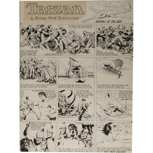 <B>Burne Hogarth - Tarzan Sunday Comic Strip Original Art, dated 5-26-40 (United Feature Syndicate, 1940). </B></I> It seems hard to believe today, but when the idea of a comic strip based on Edgar Rice Burroughs' famous jungle hero, Tarzan, was first pitched to the newspaper syndicates, no one was interested. It took the involvement of a first class artist, Hal Foster, to sell the strip, which then wasted no time becoming one of the most popular comic strips around. For many, though, the peak period of this strip began in 1937, when a former art teacher named Burne Hogarth began drawing the feature. Hogarth's command of composition and dynamic movement of form was like no other artist working in comics at that time. His art stands out today for its expressionistic vision and symbolic interpretation of nature. This action-packed episode pits the Ape-Man against some fierce gladiators, and includes an encounter with a number of scary-looking "demon fish." This spectacular Sunday has been framed to an overall size of 29" x 36", and the art is in Excellent condition. <BR><BR><b>Shipping:</b> Framed - with Glass, Large (<a target="_blank" href="http://www.heritageauctions.com/common/shipping.php">view shipping information</a>)