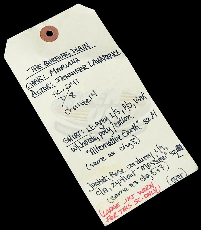 (Magnolia Pictures, 2009) This jacket was acquired by the production for use by Jennifer Lawrence as "Mariana". The size large corduroy jacket features minor wear from use and comes with a production used costume tag detailing the entire outfit, change, and scene numbers used.