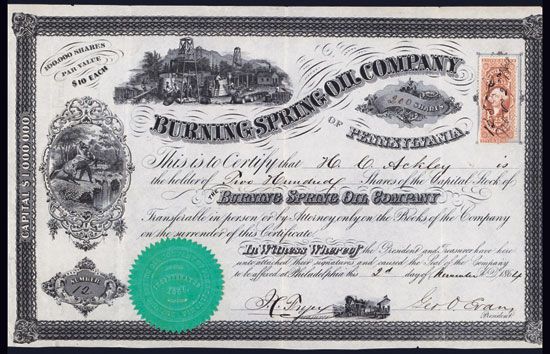 Pennsylvania, 1864, 200 Shares, Issued and Uncancelled Stock, #12, Black print with black border and green seal bottom left, Vignette of early oil rig operation top left with man taming horse mid left, VF-XF condition.