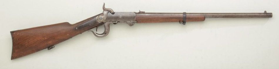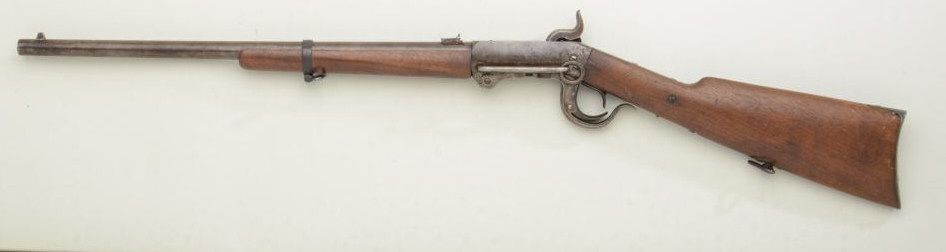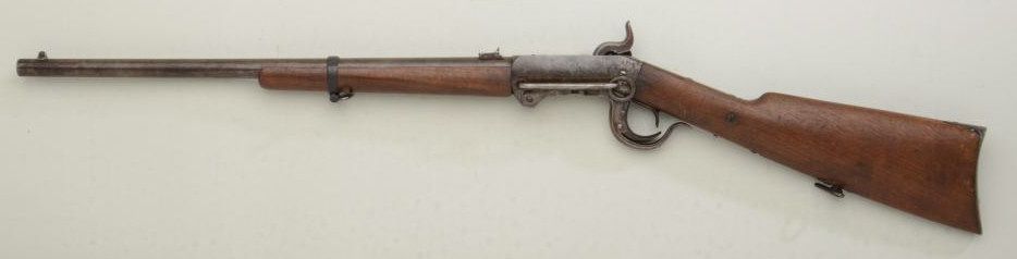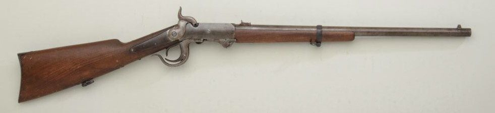 Burnside .52 cal. breech loading Civil War carbine in fair to good original condition, serial #37381. The metal surfaces show a gray to brown patina with scattered light to moderate erosion and pinprick pitting. Theforend is an old handmade replacement, the butt stock shows an old repair, light refinish, and is otherwise good. The hammer shows some cleaning and coloring to remove pitting. The action is good, the bore isvery good; the markings are clear, correct sights, small parts retained. Est.: $500-$1,000