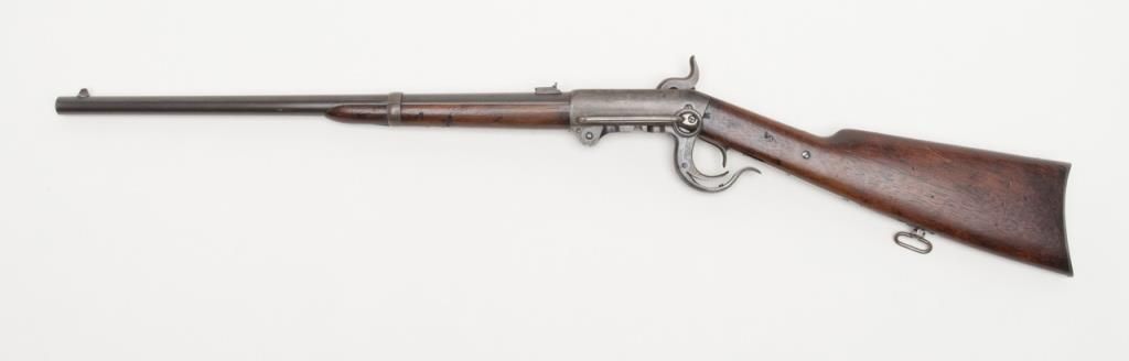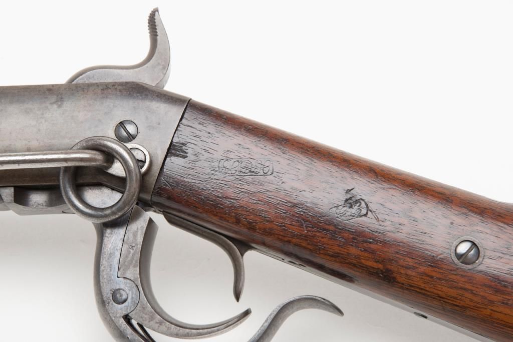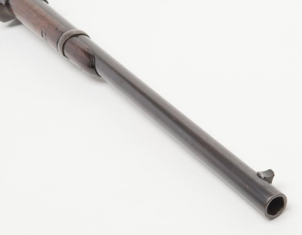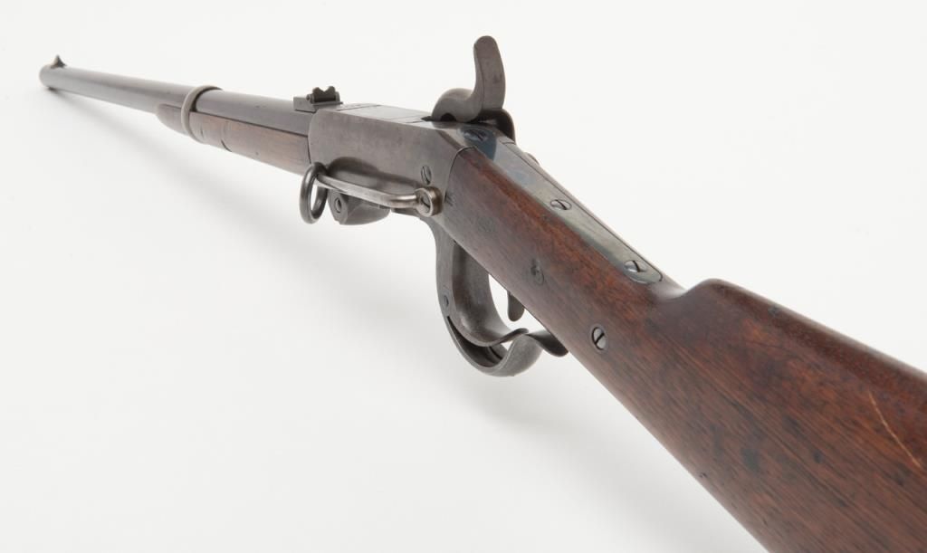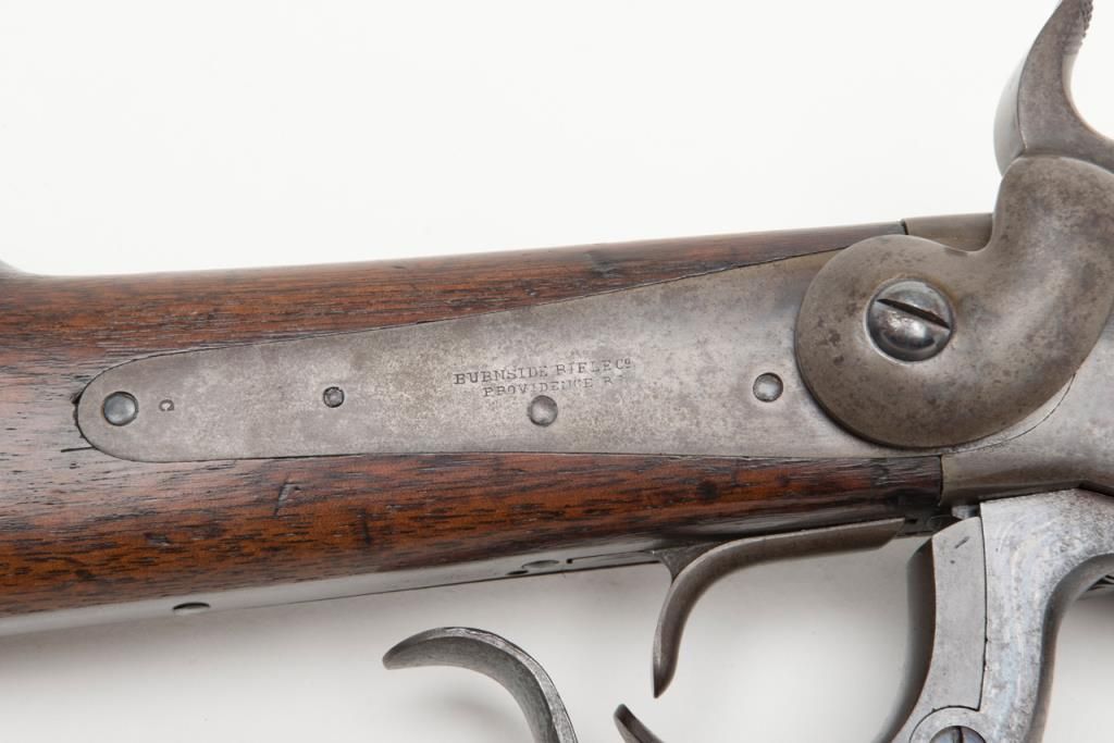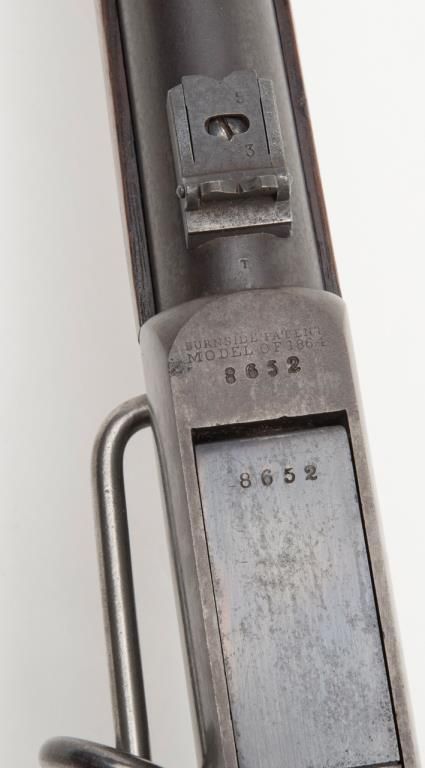 Burnside 5th model, .54 caliber percussion carbine in near fine original condition, serial number 8652. The barrel retains 70% to 80% original blue starting to plum and age naturally. The frame shows 30% to 50% case hardening drifting to asilvery gray and brown with some colors mixed in. The tang, breech , lever and some small parts show bright and minty blue. There is some minor erosion and pinprick pitting just starting. The markings are sharp. The wood is very good pluswith two mostly visible cartouches. There are some gouges in the forend and some minor marks in the butt stock. The action works well and the bore is excellent. This carbine saw little to no use. An honest 8 ½ on a 1 to 10 scale. Est.: $1400-$2800