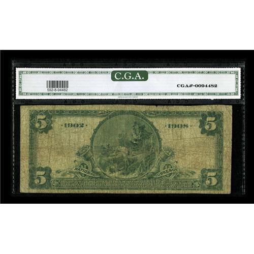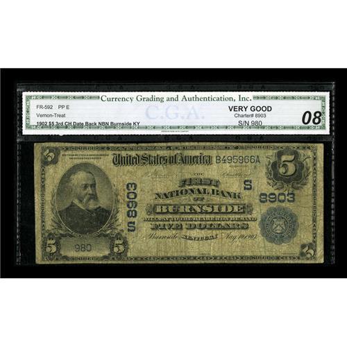 <B>Burnside, KY</B></I> - $5 1902 Date Back Fr. 592 <B>The First NB</B></I> Ch. # (S)8903<BR>From our sale of the Bill Gale Collection where the description read, "This is a very rare bank in large size, with the Gale collection containing two of the three known large examples from here. This well circulated but intact <B>Very Good</B></I> example is no prize for grade, but it's significantly better than the only other reported Date Back, which was in the Martin collection and makes this specimen look like a gem by comparison." This note has found its way into a <B>CGA Very Good 08</B></I> holder since that sale.<BR><BR><b>Shipping:</b> Coins & Currency (<a target="_blank" href="http://www.heritageauctions.com/common/shipping.php">view shipping information</a>)
