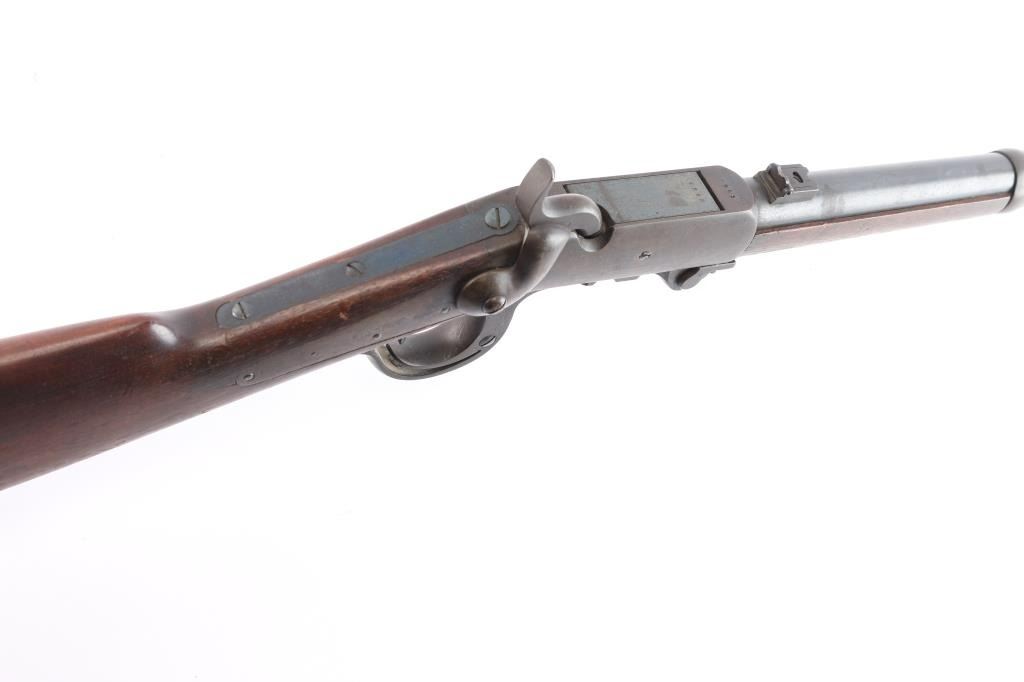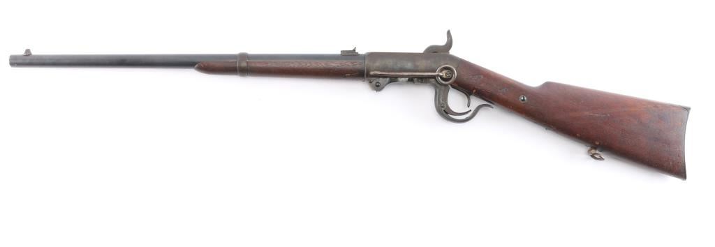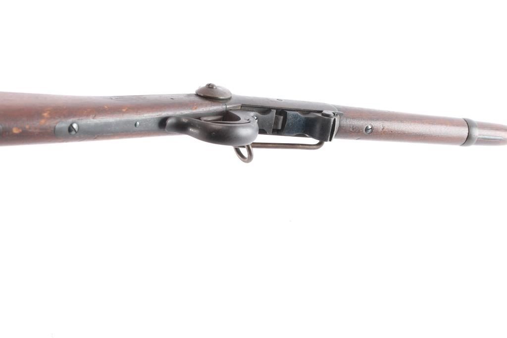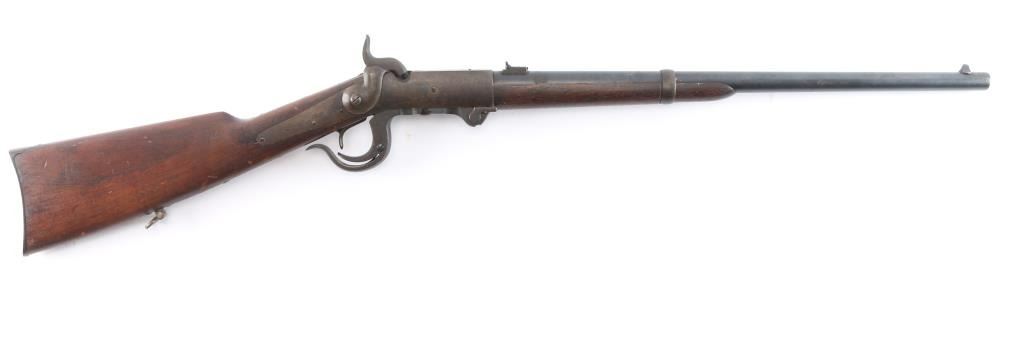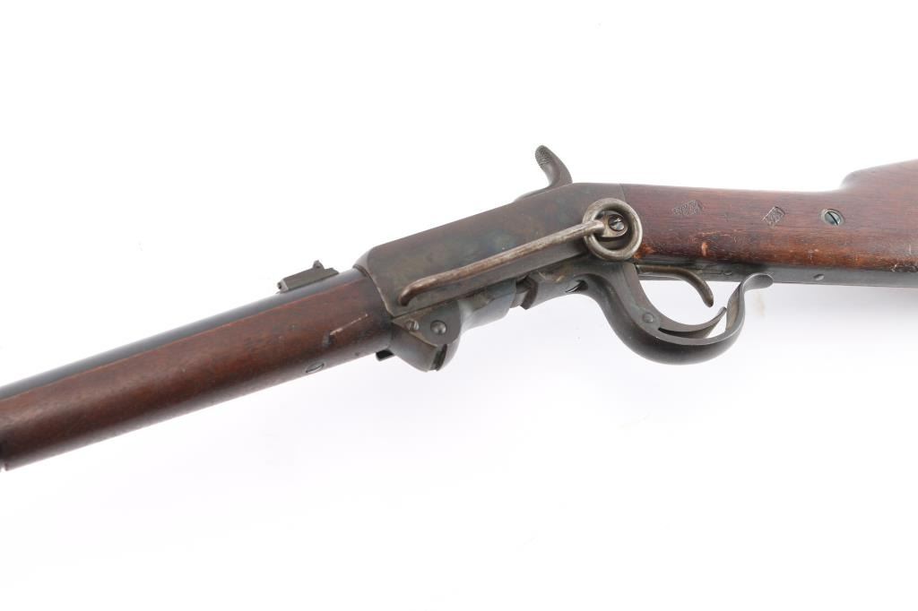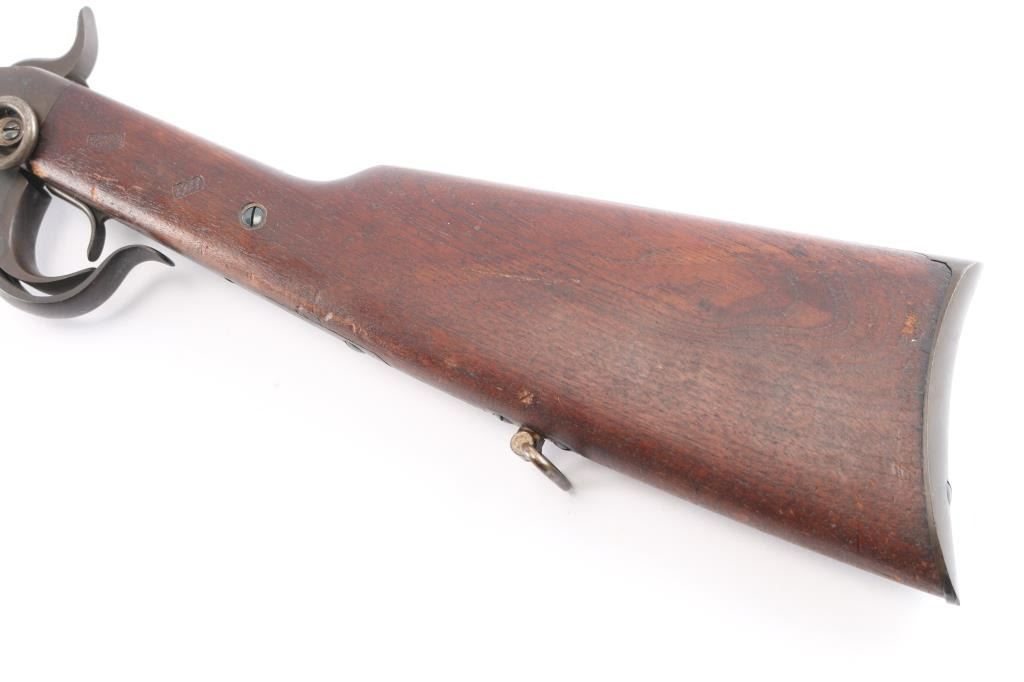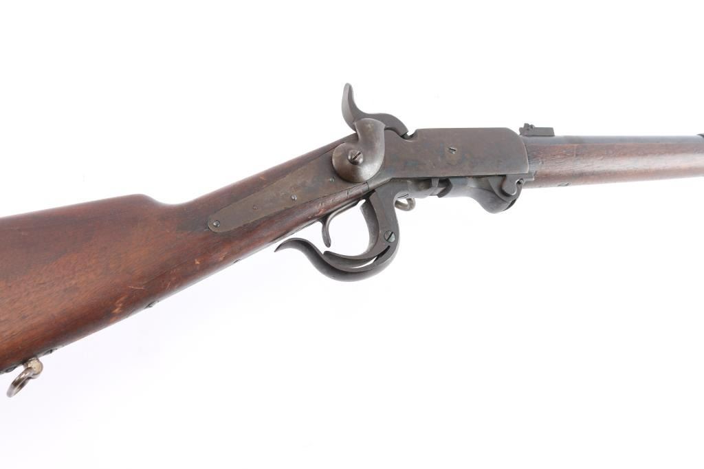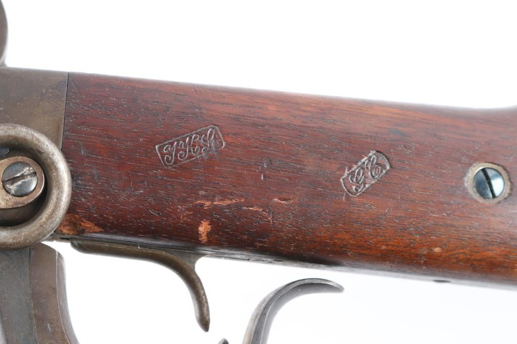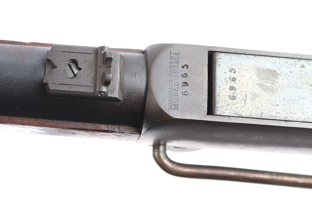 U.S. Civil war Burnside single shot percussion carbine, Model 1864, aka "5th model". It is a .54 caliber carbine manufactured by the Burnside Rifle Co., in Providence, Rhode Island. Single Shot, Rotating Block, Breech Loaded Percussion carbine. Lockplate marked "BURNSIDR RIFLE Co / PROVIDENCE RI"; top of frame is marked "BURNSIDE PATENT / MODEL OF 1864". 21" barrel with dovetailed front blade, rear sight presents a “V” notch in the down position and when flipped up gives a “V” notched aperture for 300 yard and an additional 500 yard notch. Saddle ring, sling swivel and various inspector letter stamps. There are two cartouches on the left wrist; "GC" (arsenal sub-inspector George Curtis) and "TKL" (Thomas K. Laley) . "GC" is also stamped in small block letters on the underside of the forearm. Original dull blue finish is about 60%, mostly on the barrel, upper tang, screw heads and breech block, the receiver and lock plate are mostly a brown patina with traces of the original case colors. matching serial number on receiver & breech block, markings and cartouches are clear. The bore is overall very good/bright with good rifling with a couple of patches of light pitting, the action is smooth and the wood is good/sound with scratches/dings, there are a couple of small chips on the left wrist where it meets the receiver. Nice condition for a Civil War carbine.