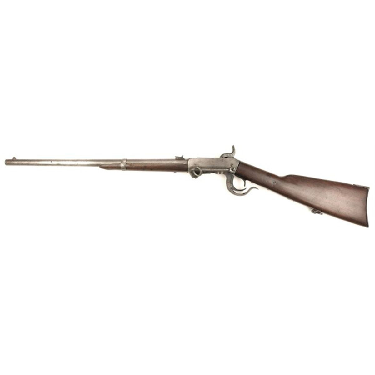 Burnside Model 1864 Carbine .54 cal. SN 19215 early production, good bore, visible case colors remain on the breech block and receiver which show some scattered pin prick pitting, Gray patina on bbl which exhibits correct front and rear sights, saddle ring intact, wood appears to have been lightly sanded and oiled with no visible cartouche, original butt plate show scattered erosion, overall condition good to very good. NO FFL required.