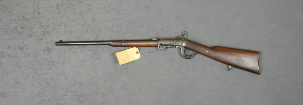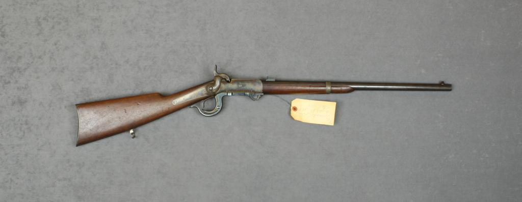 Burnside lever action SRC, .54 cal., 21” round barrel, blue and case hardened finish, wood stocks, #12862. This gun is in overall excellent condition showing the majority of its original blue finish on the barrel,approx. 98% original case colors on frame, lock plate, hammer and butt plate, bright niter blue on lever and lower tang, mirror bore, crisp action, very good markings, fine wood stocks with scattered nicks and marsfrom storage, two cartouches on left side of butt stock. One of the crispest Burnsides we have seen in some time. Est.: $2,000-$4,000.