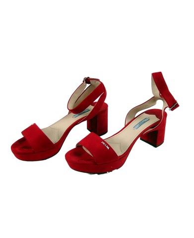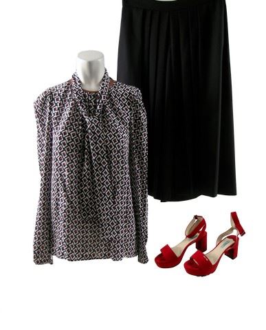 Simone Forth (Uma Thurman) screen worn, hero, red, black, and white long sleeve with diamond spot print and tan leather trim at the cuffs and neck 'Prada' blouse, (size 42) large dark silver and diamante joined finger ring, black crepe cropped leg culottes 'COS' pants, (size 12) and bright red suede 'Prada' sandals with chunky heels. (size 9)