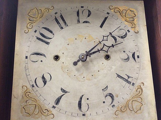 Burr & Chittenden Mahogany Looking Glass Shelf Clock, Lexington, Mass, with very uncommon groaner movement. Wooden works, stenciling at top and columns, full mirrored door, has nice beehive stenciling at top and bottom of columns, nice original weights and pendulum, keys, original dial with American sheild painted in all for corners in gold gilt, open diamond hands, striking bell at top of case.
